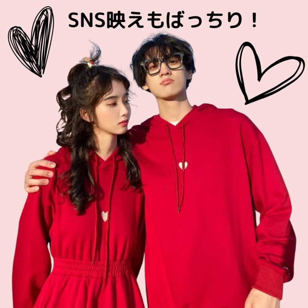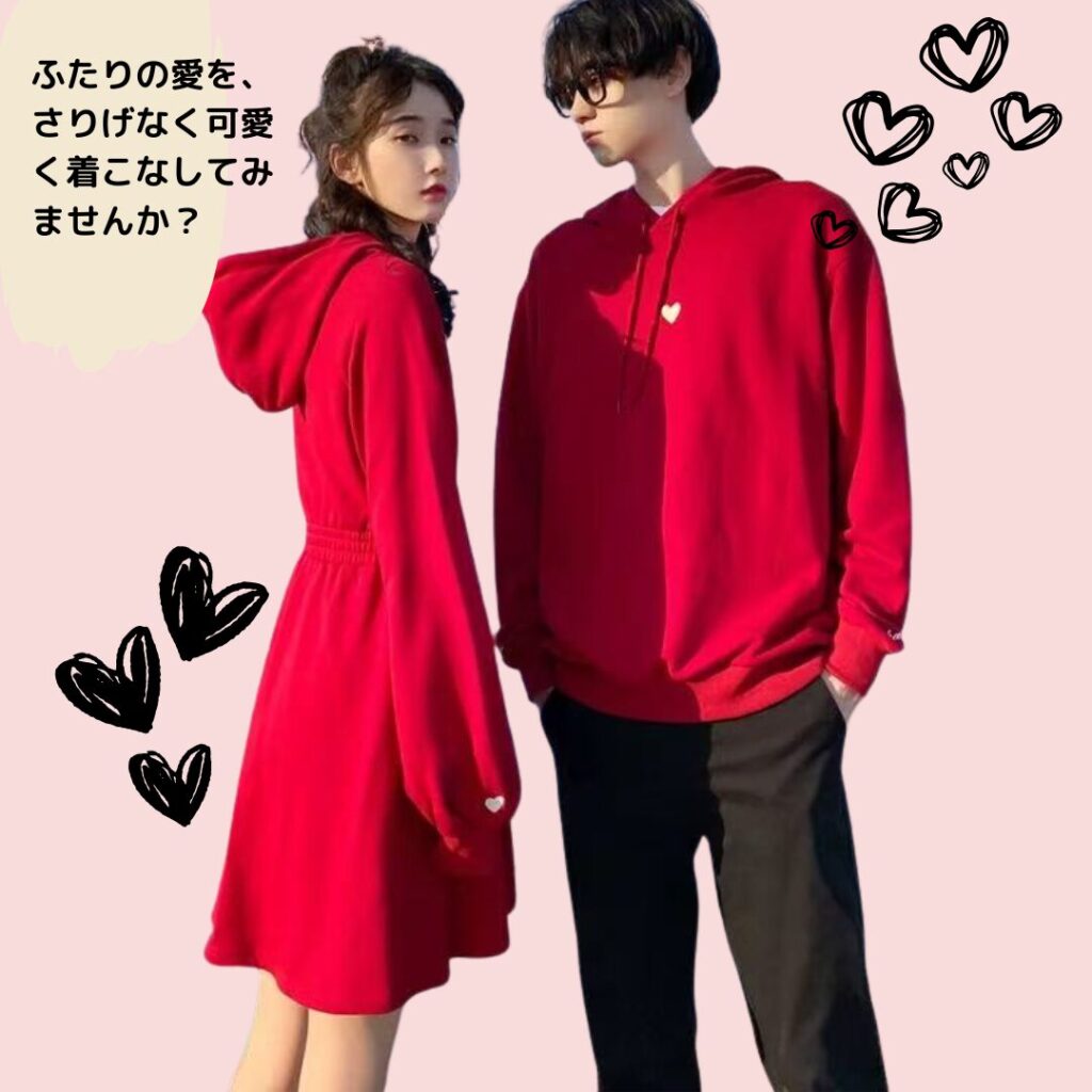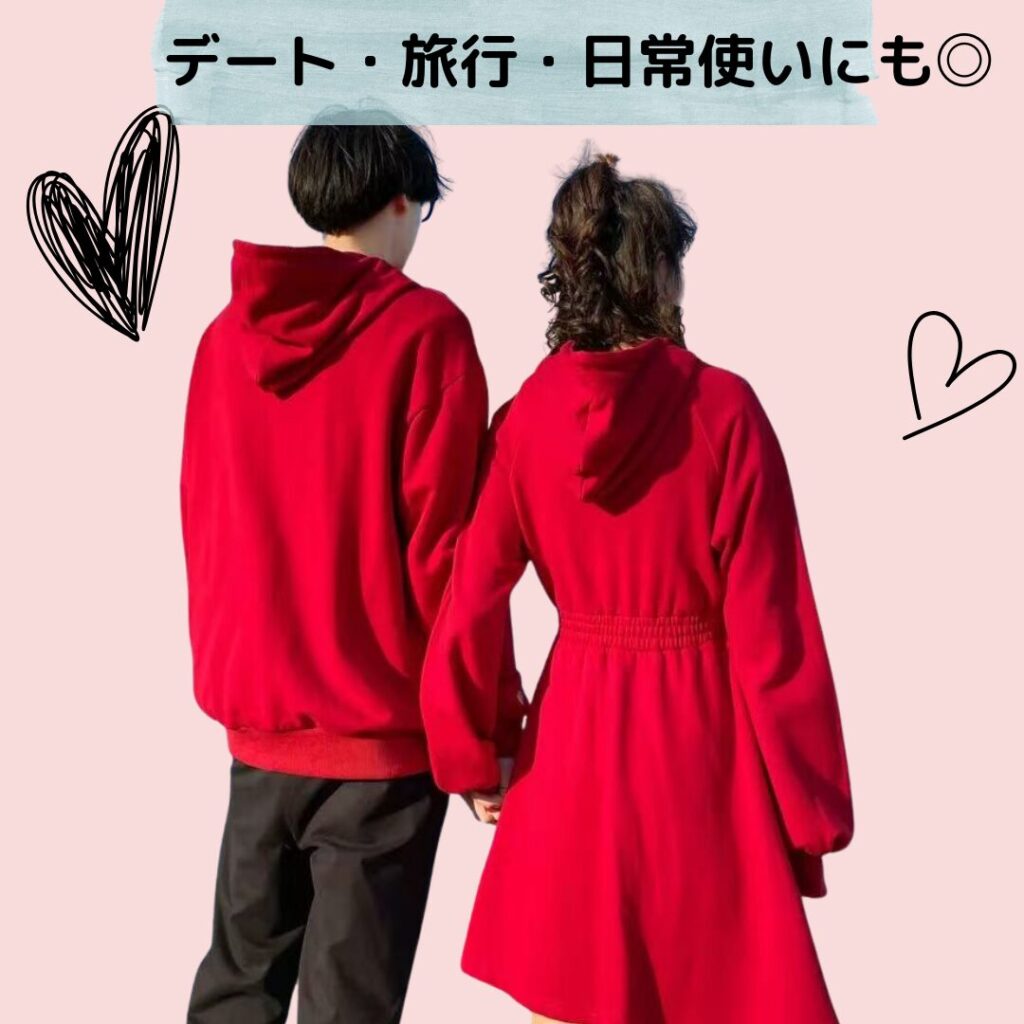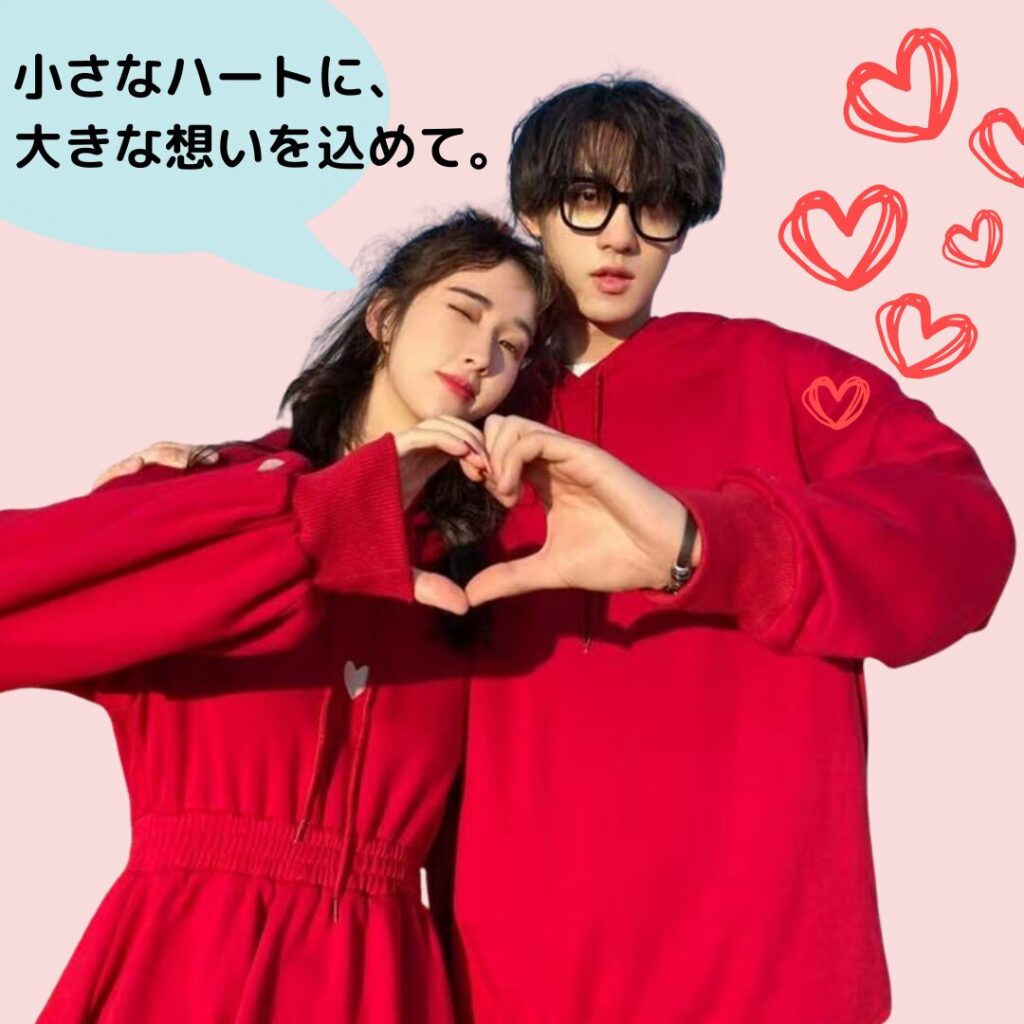 ペアルック パーカー&フレアワンピースは、中央の小さなハートマークがふたりのつながりをさりげなく表現するアイテムです。鮮やかな赤色で、街中でも写真でも存在感を放ちます。メンズは着回ししやすいカジュアルなパーカー、レディースは一枚でコーデが決まるワンピースタイプです。シルエットの違いを楽しめる、リンクコーデに最適なセットです。