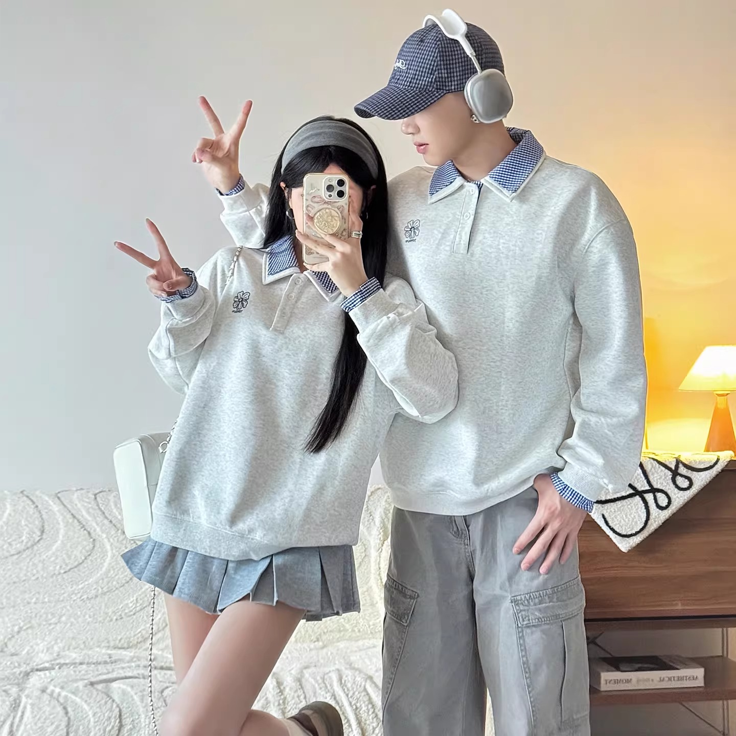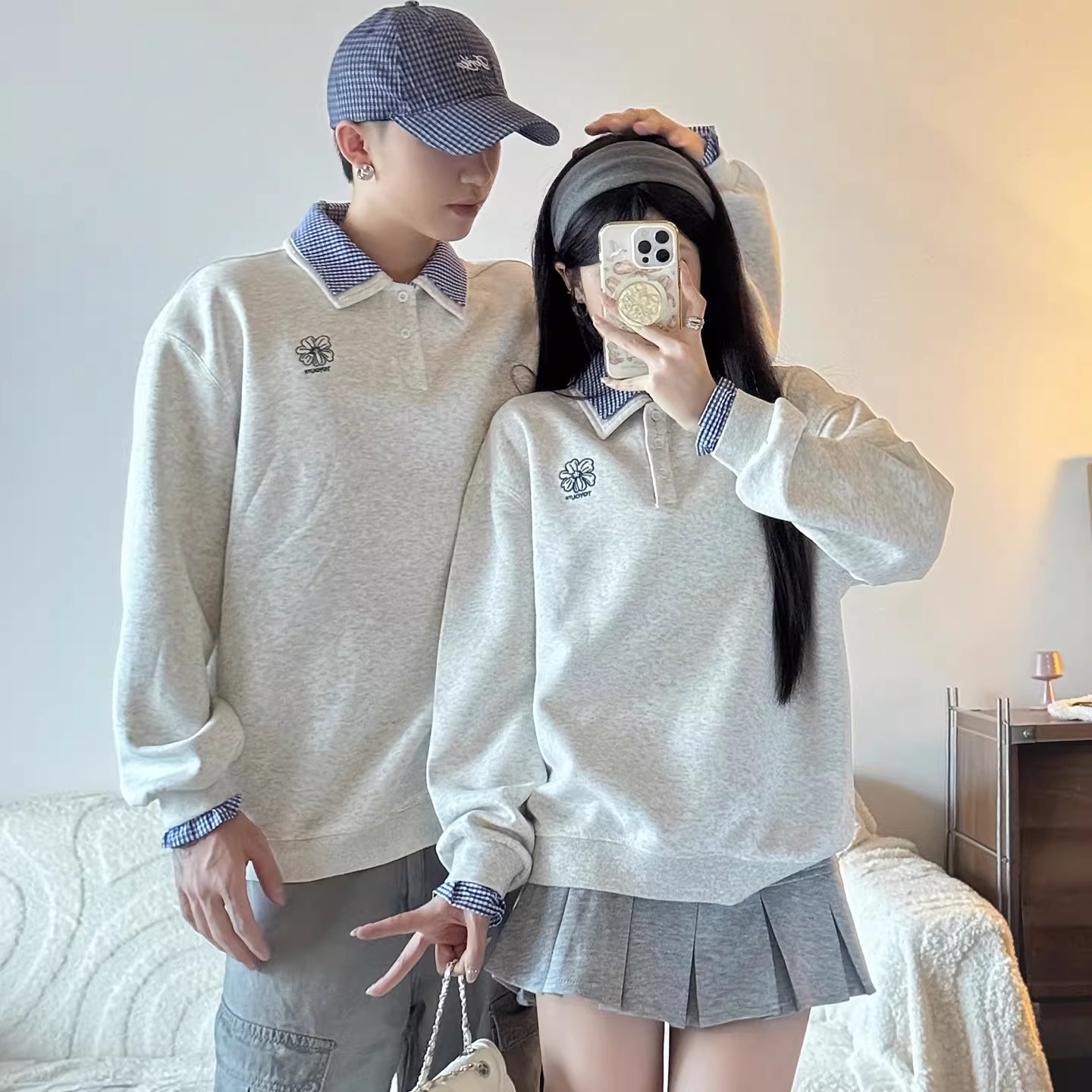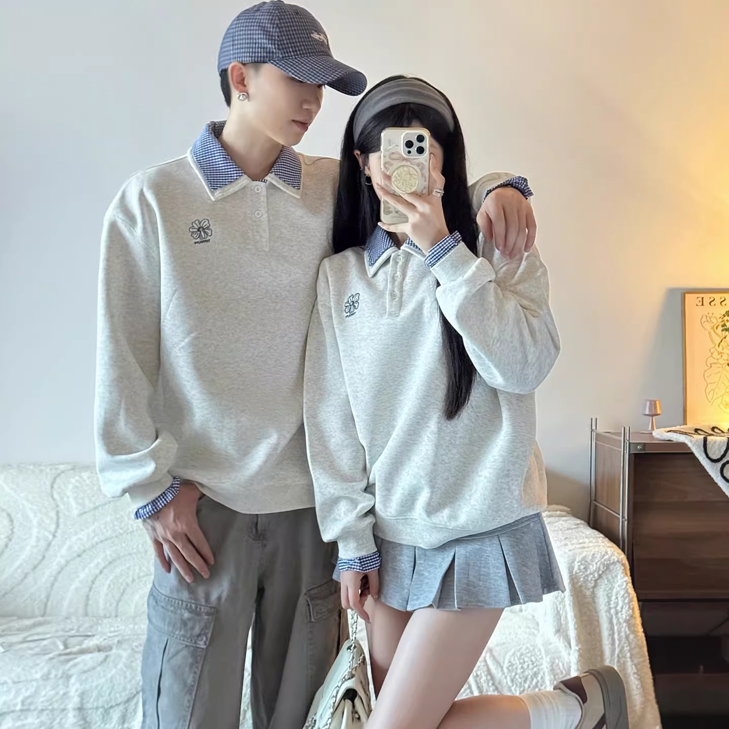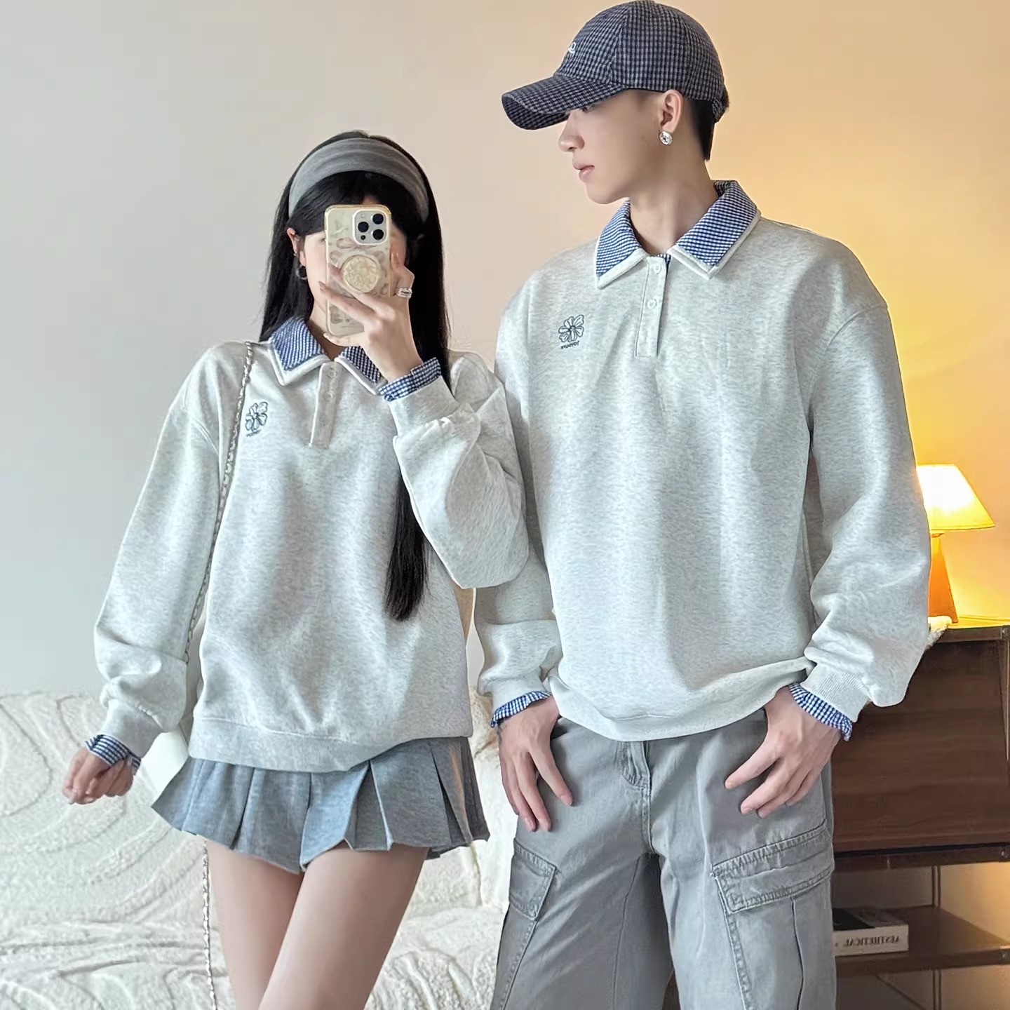 さりげないお揃い感が大人かわいい、襟付きデザインのカップルペアルックスウェット。やわらかな杢調カラーをベースに、襟元と袖口からのぞくチェック柄がアクセントになり、1枚でレイヤード風のこなれた着こなしが完成します。 カジュアルすぎず、きちんと感もあるため、デートやお出かけはもちろん、写真映えも抜群。程よくゆとりのあるシルエットで、体型を選ばずリラックスして着用できます。 男女ともに取り入れやすいデザインなので、パンツにもスカートにも相性◎。リンクコーデ初心者の方でも挑戦しやすく、「さりげなくお揃い」を楽しみたいカップルにぴったりの一着です。