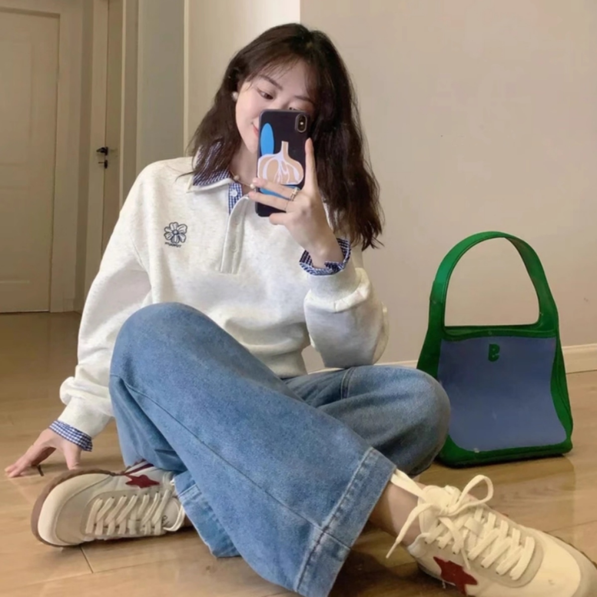 カップルペアルック フラワーポイント 襟付き レイヤード風スウェット