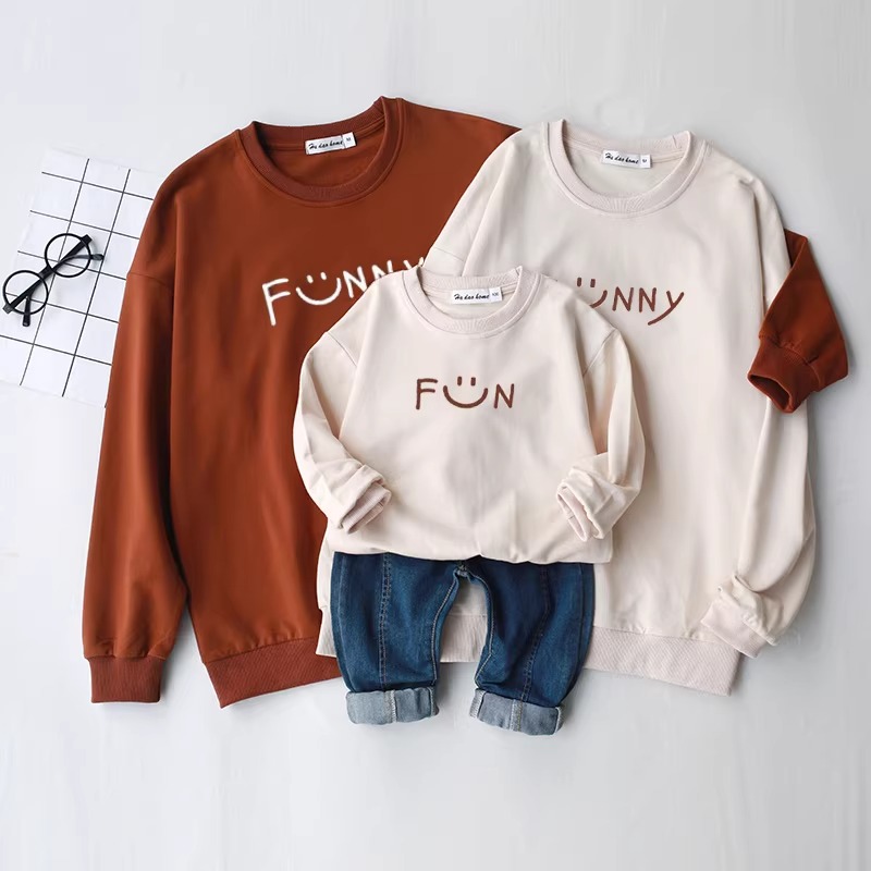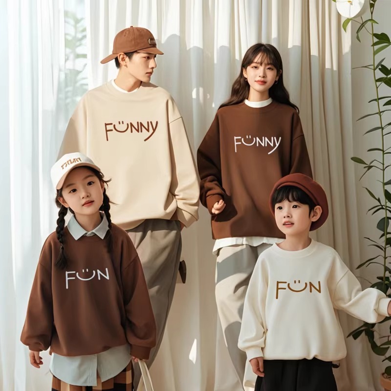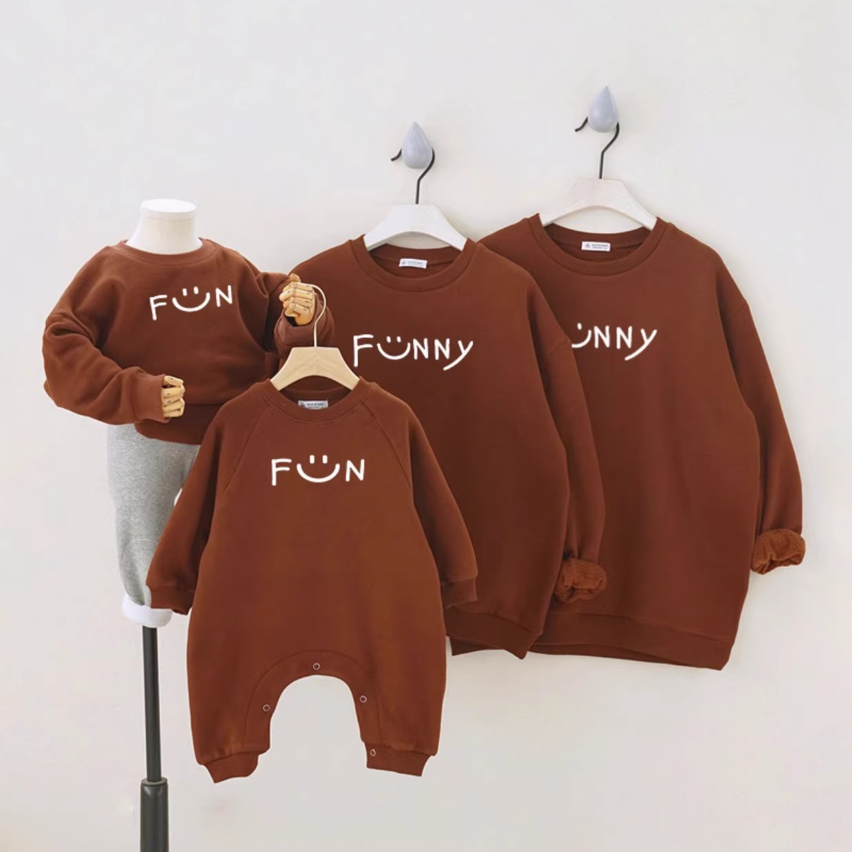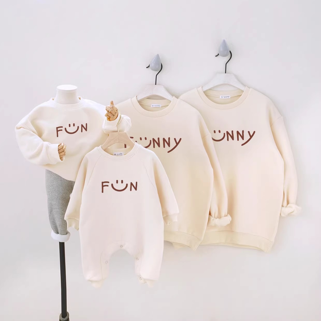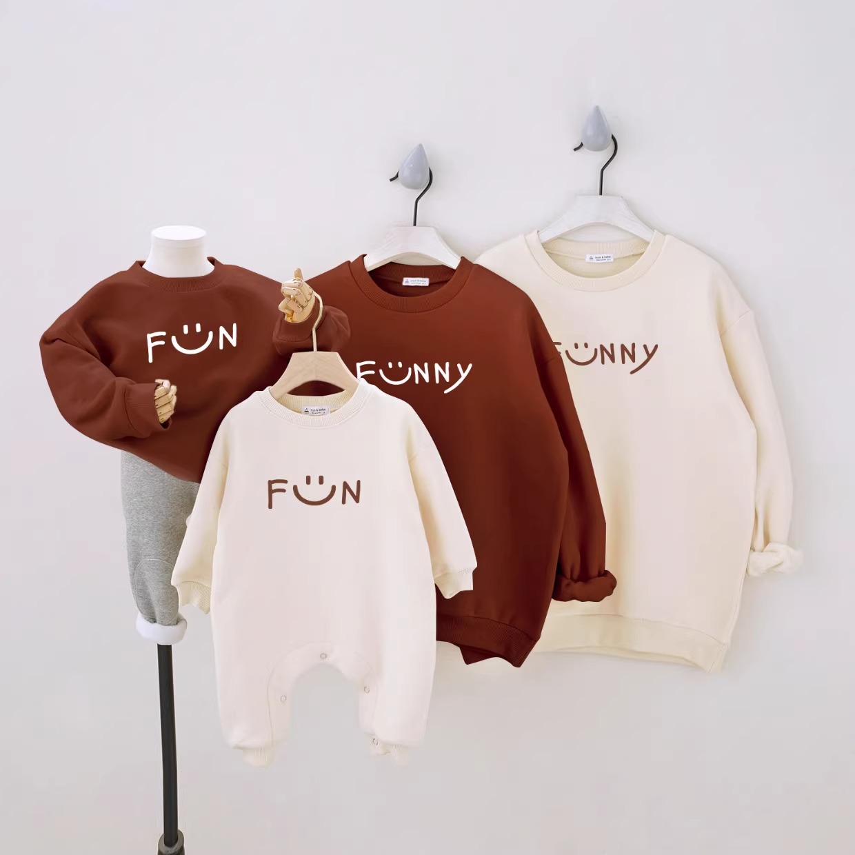 家族みんなが笑顔になれる、遊び心たっぷりの「Funnyスマイル トレーナー・ロンパース」。 フロントに描かれた「FUN」のロゴと、Uがニコちゃんマークになった愛らしいデザインが、家族の絆をほっこりと彩ります。 カラーは、温かみのあるブラウンと清潔感あふれるアイボリーの2色展開。 落ち着いたくすみカラーなので、派手すぎず日常のコーディネートに自然に馴染みます。 大人・キッズ用のトレーナーに加え、赤ちゃん用のロンパースもご用意。 柔らかなスウェット素材で動きやすく、家族旅行や記念日のファミリーフォトにも最適です。 この一着で、何気ない日常が特別な思い出に変わります。