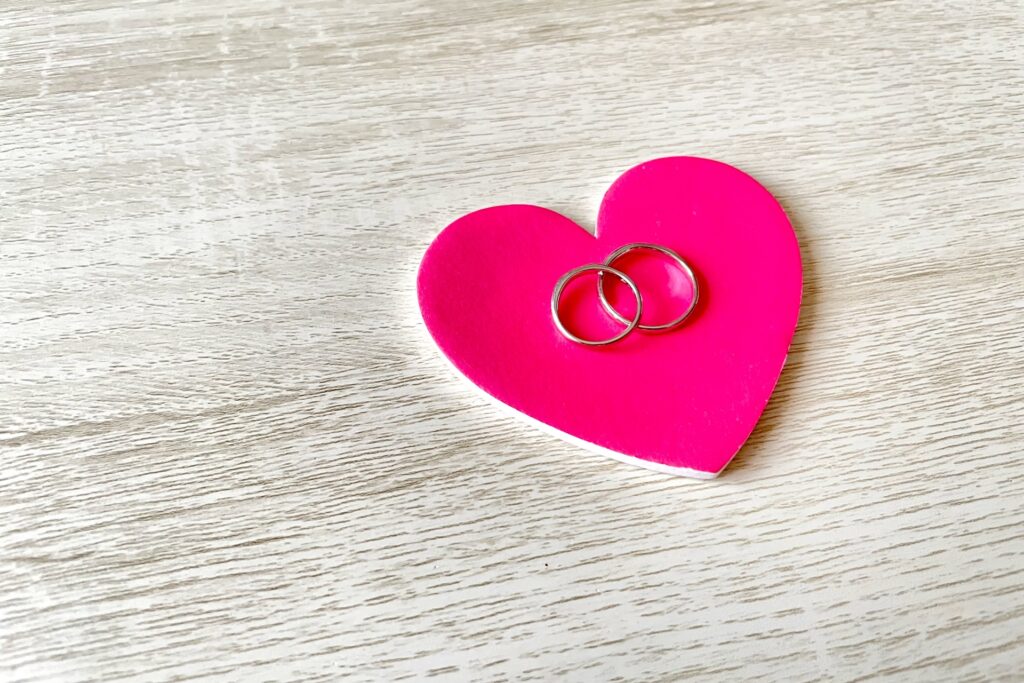 ふたつのリングを重ねると浮かび上がるハートが、ふたりだけの特別な愛を静かに映し出します。