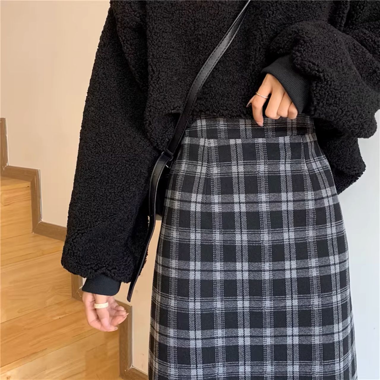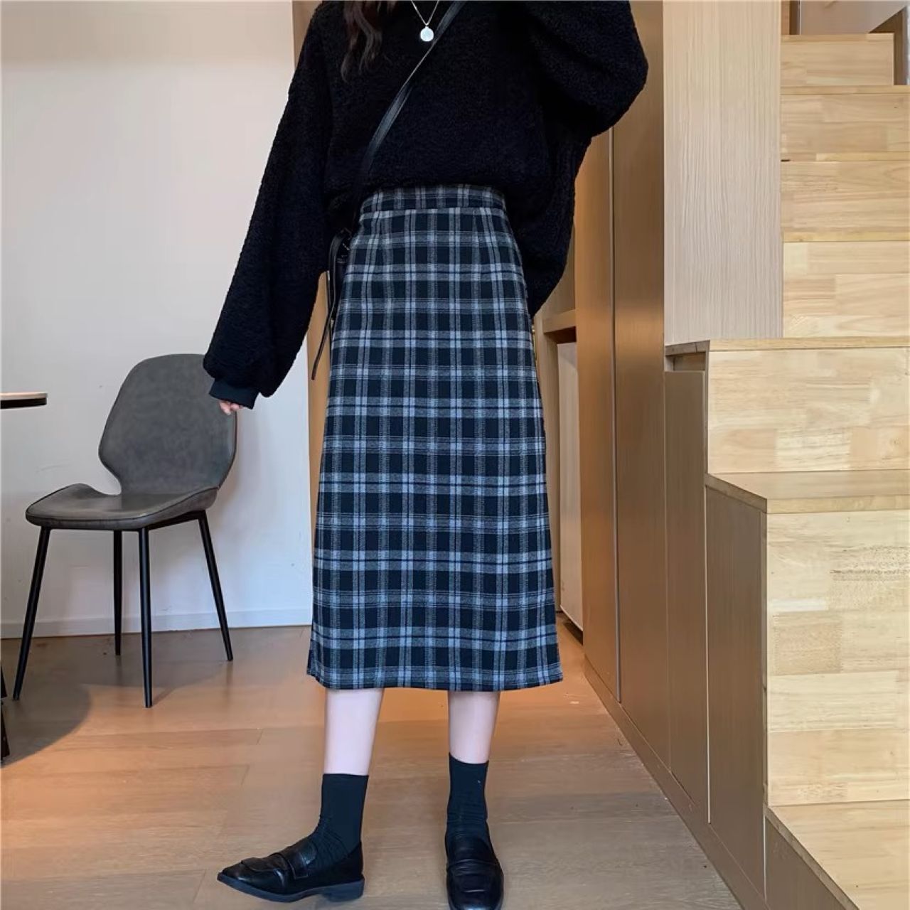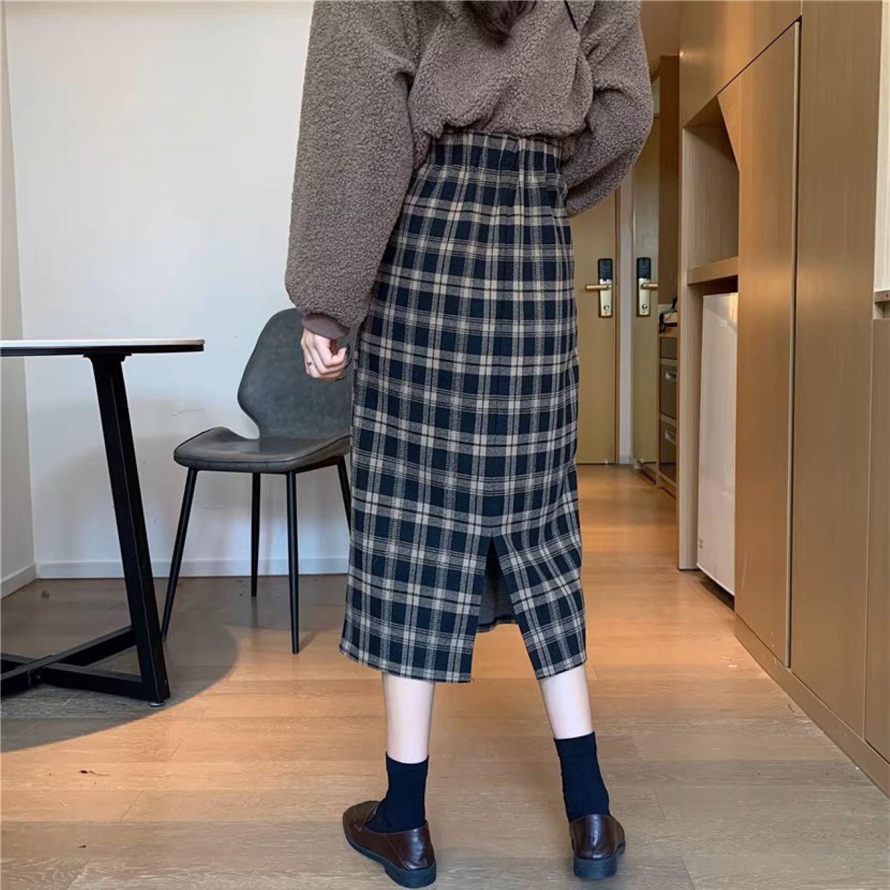 双子コーデ チェック柄ミモレ丈スカート ハイウエスト スリット入り