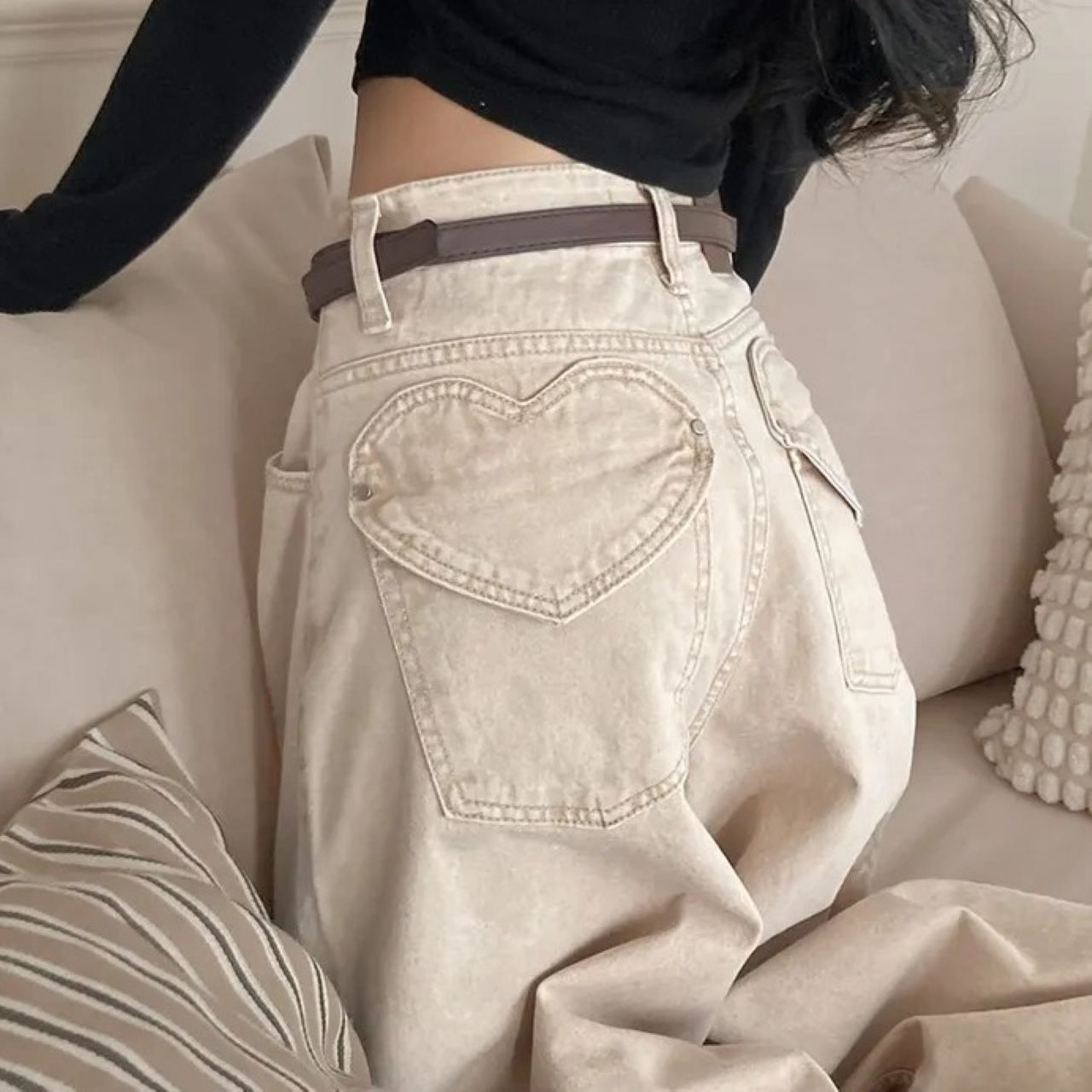 双子コーデ ハートポケットデザイン デニムパンツ ハイウエスト ワイドレッグ