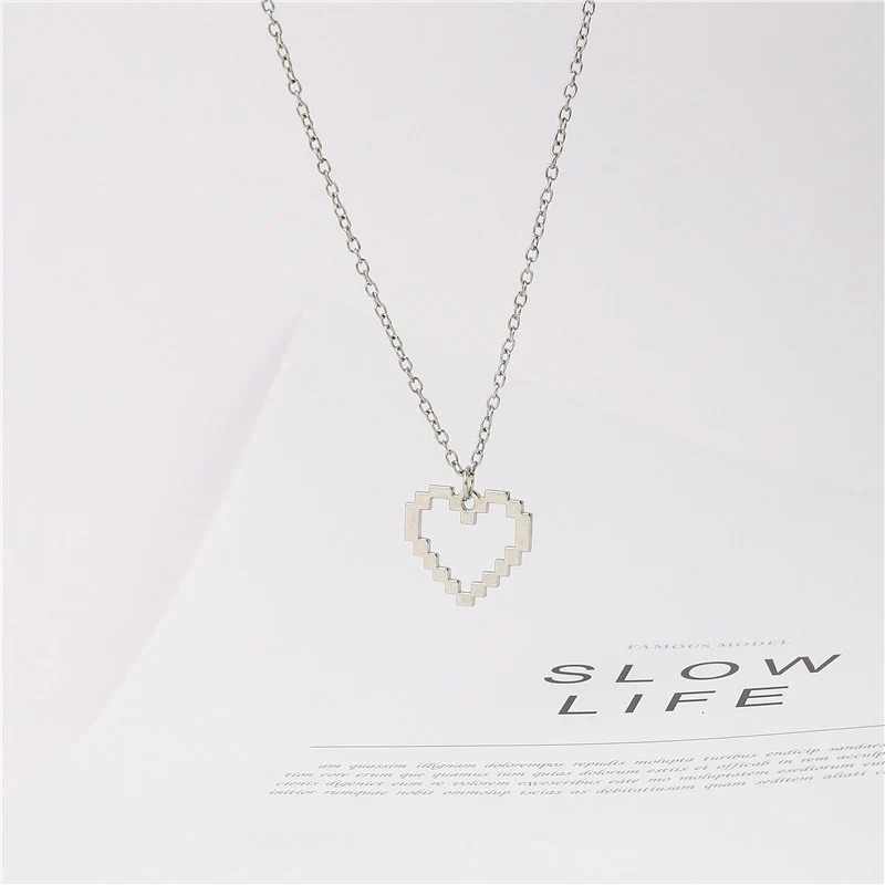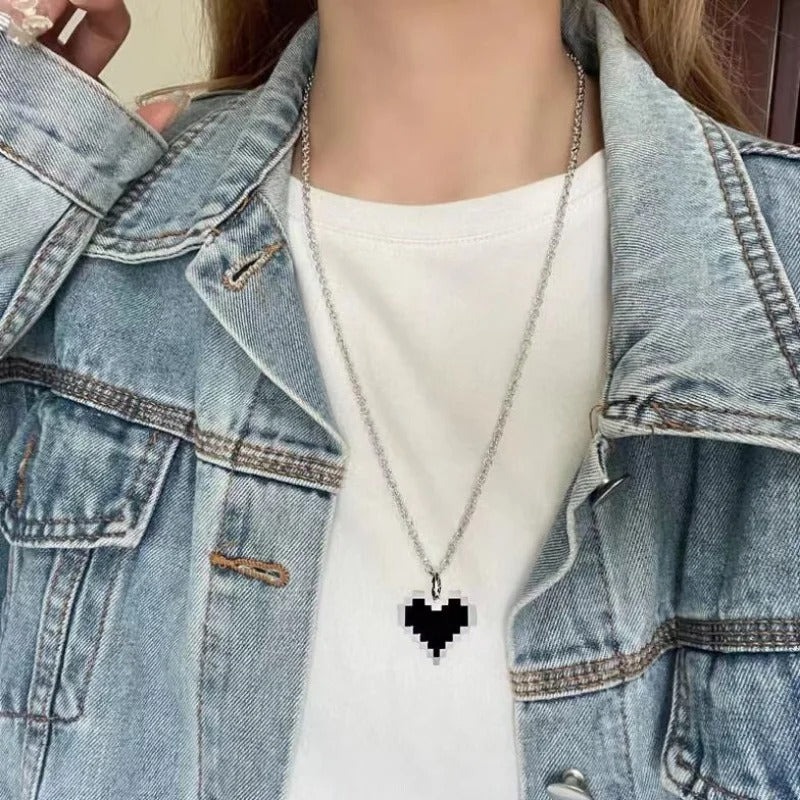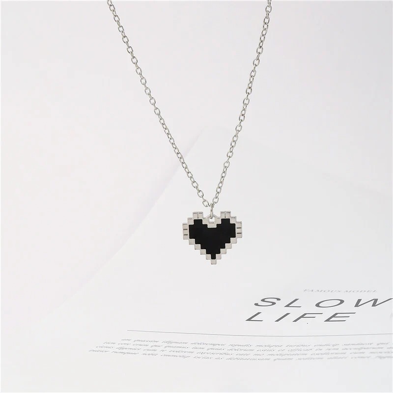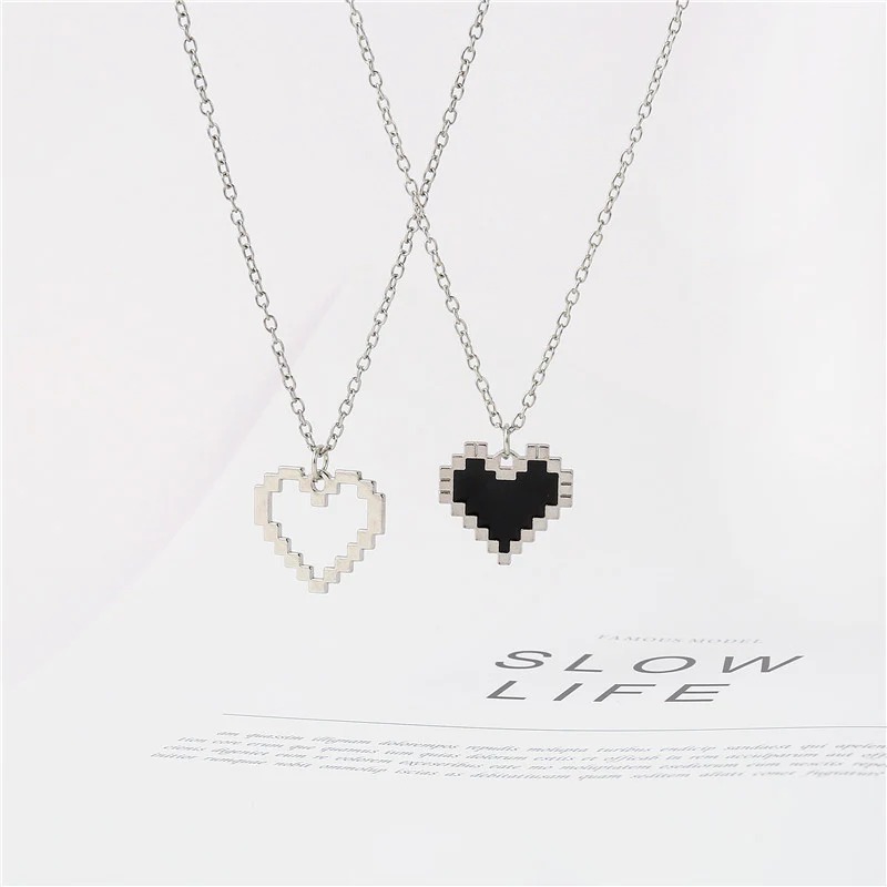 ドット調のピクセルデザインが印象的な、ハートモチーフのペアネックレス。 ブラックとシルバーのコントラストが甘さを抑え、さりげなくおそろいを楽しめるデザインです。 シンプルながら存在感があり、ストリートや韓国ファッションとも好相性。 ユニセックスで使いやすく、カップルはもちろん友達同士のおそろいにもおすすめ。 普段使いしやすく、ギフトにも選びやすいペアアクセサリーです。
