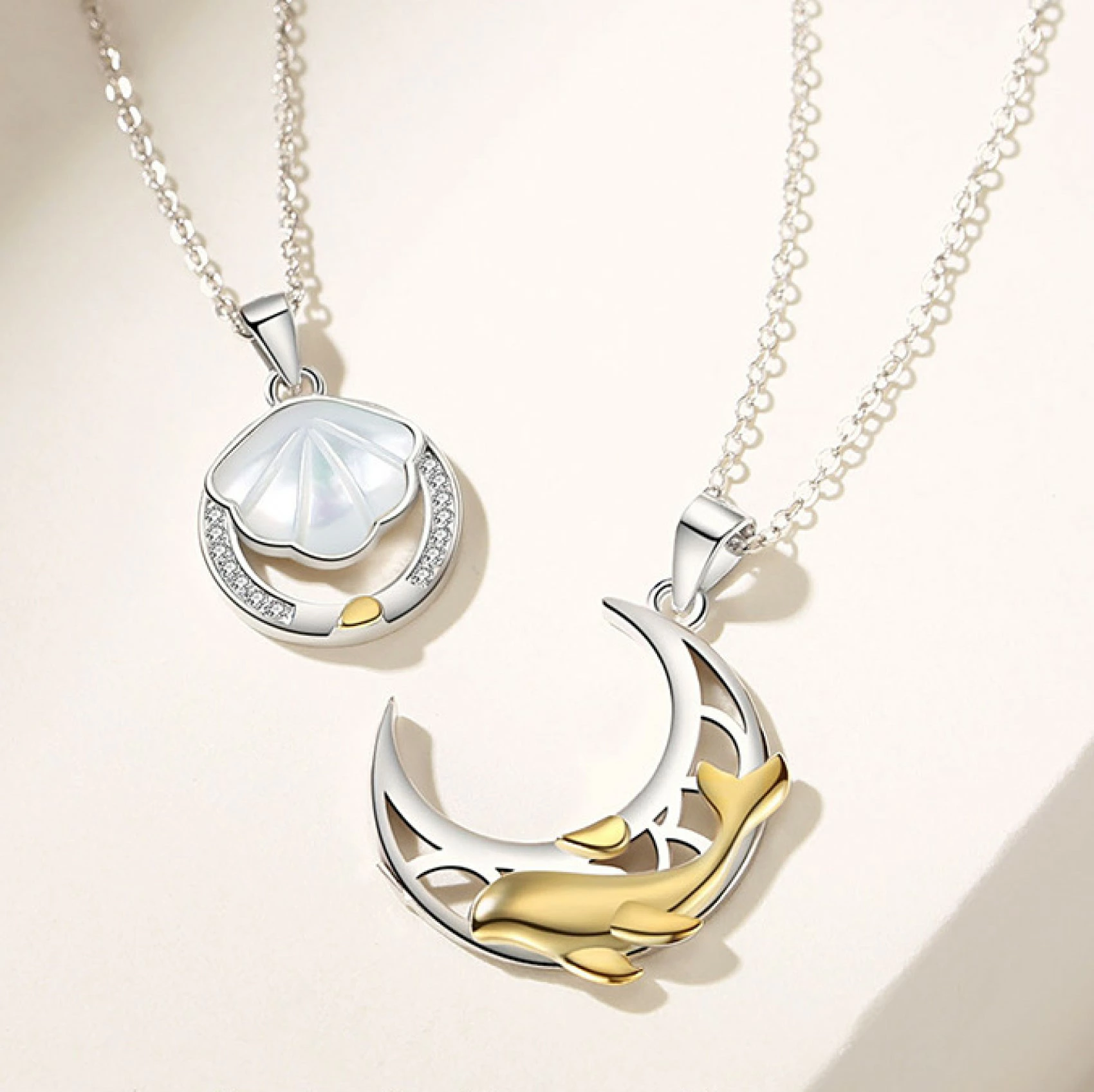 【満ち欠けの月と貝殻ネックレス】は、二人の絆を象徴する上品なペアアクセサリーです。月と貝殻をモチーフにした独自のデザインが特徴で、シンプルながらも洗練された印象を与えます。ユニセックス仕様でお揃いコーデにもぴったり。デイリーから記念日まで幅広く活躍し、誕生日や特別な日のプレゼントにも最適です。高級感のある仕上がりで、どんなシーンでも二人の魅力を引き立てます。