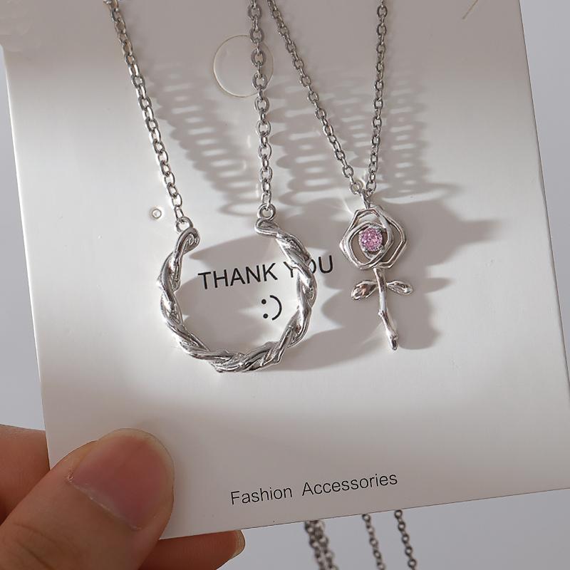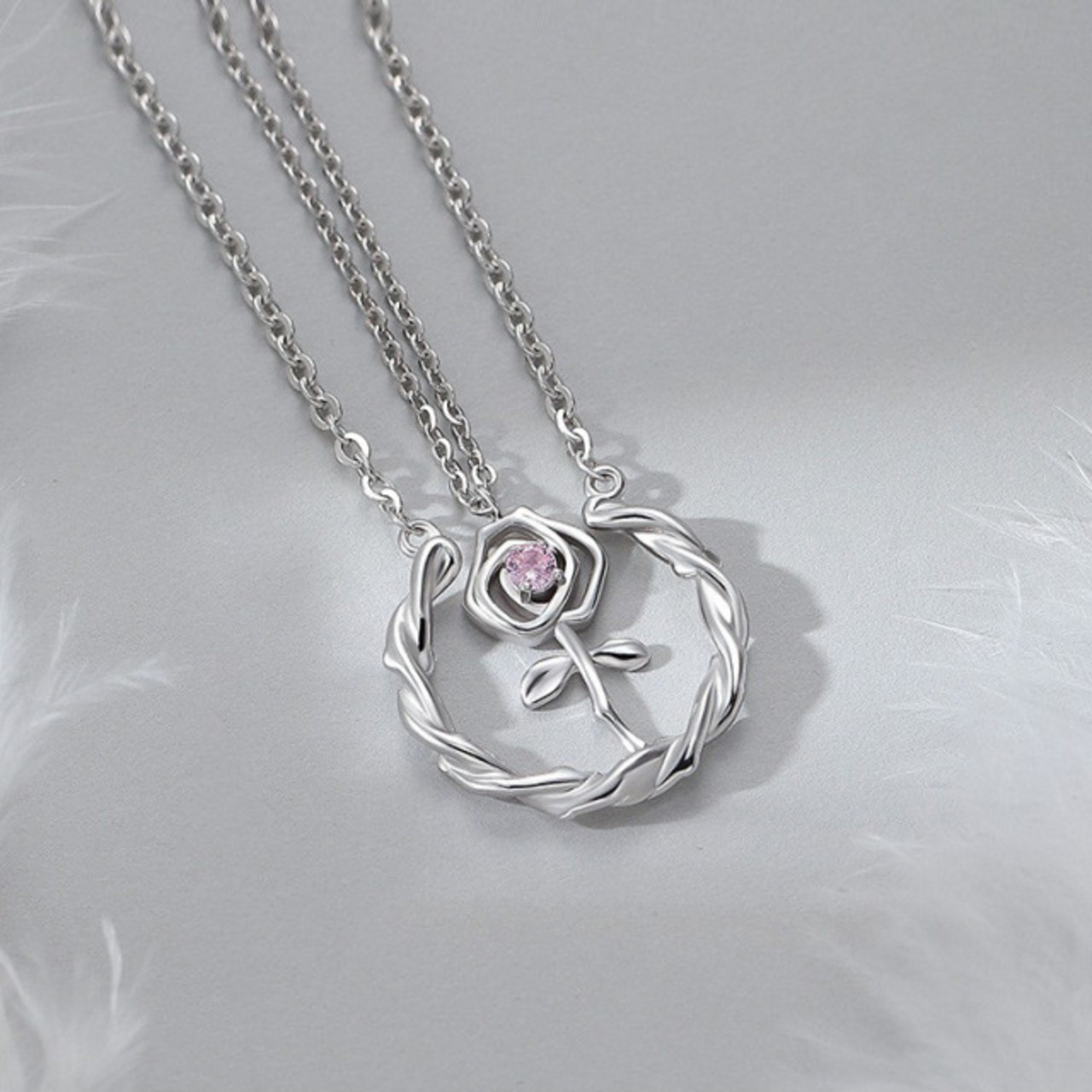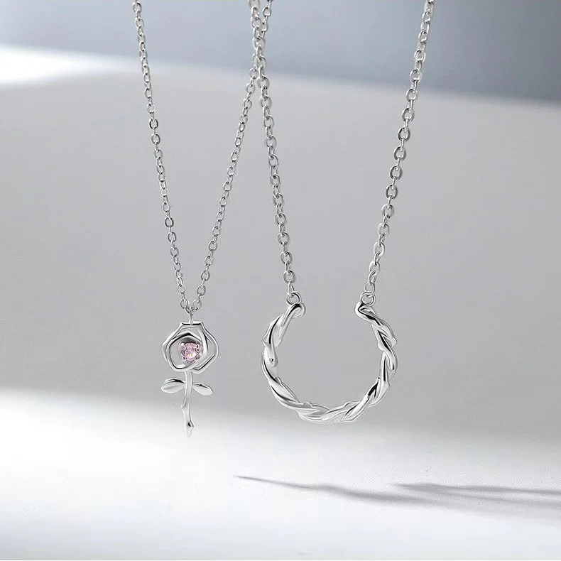 【ローズリンクネックレス】は、二人の絆を象徴する上品なペアアクセサリーです。とげのあるバラをモチーフにした繊細なデザインが特徴で、洗練された高級感を演出します。ユニセックス仕様でお揃いで身につけやすく、遠距離恋愛の記念品や特別な日のギフトにもおすすめです。上品な輝きがどんなシーンでも二人の存在を引き立てます。