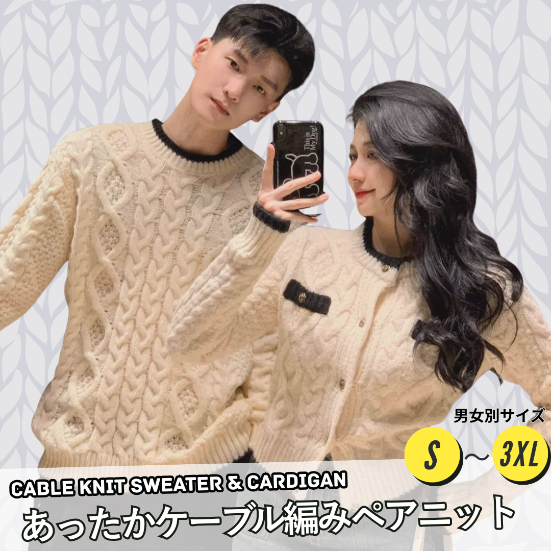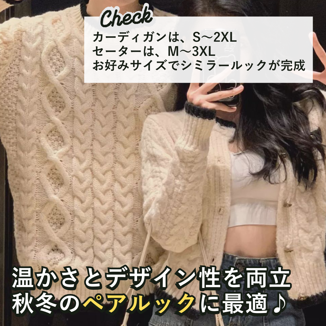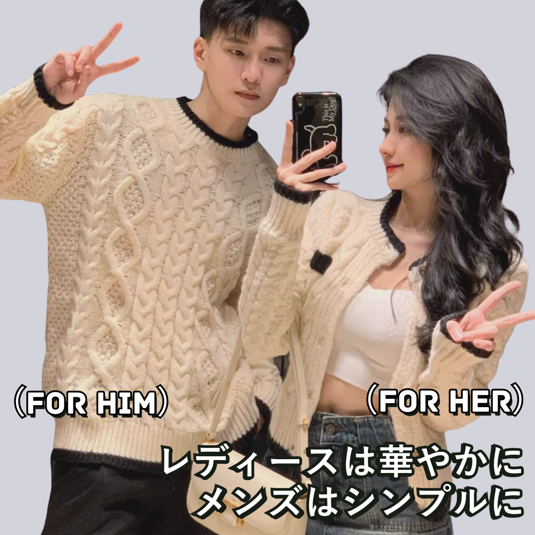 カップルペアルック【ケーブル編みニットカーディガン】は、暖かさとおしゃれを兼ね備えたアイテムです。立体的なケーブル編みが上品な印象を与え、クラシックながらトレンド感のあるデザインに仕上がっています。レディースはブラックのアクセントが効いたカーディガン、メンズは使いやすいセーターで、シミラールックが完成します。真鍮風のバラモチーフボタンや縁取りのブラックがデザインのポイント。デートや日常に寄り添う一枚です。