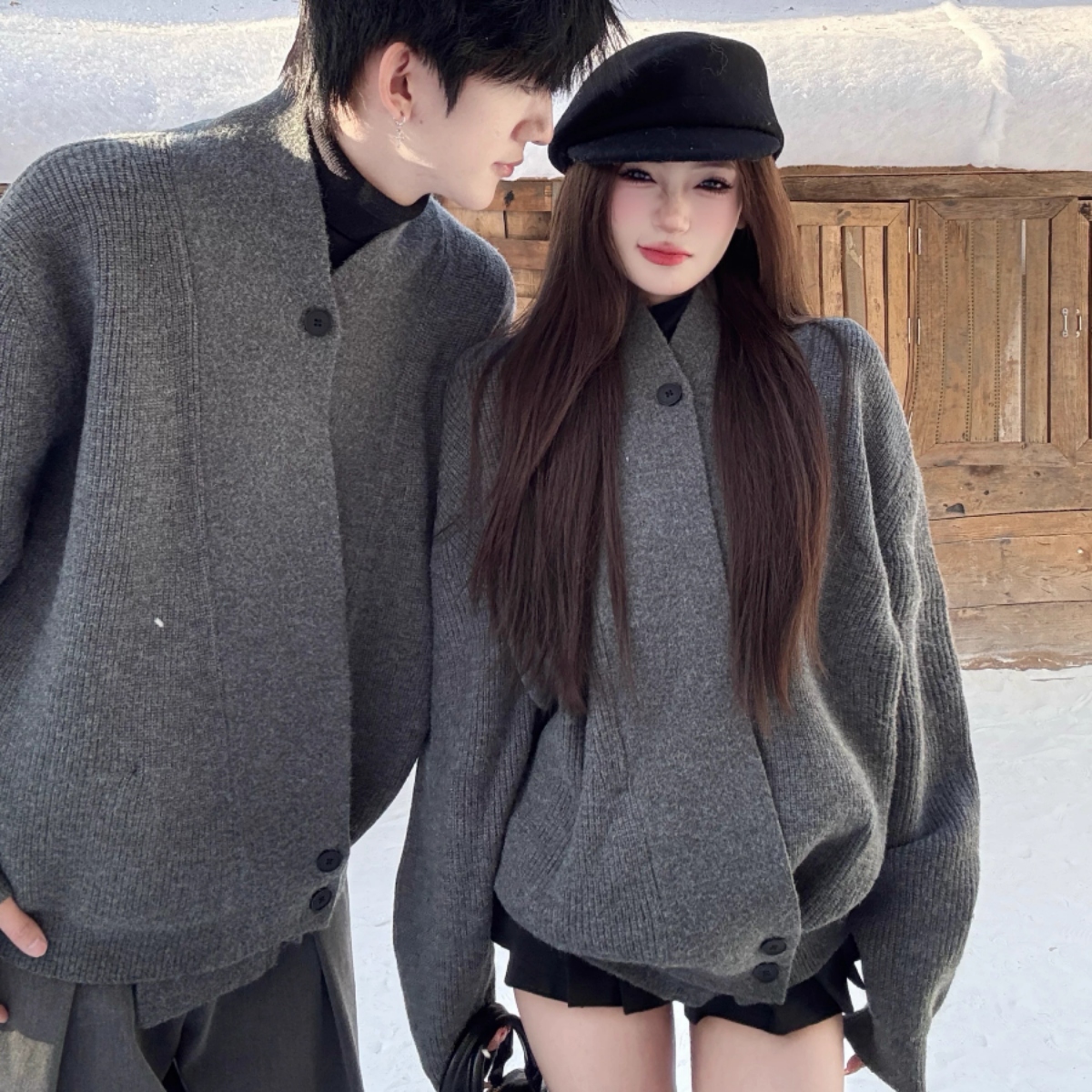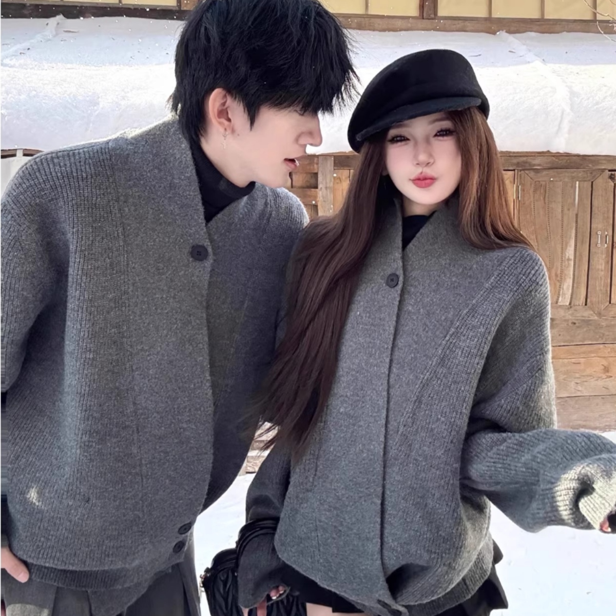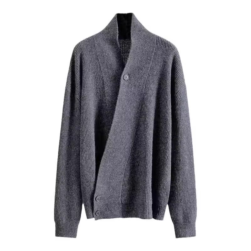 洗練された大人のための特別なペアルック、チャコールグレーのユニセックスニットカーディガンです。