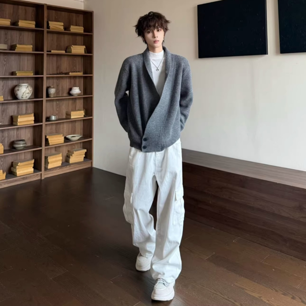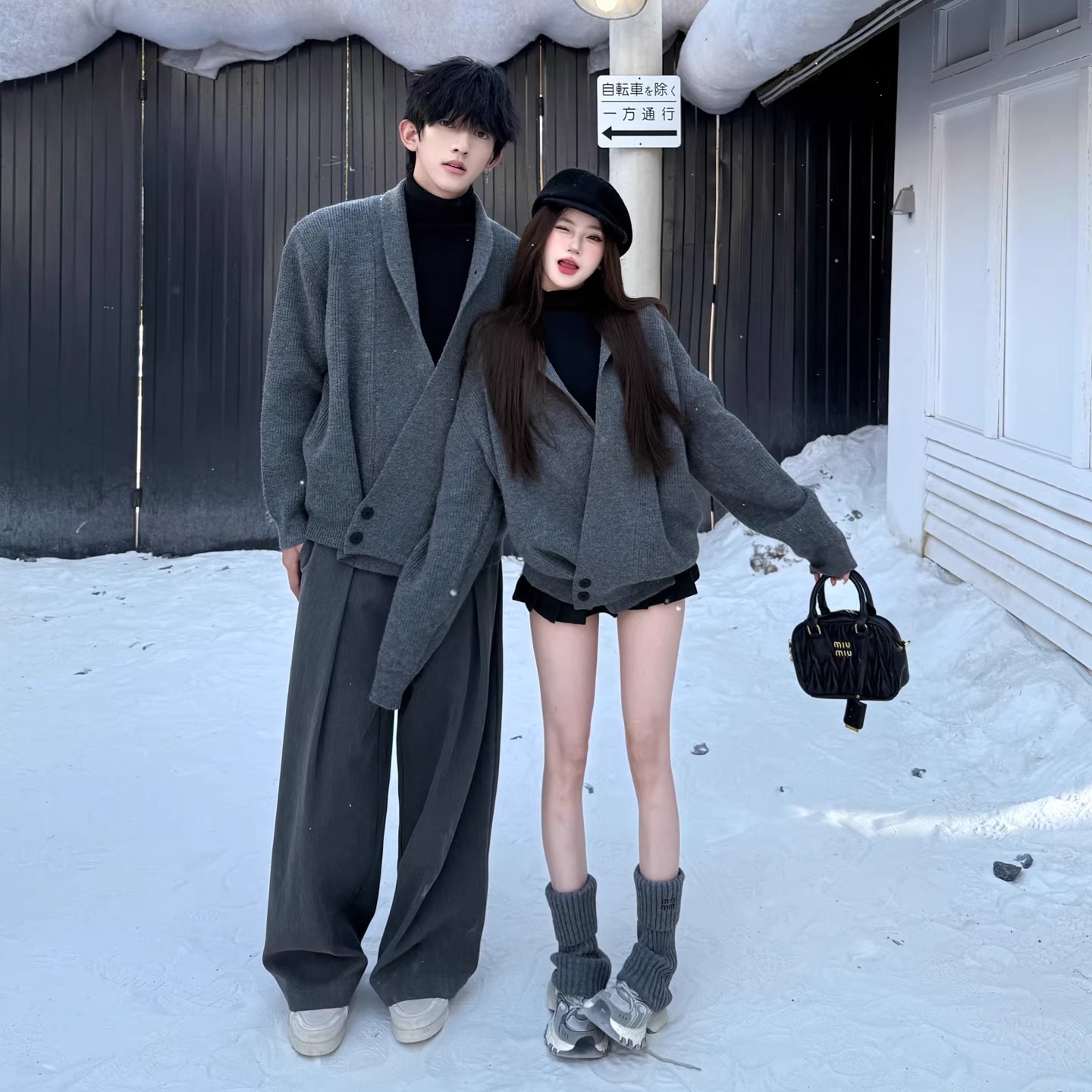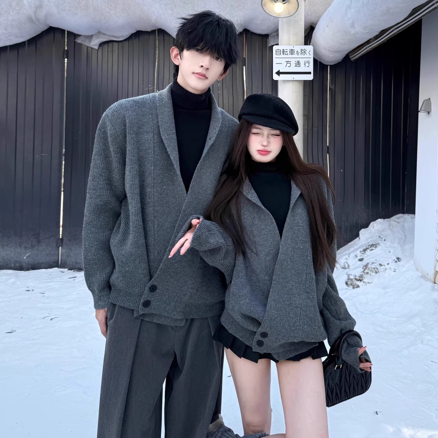 洗練された大人のための特別なペアルック、チャコールグレーのユニセックスニットカーディガンです。