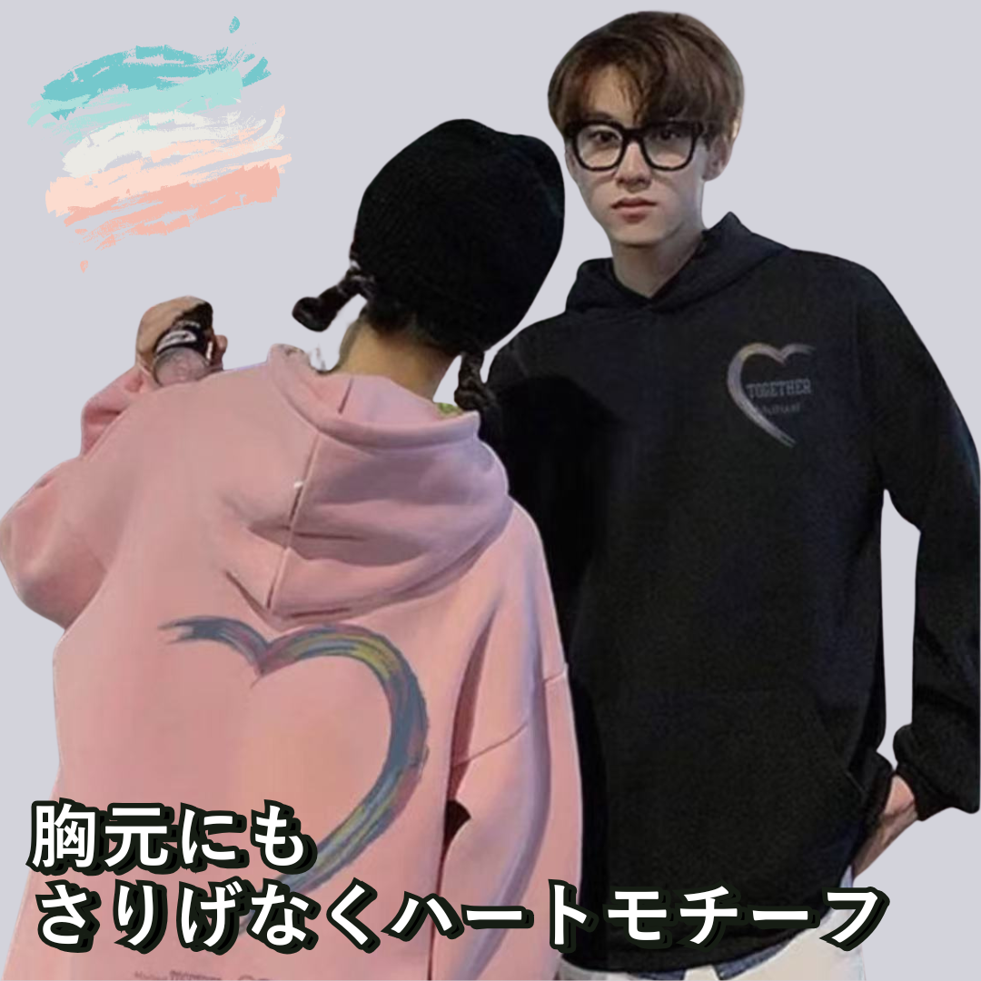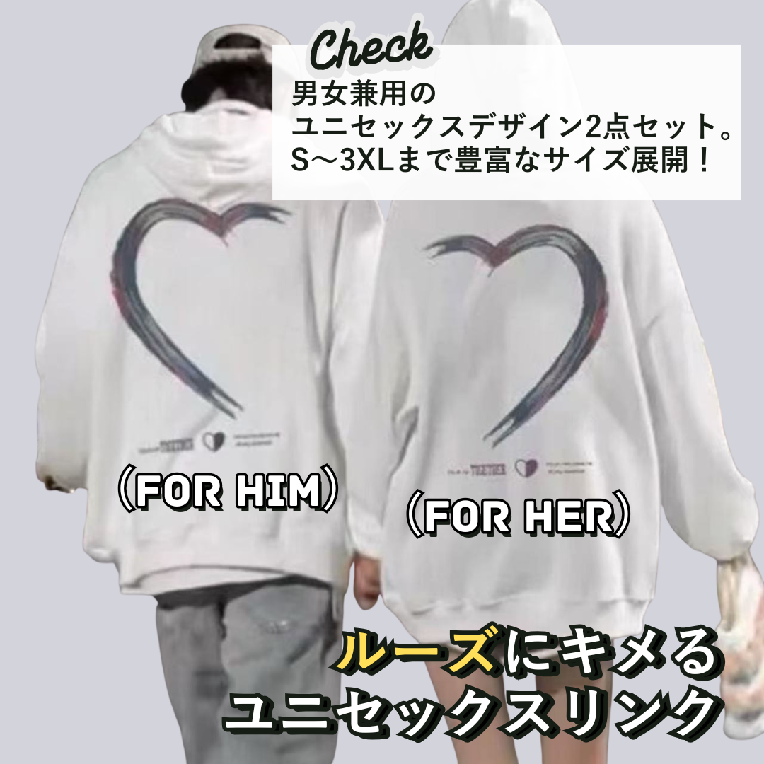 重ねるとひとつのハートになる特別なペアルックパーカーです。離れているときは半分のハートがそれぞれに描かれ、ふたりが並べばぴったり重なり合い大きなハートが完成します。シンプルながら遊び心のあるデザインで、恋人同士の絆をさりげなく表現。普段のお出かけや記念日コーデにもおすすめです。特別感とロマンチックさを兼ね備えた一枚で、ふたりの時間をより楽しく彩ります。