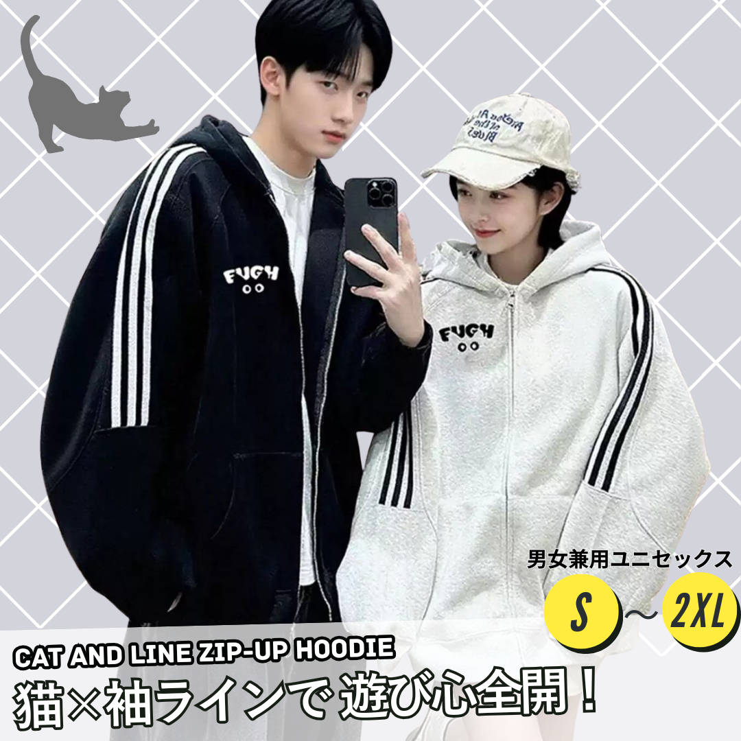 カップルペアルック ラインキャット ジップアップパーカー【2点セット】
