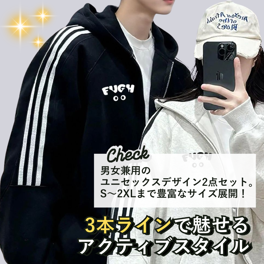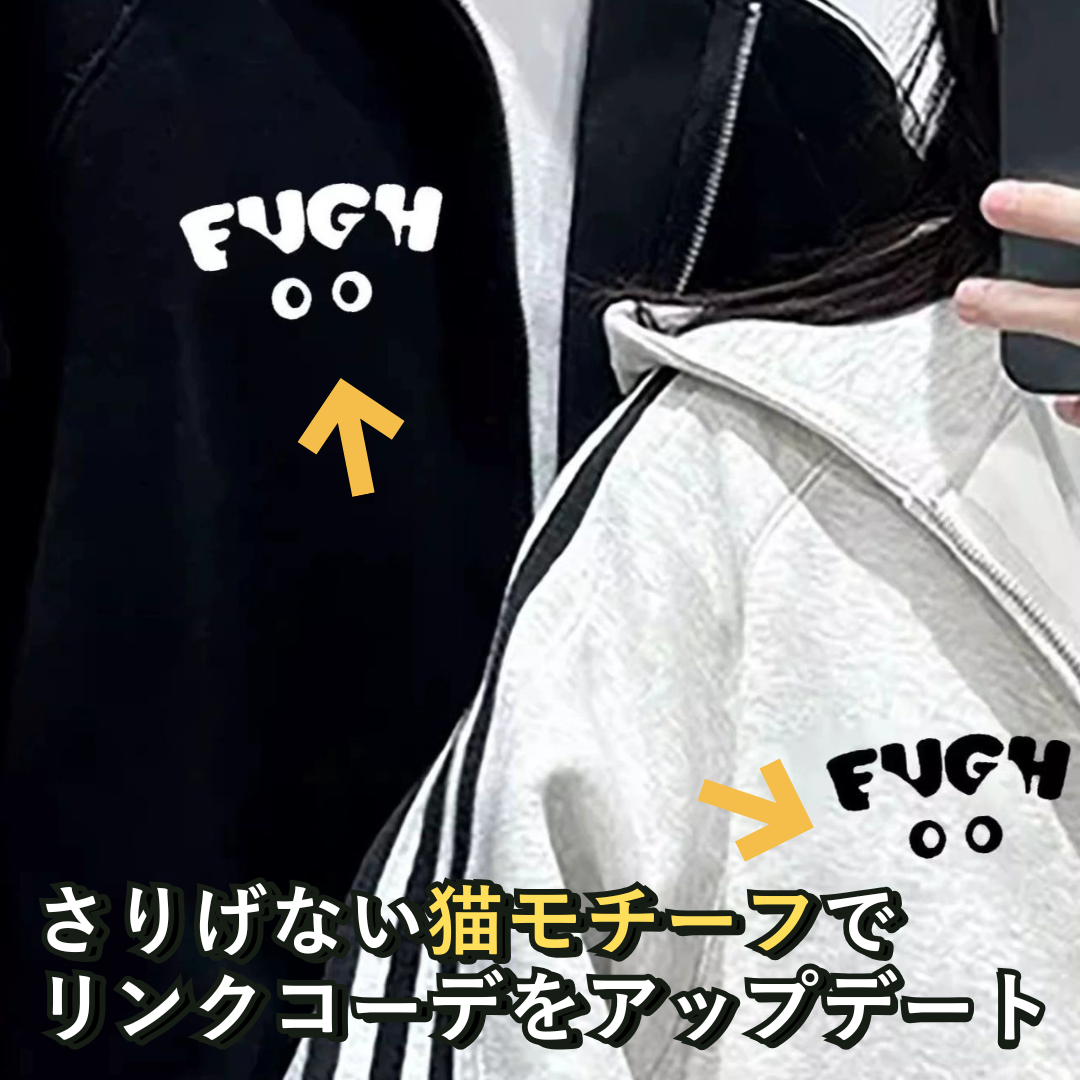 カップルペアルック【ラインキャット ジップアップパーカー【2点セット】】は、可愛らしさと遊び心を感じさせるアイテムです。胸元の猫の刺繍と袖の3本ラインがアクセントになり、カジュアルながらもおしゃれな印象を与えます。ユニセックス仕様の2点セットで、お揃いコーデを気軽に楽しめるのも魅力。デートやお散歩はもちろん、おうちでのリラックスタイムにもぴったりの一着です。