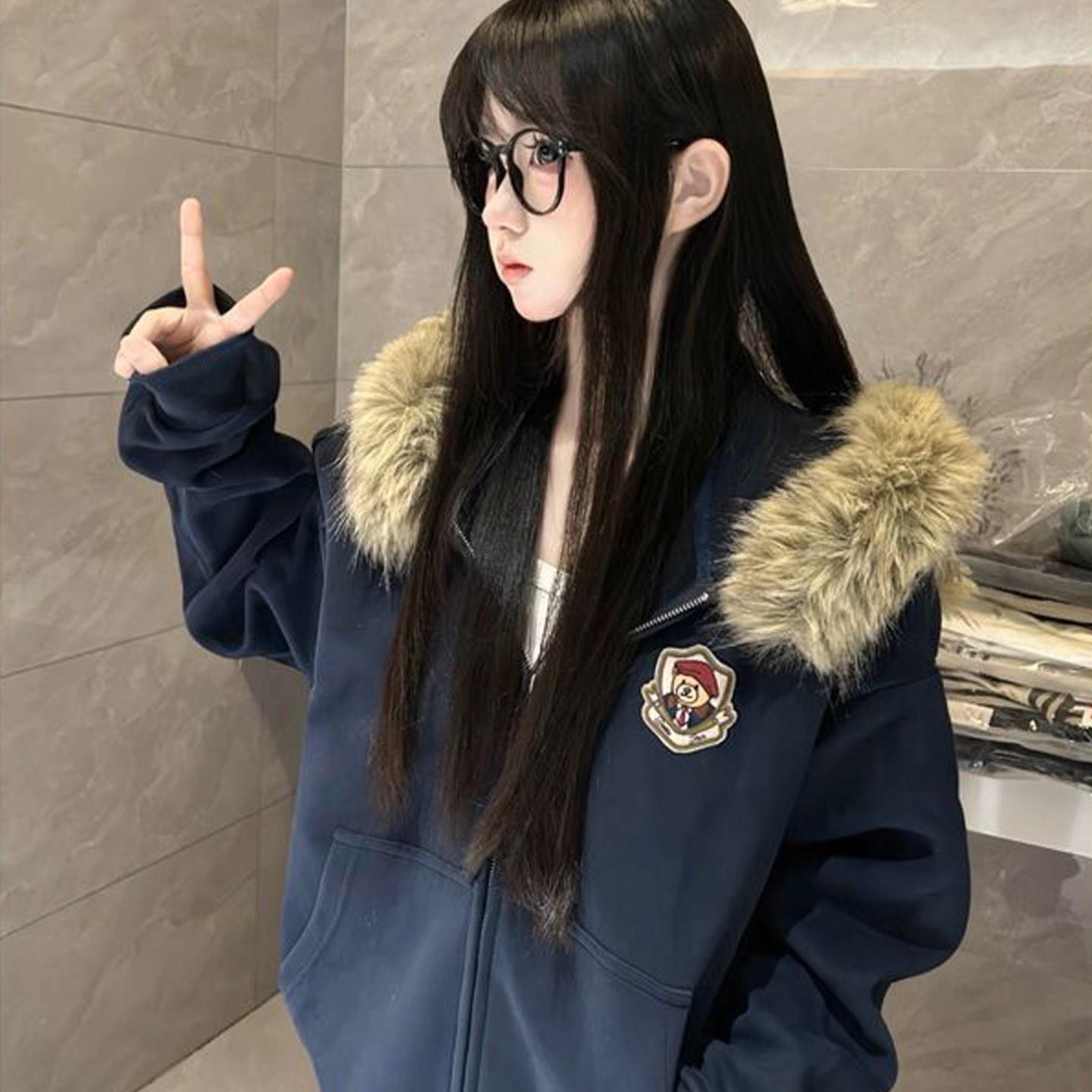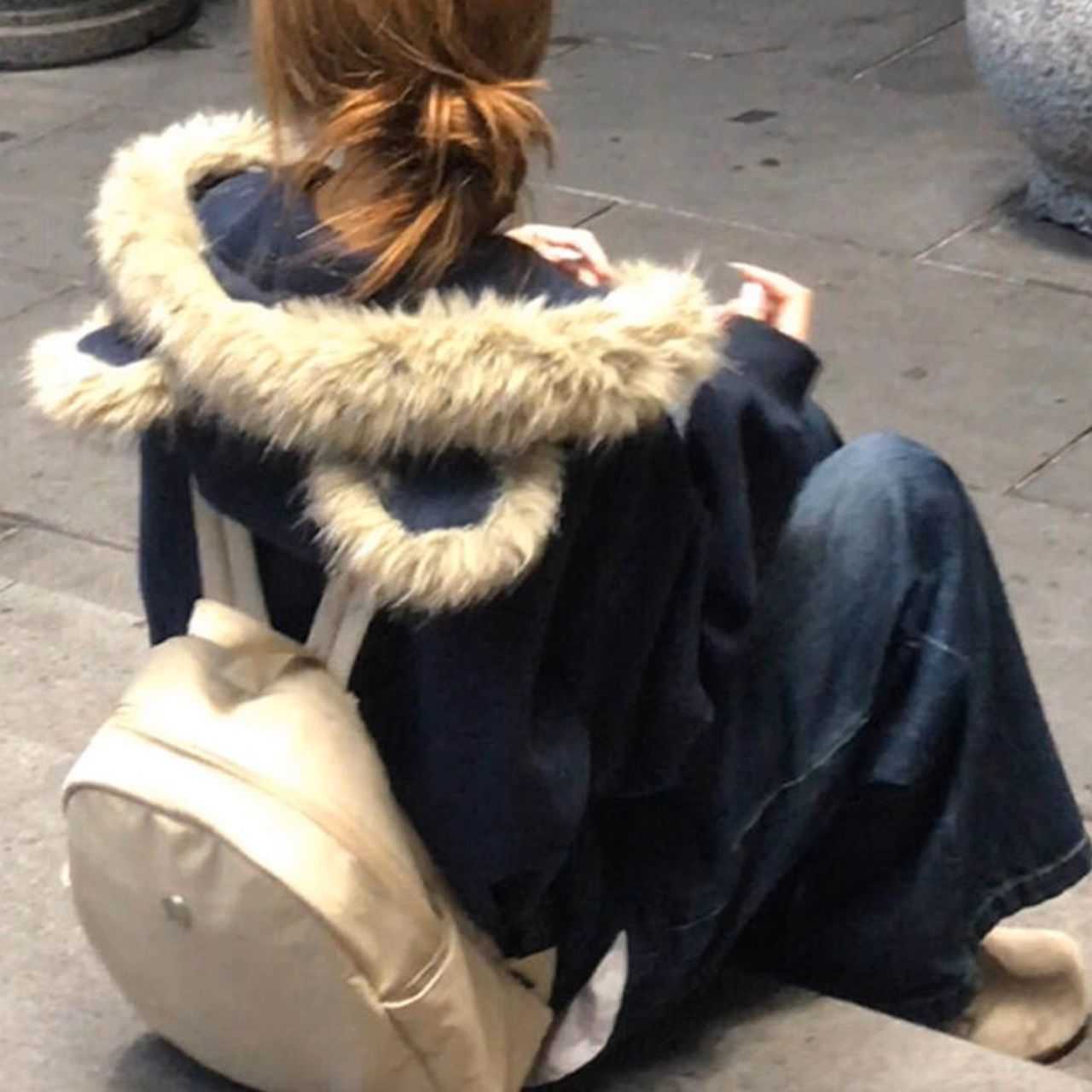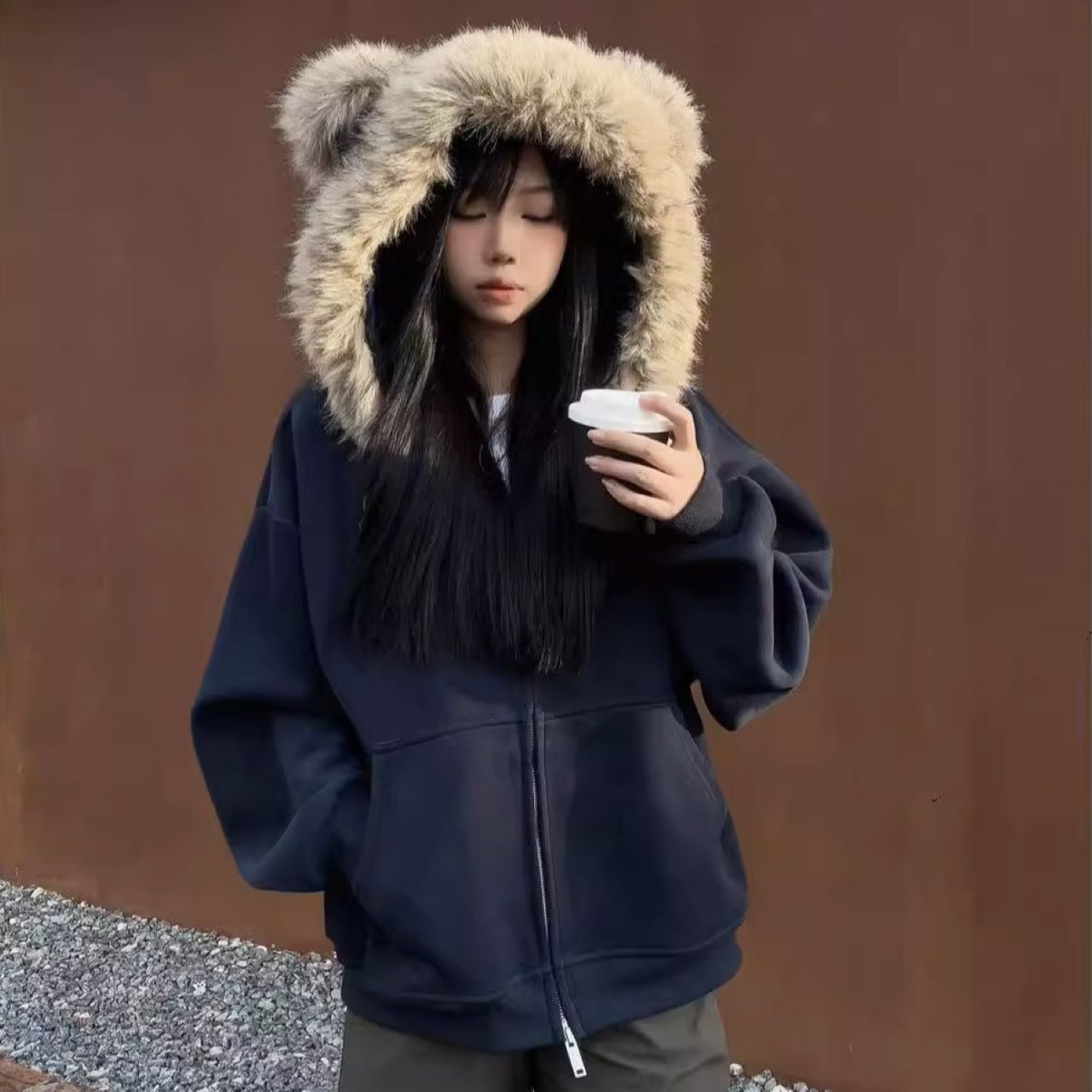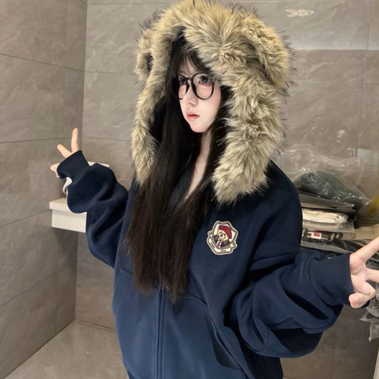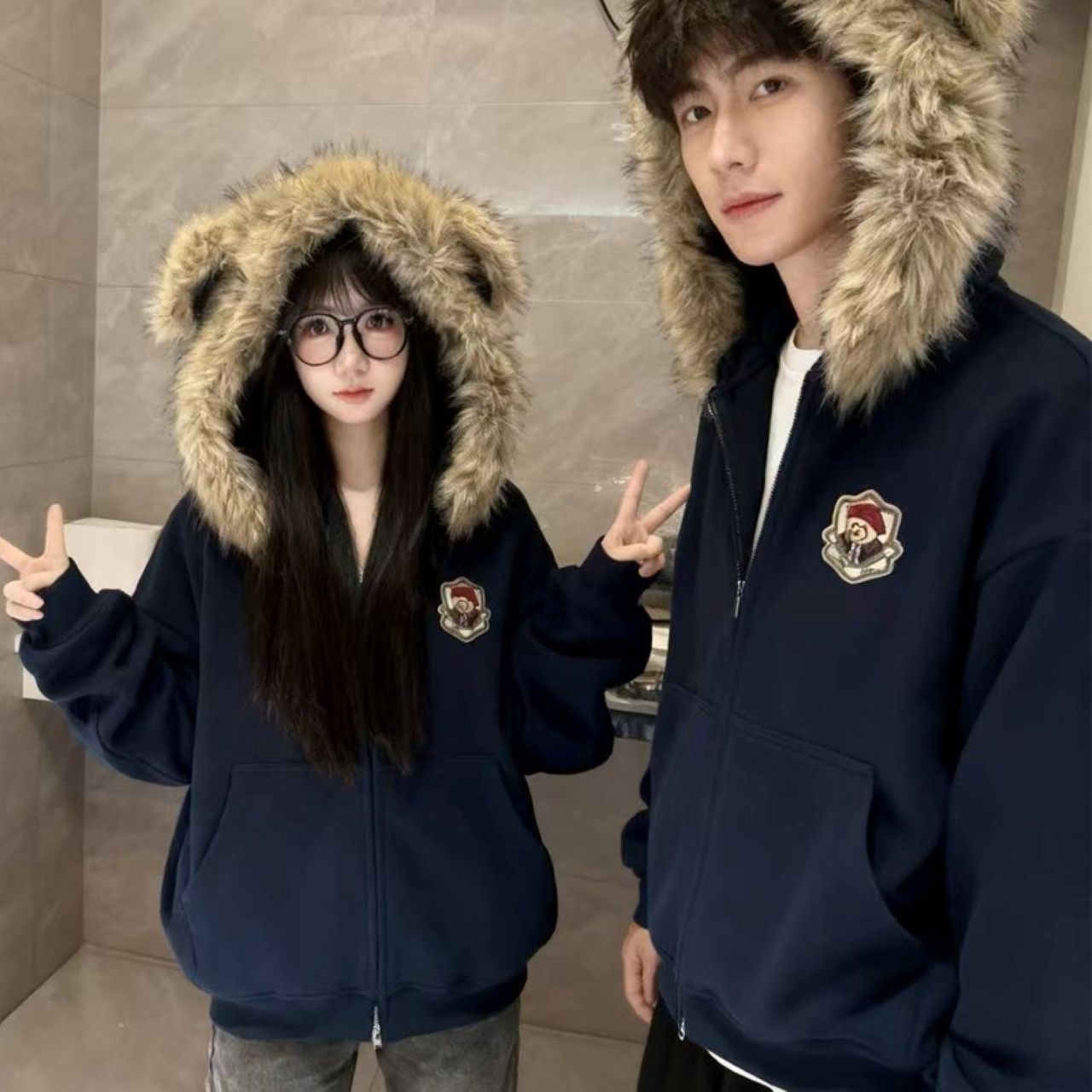 カップルペアルック ファー付き ベアプリントパーカー【2点セット】