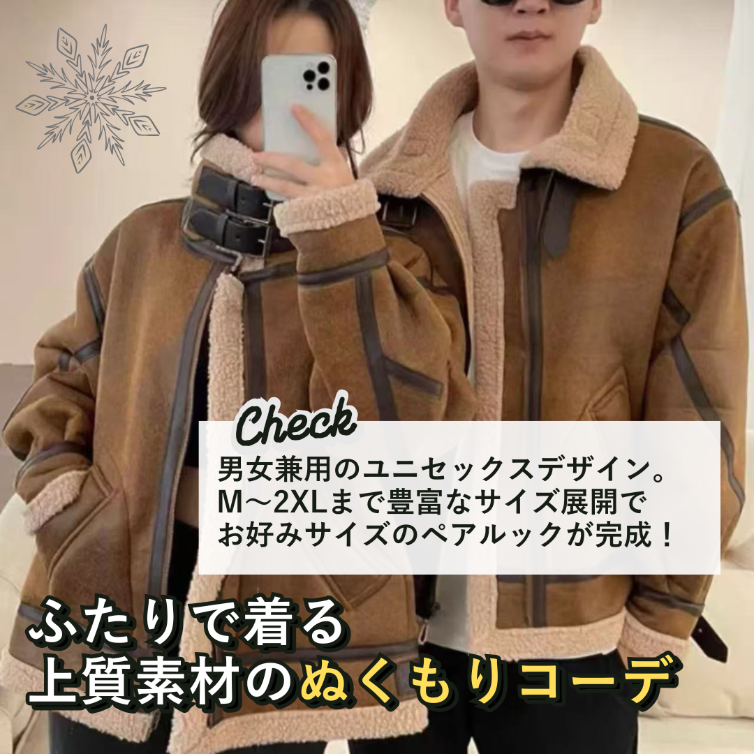 心温まるペアルックを楽しめる「ペアルック ラムウールムートンジャケット カップル向け」です。柔らかなラムウール素材と洗練されたデザインが特徴で、寒い季節の特別な瞬間を暖かく彩ります。冬に映える落ち着いたトーンやスタイリッシュなカラーをご用意し、ユニセックス仕様で豊富なサイズ展開も魅力です。大切な人とおしゃれなペアルックコーデを楽しむのに最適な一着です。