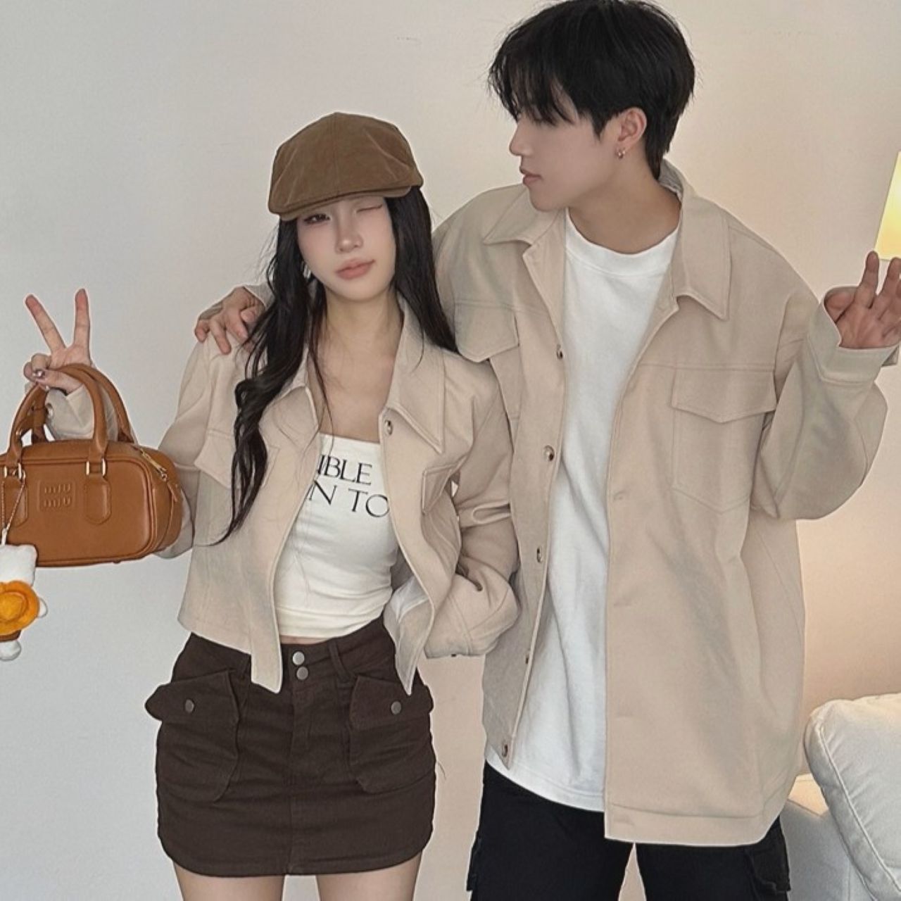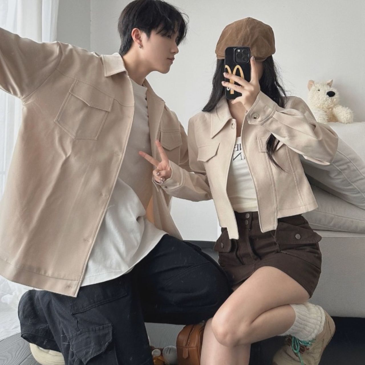 カップルペアルック【ベージュジャケット シンプルカジュアル】は、どんなコーディネートにも合わせやすい万能アイテムです。上品で落ち着いたベージュカラーが特徴で、カジュアルながらも洗練された印象を演出します。レディースはショート丈、メンズはレギュラー丈で、同素材ならではのさりげないお揃い感を楽しめます。ユニセックスデザインのため、カップルで着ることで自然なリンクコーデが完成。デートや普段使い、お出かけなど幅広いシーンで活躍する一枚です。