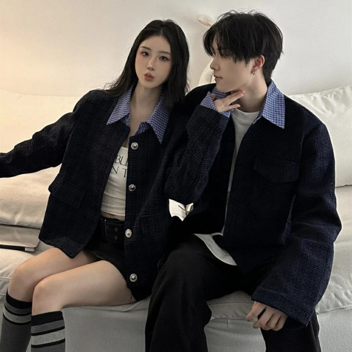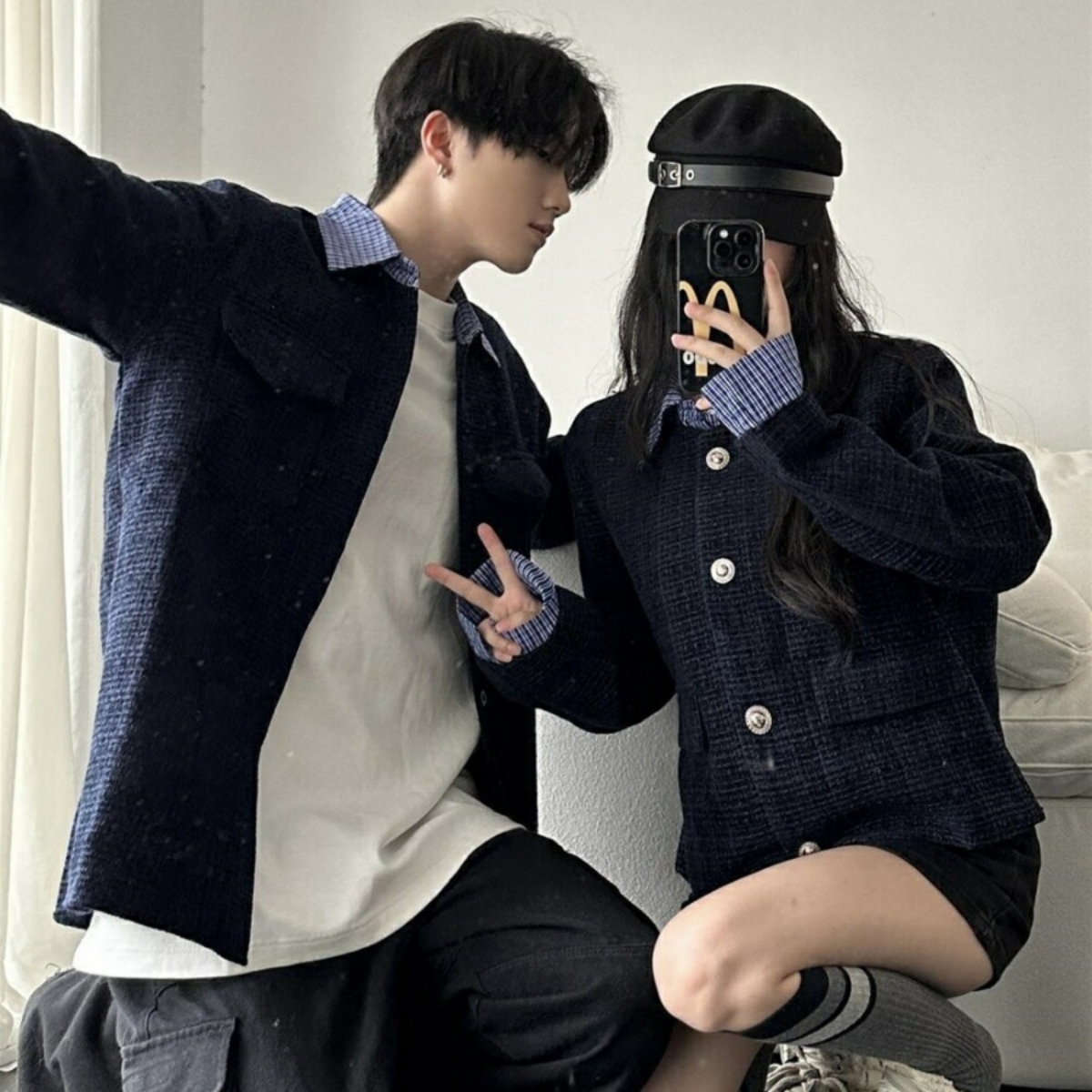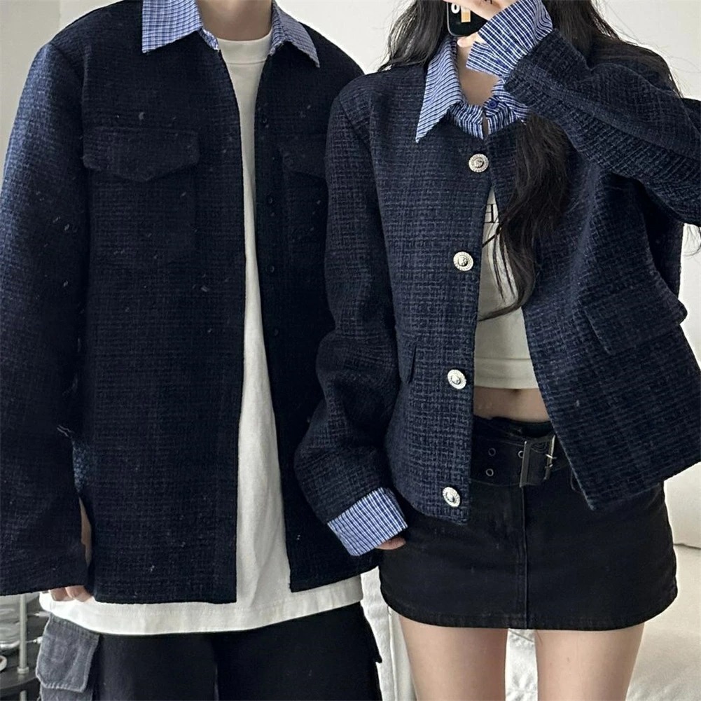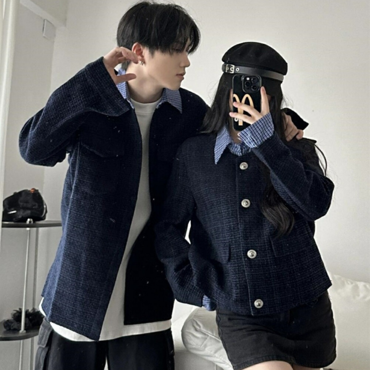 カップルペアルック ネイビーツイード レイヤード風ジャケット