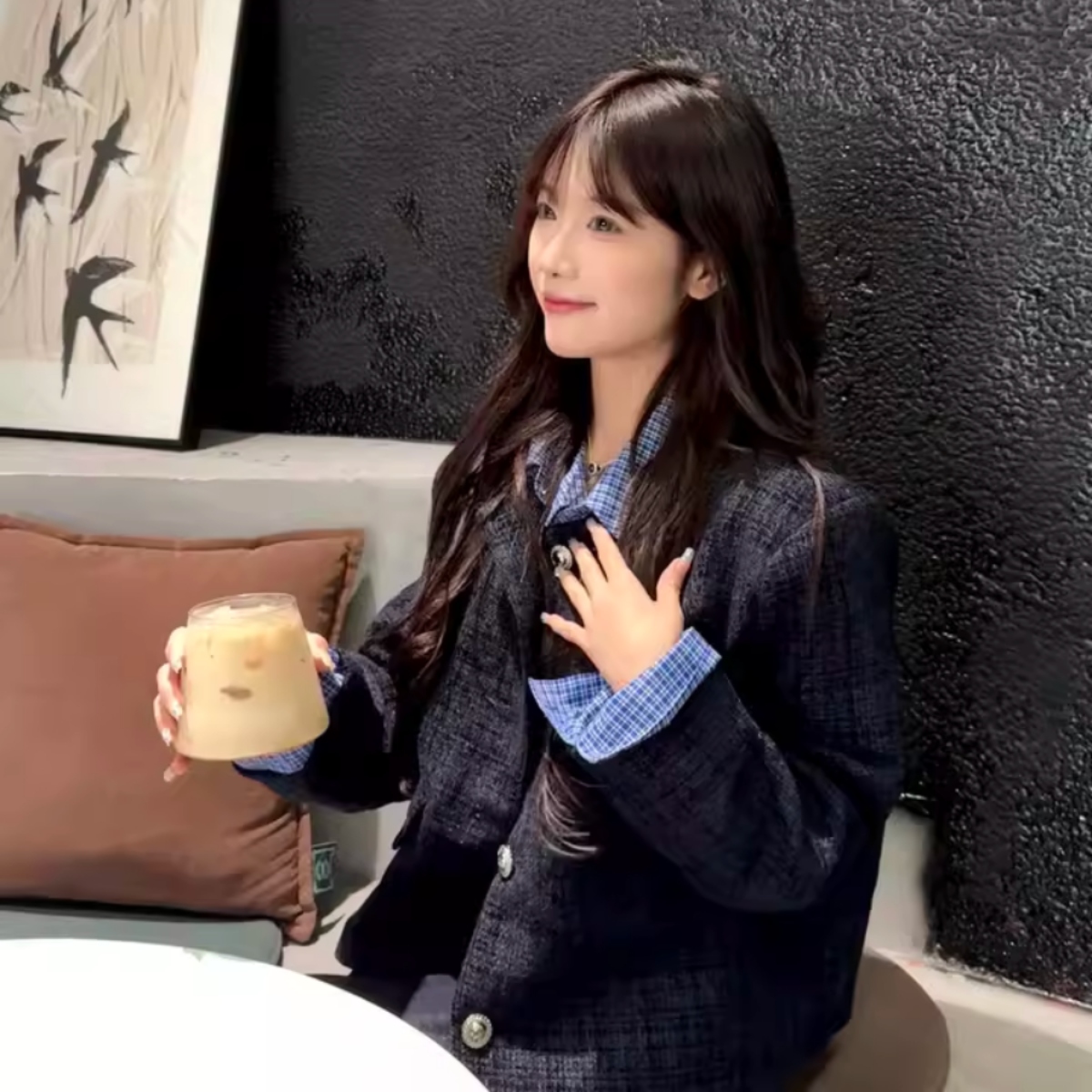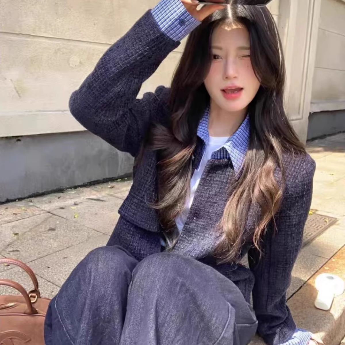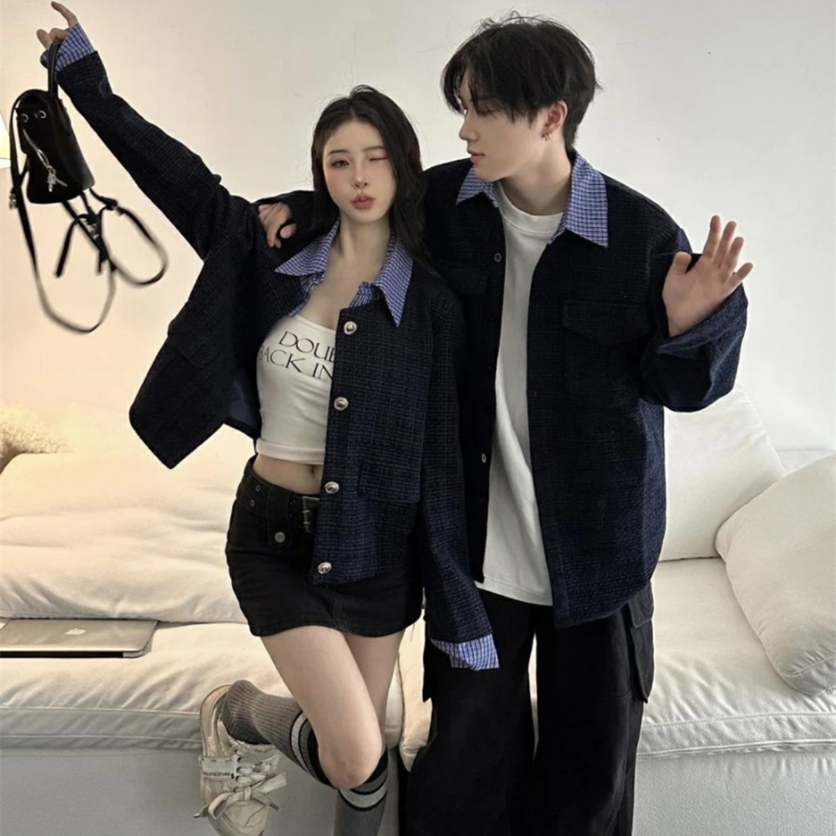 カップルペアルック ネイビーツイード レイヤード風ジャケット
