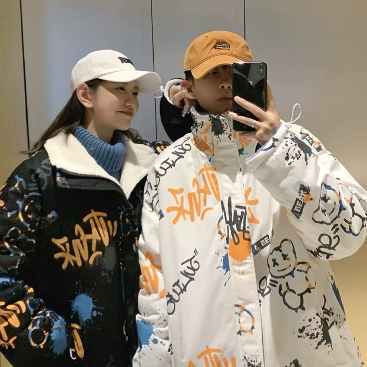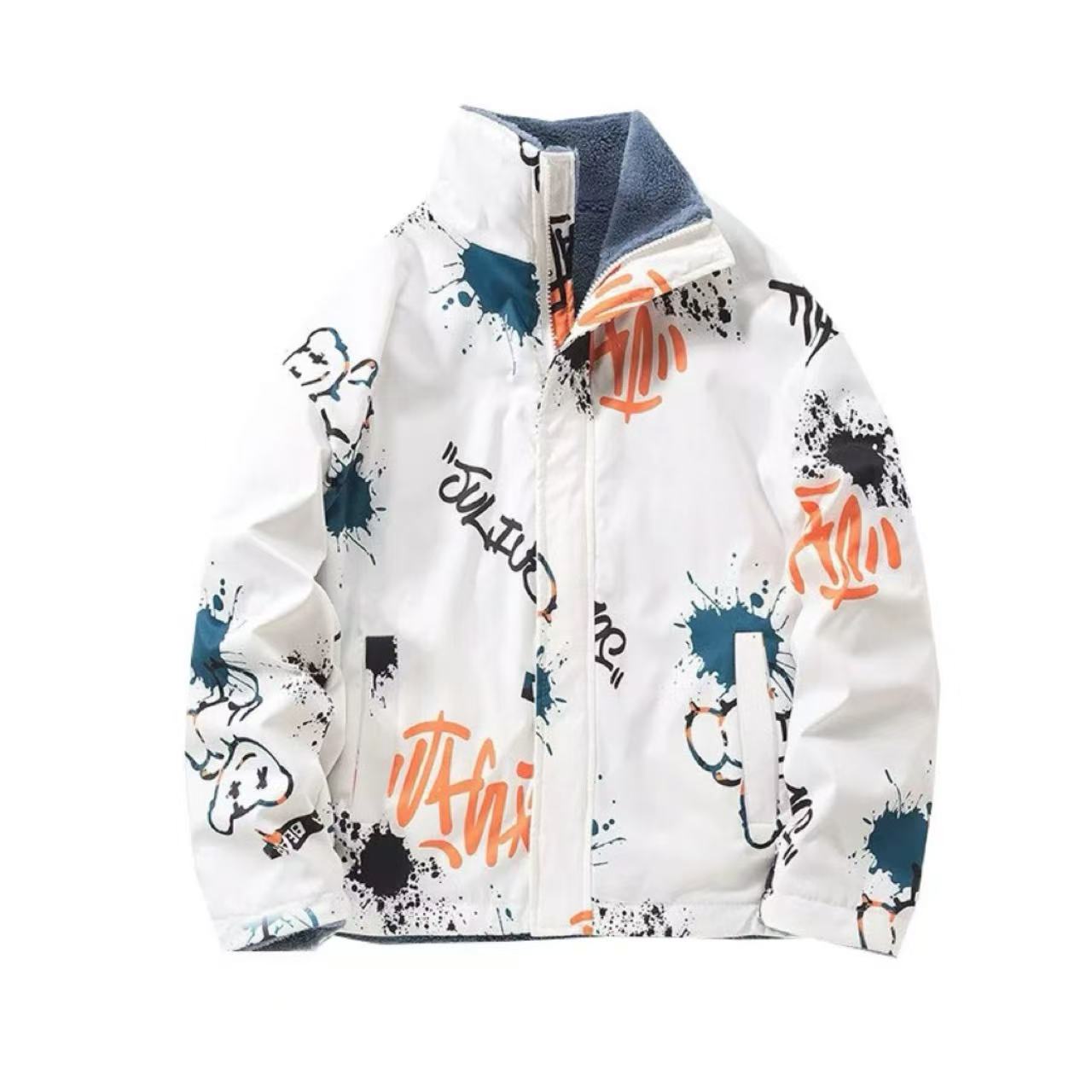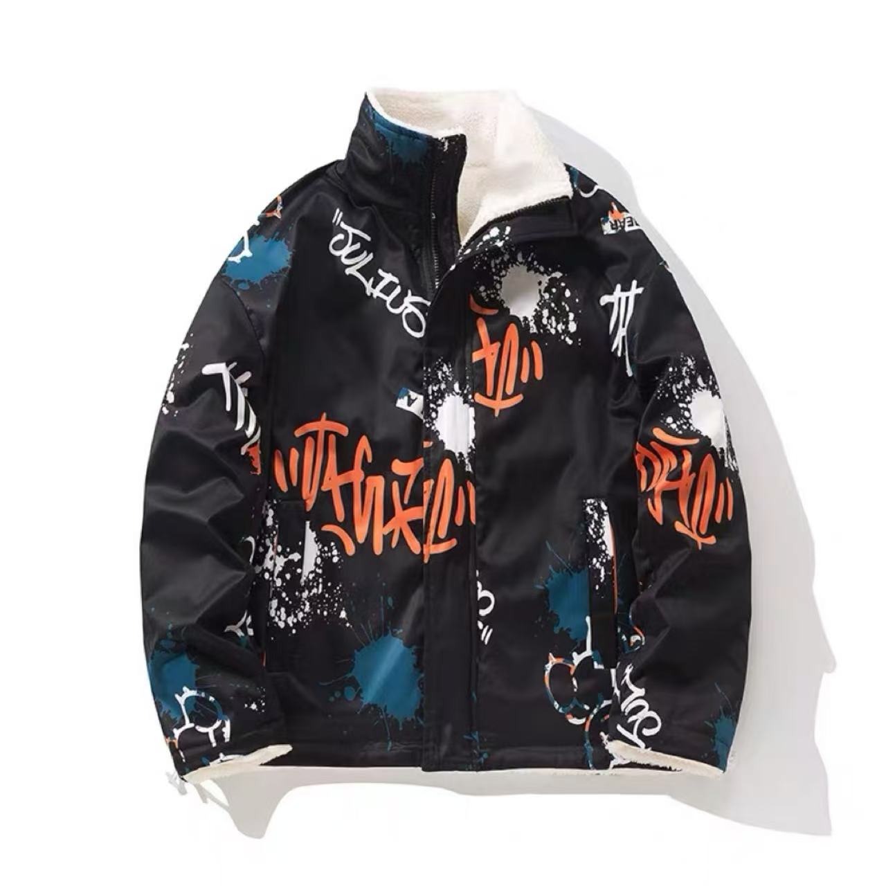 グラフィティ風プリントが存在感を放つリバーシブルジャケットです。気分やスタイルに合わせて2通りの着こなしを楽しめ、1枚で幅広いコーデに活躍します。オーバーサイズのゆったりシルエットで、男女問わずラフに羽織れるのも魅力。カップルや友人同士のリンクコーデにもおすすめのアイテムです。
