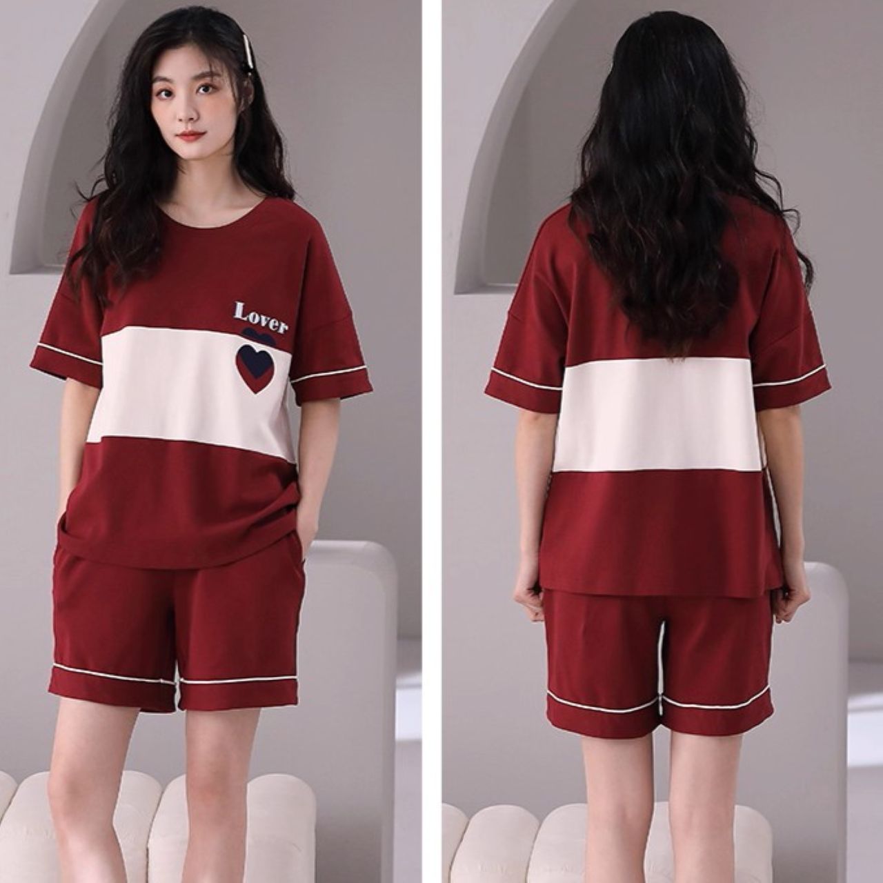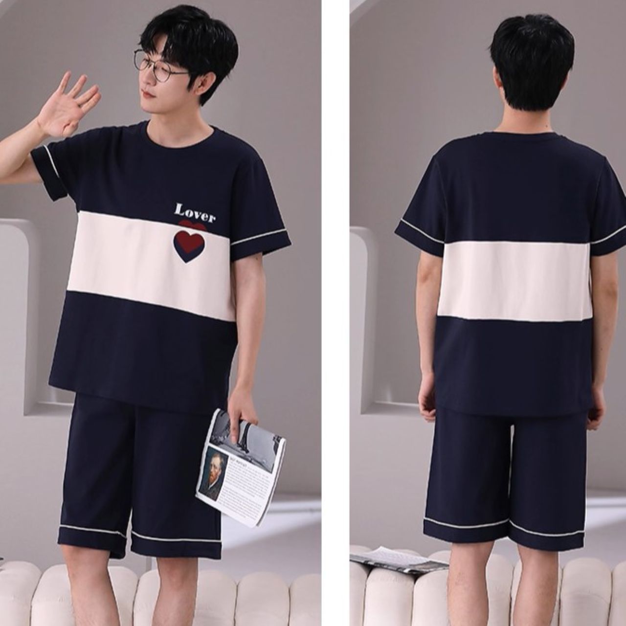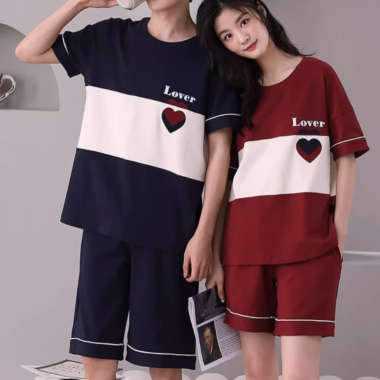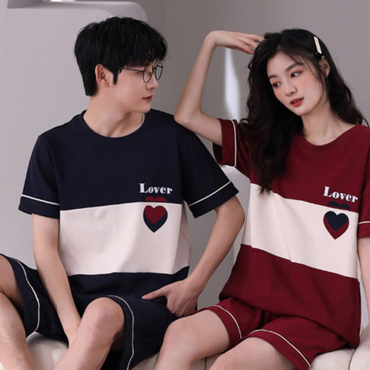 ペアルック コットン半袖ラウンドネックパジャマ(プルオーバー、カジュアル)