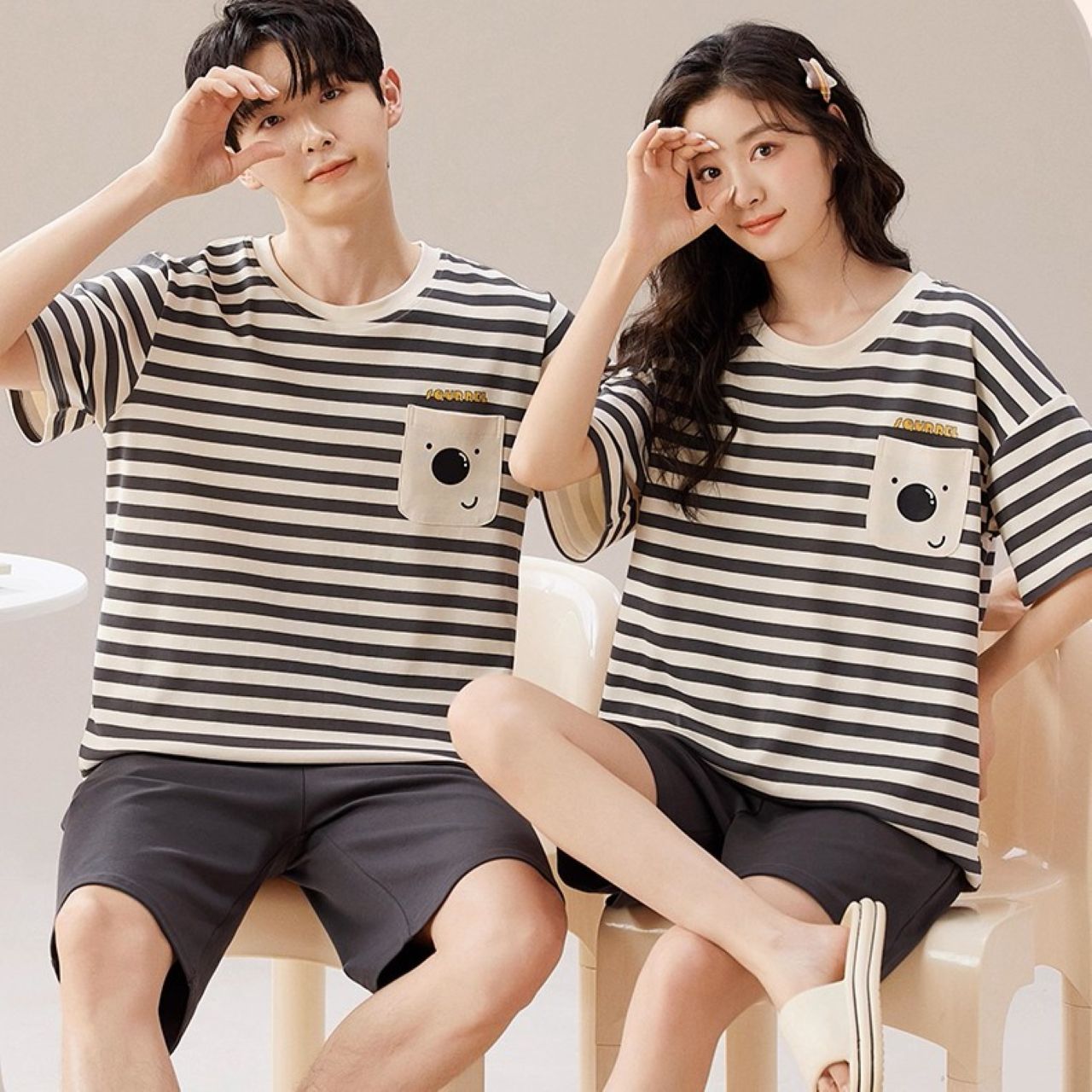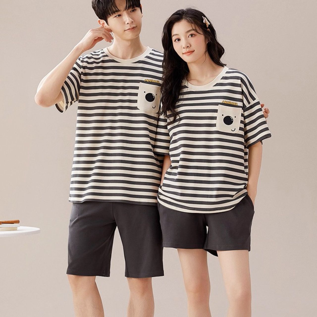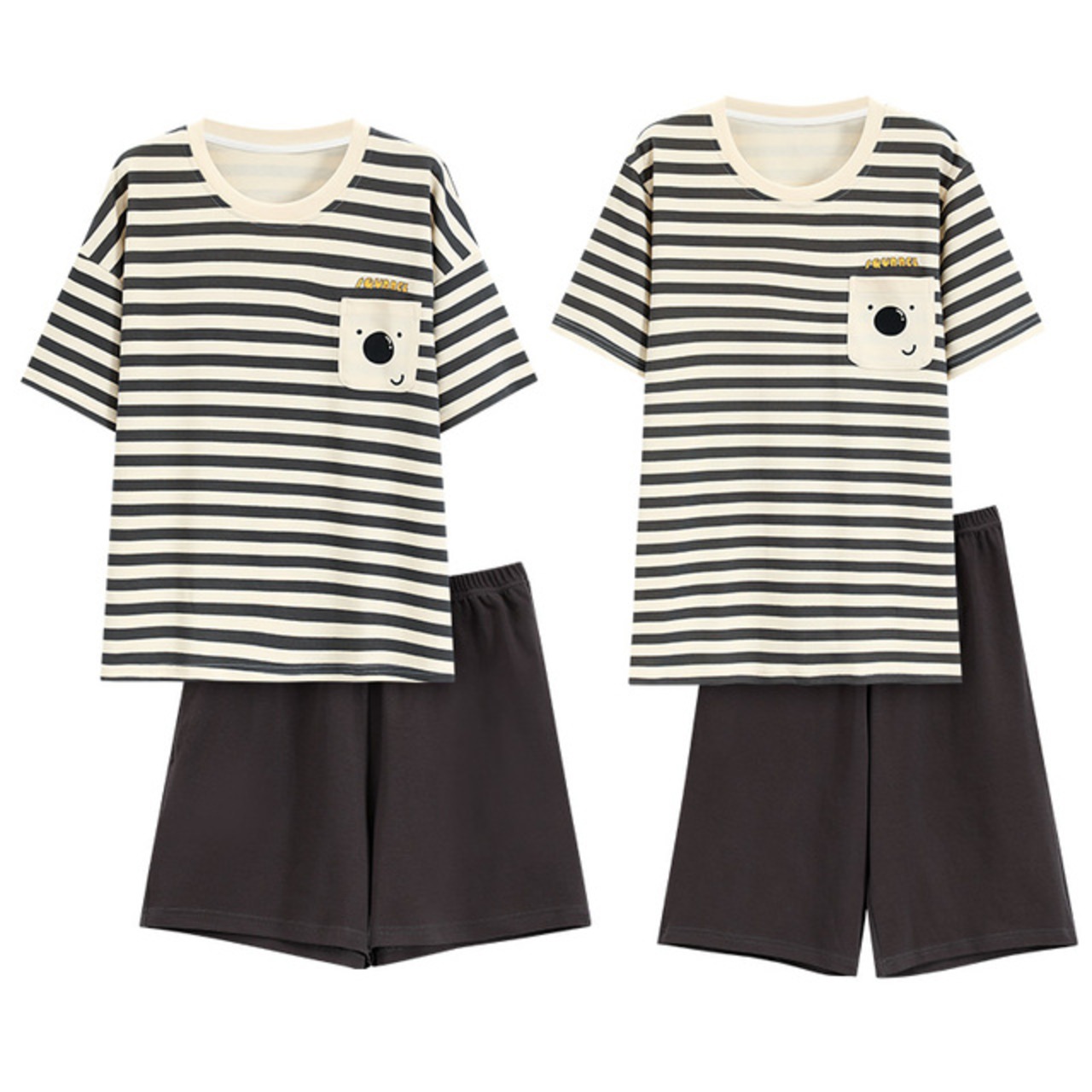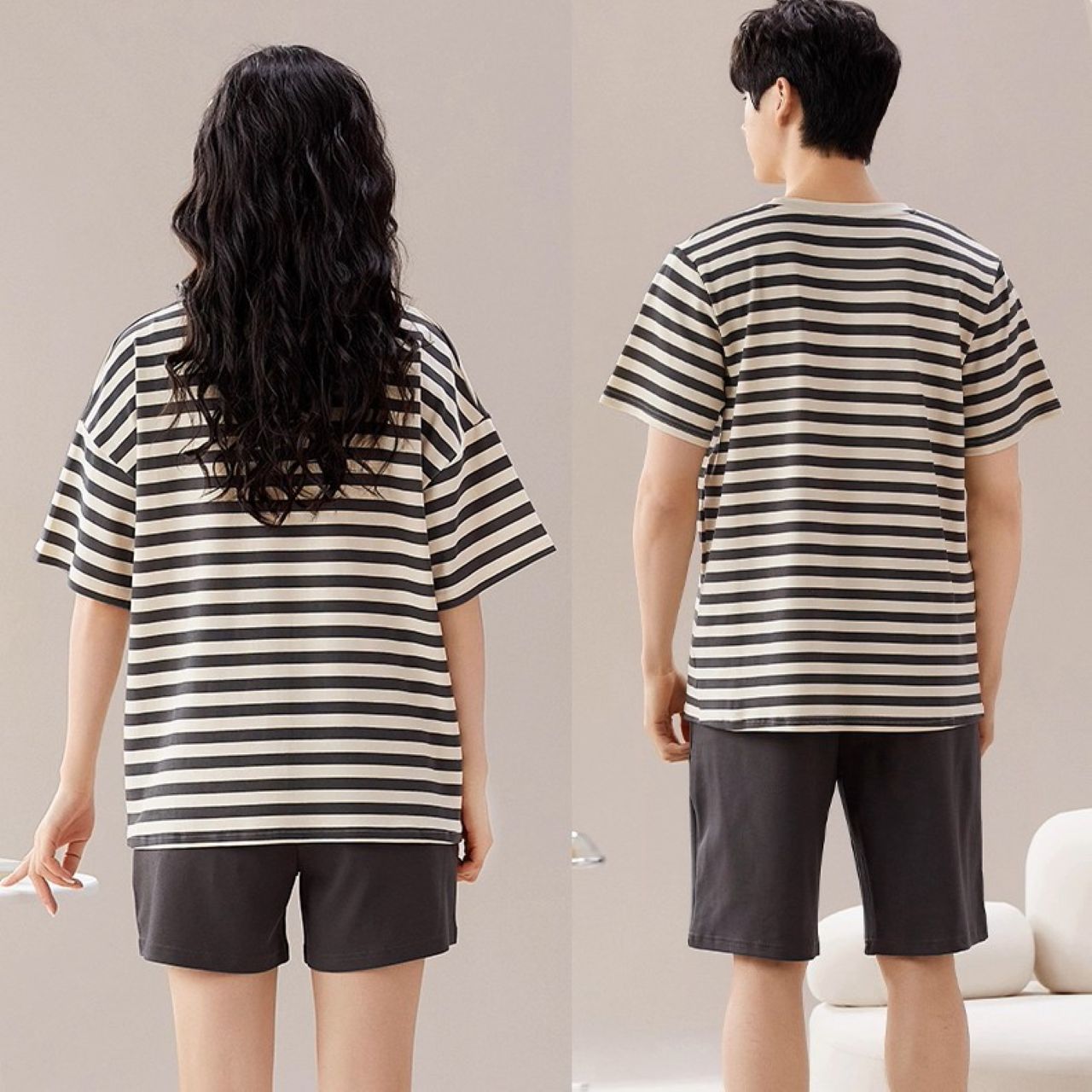 ペアルック 夏用ストライプパジャマ(薄手コットン、半袖)