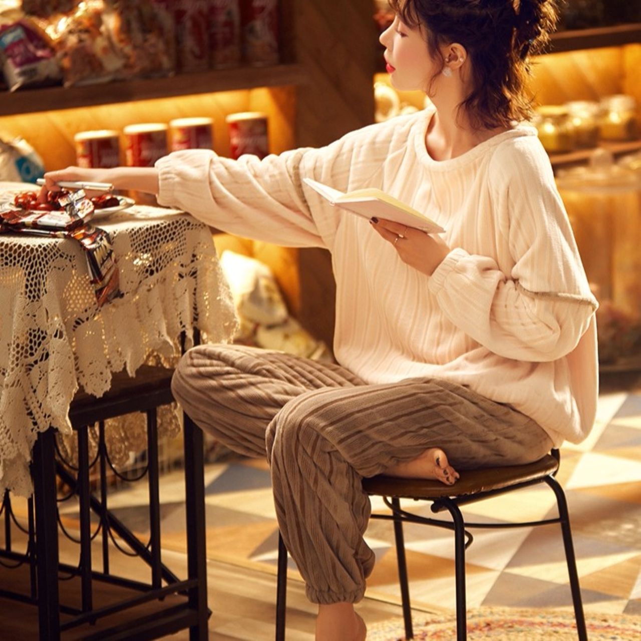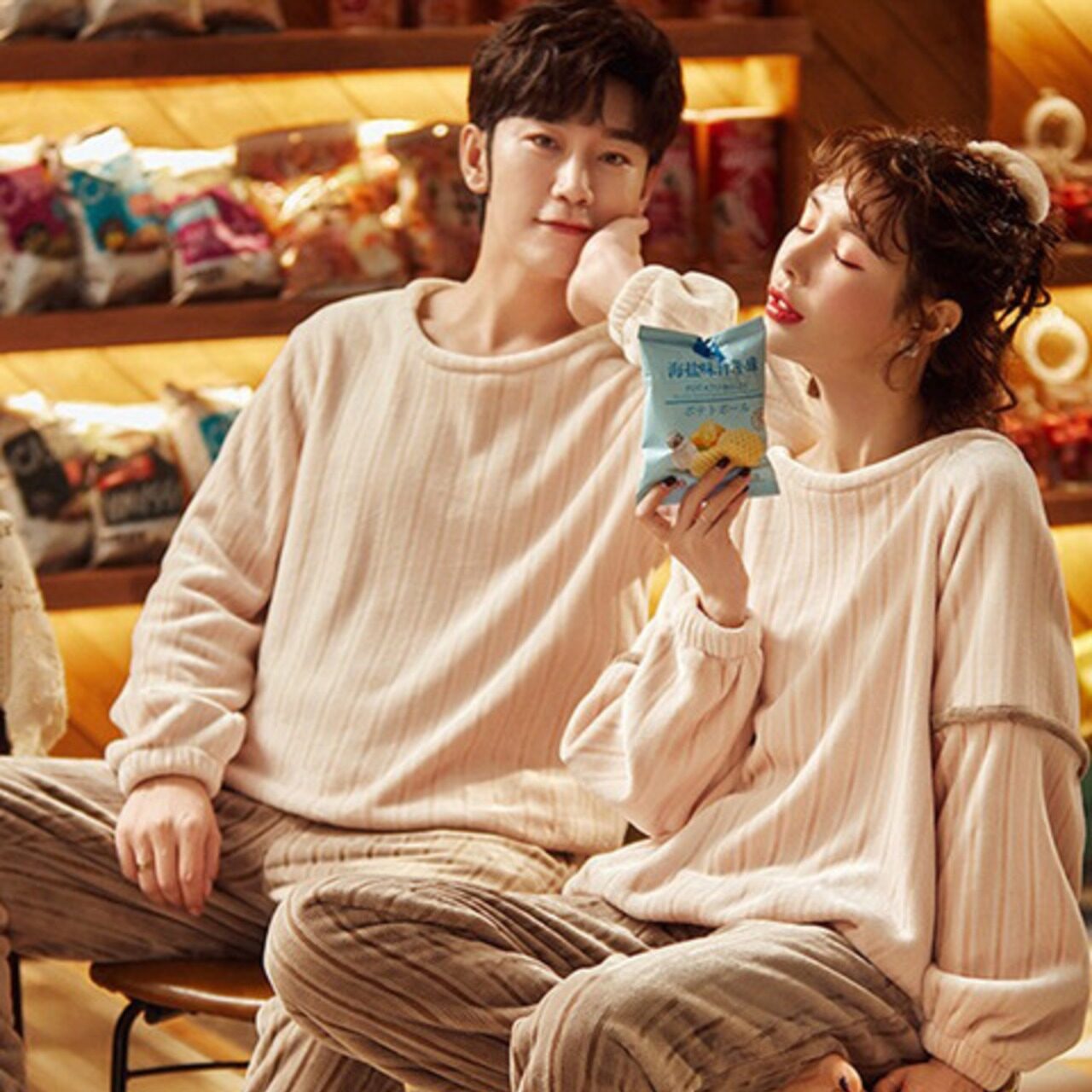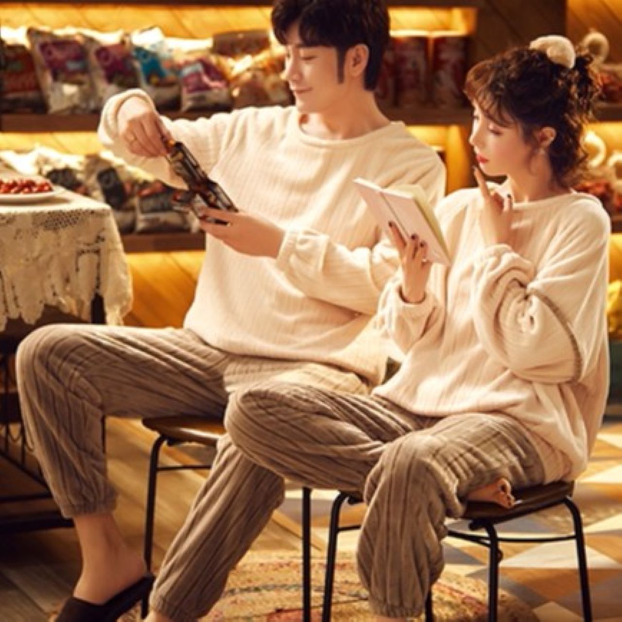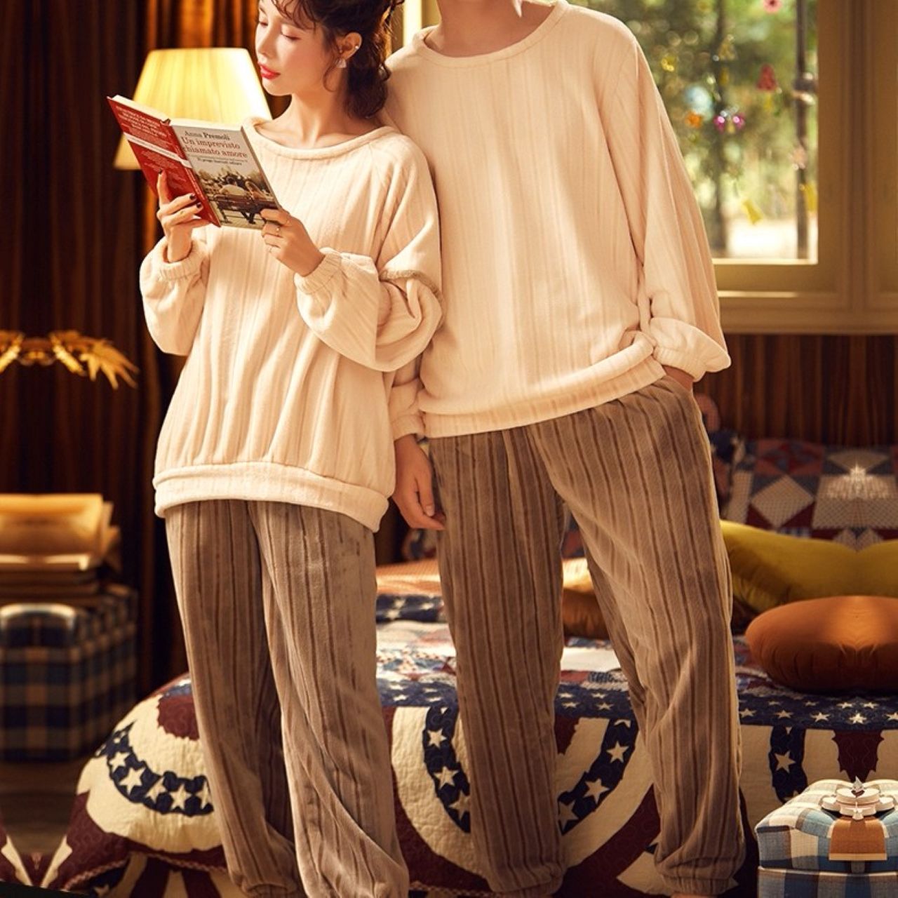 ペアルック ベージュ×ホワイト シンプルお揃いパジャマ