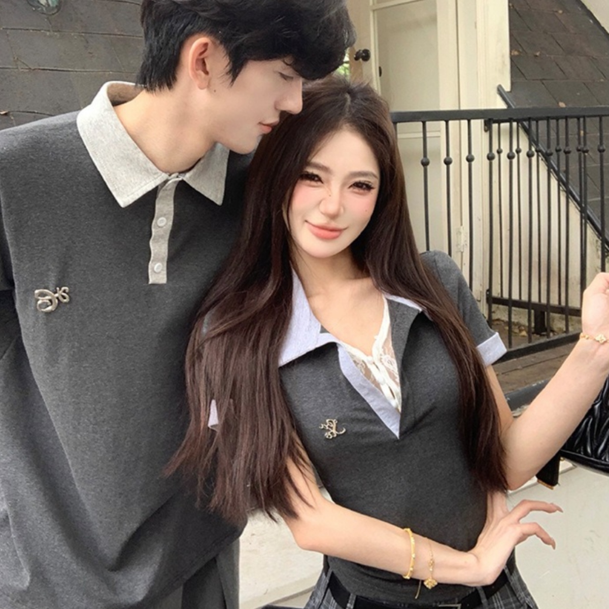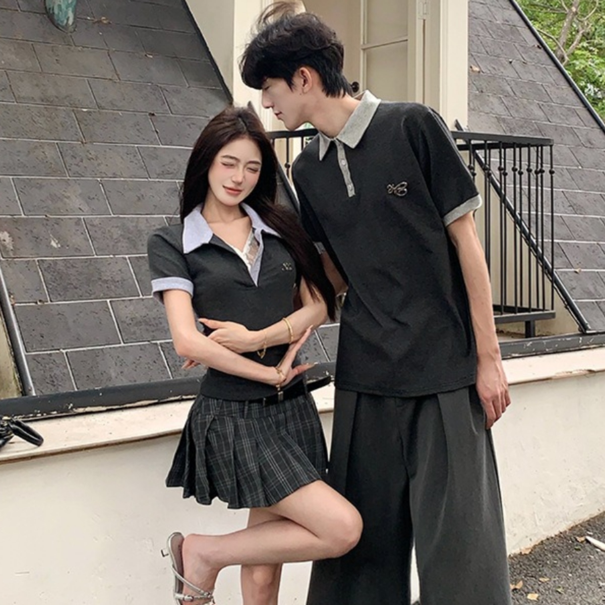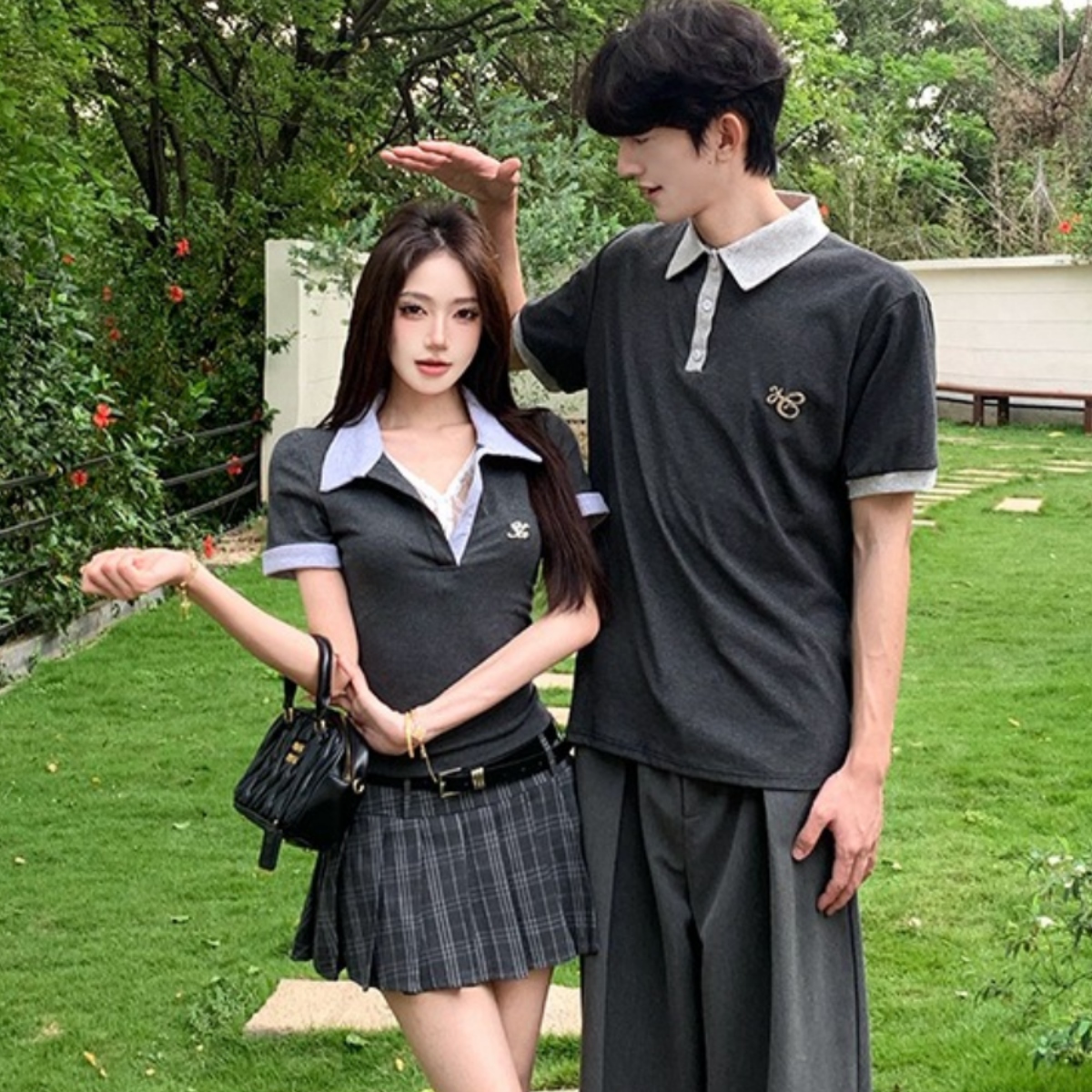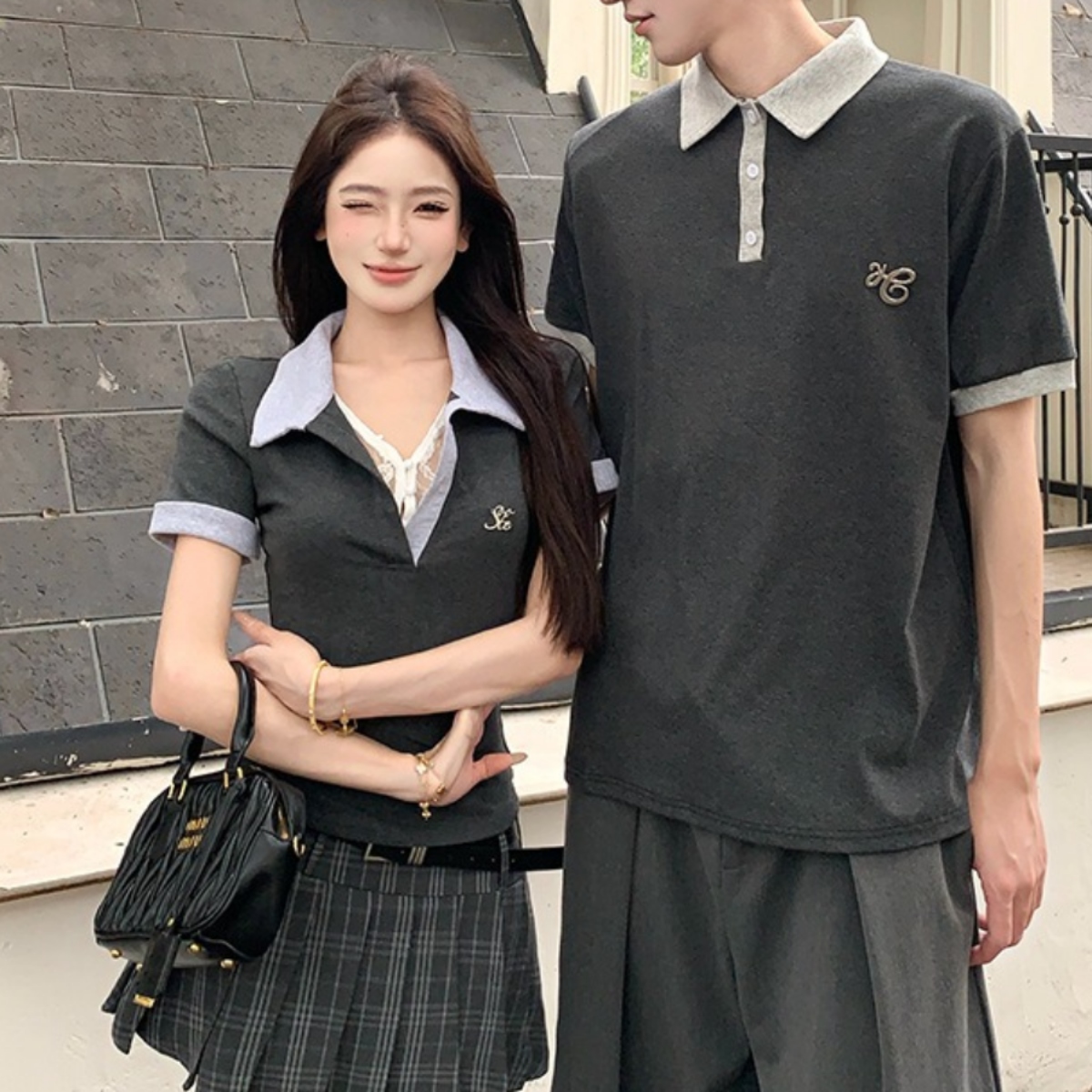 カップルペアルック クラシックグレー バイカラーポロトップス