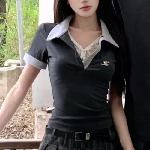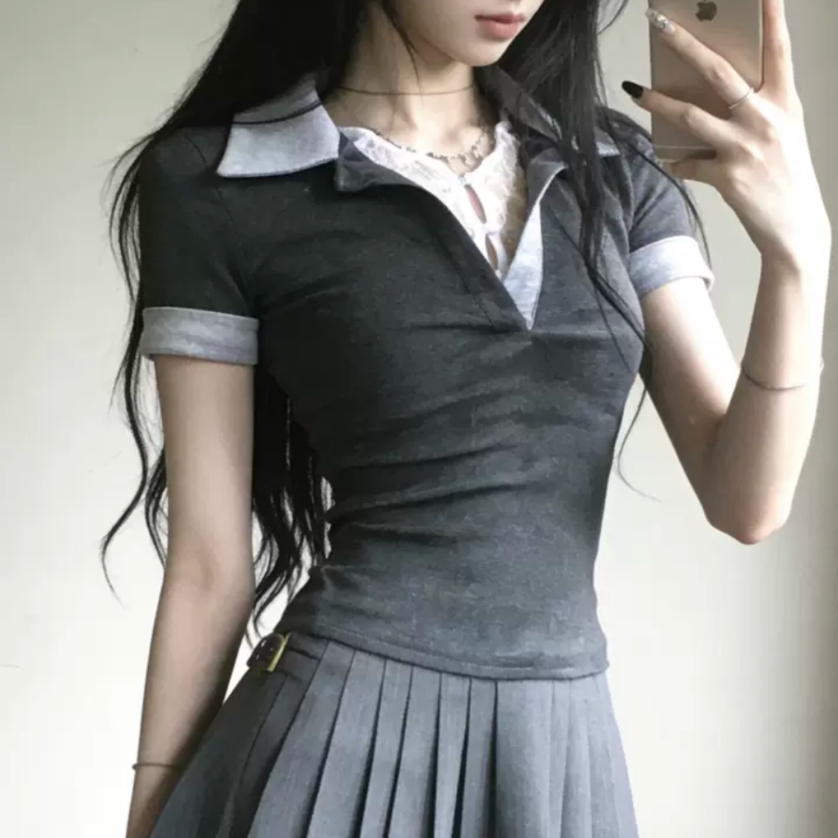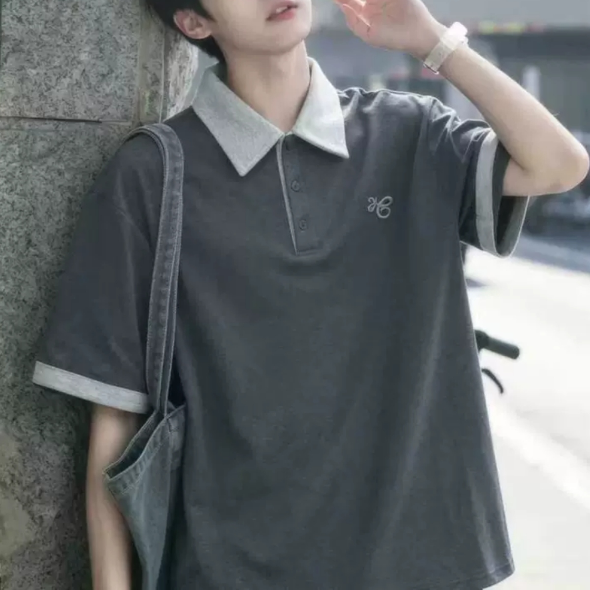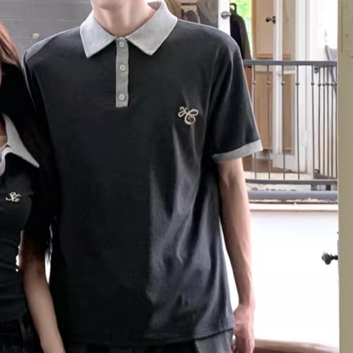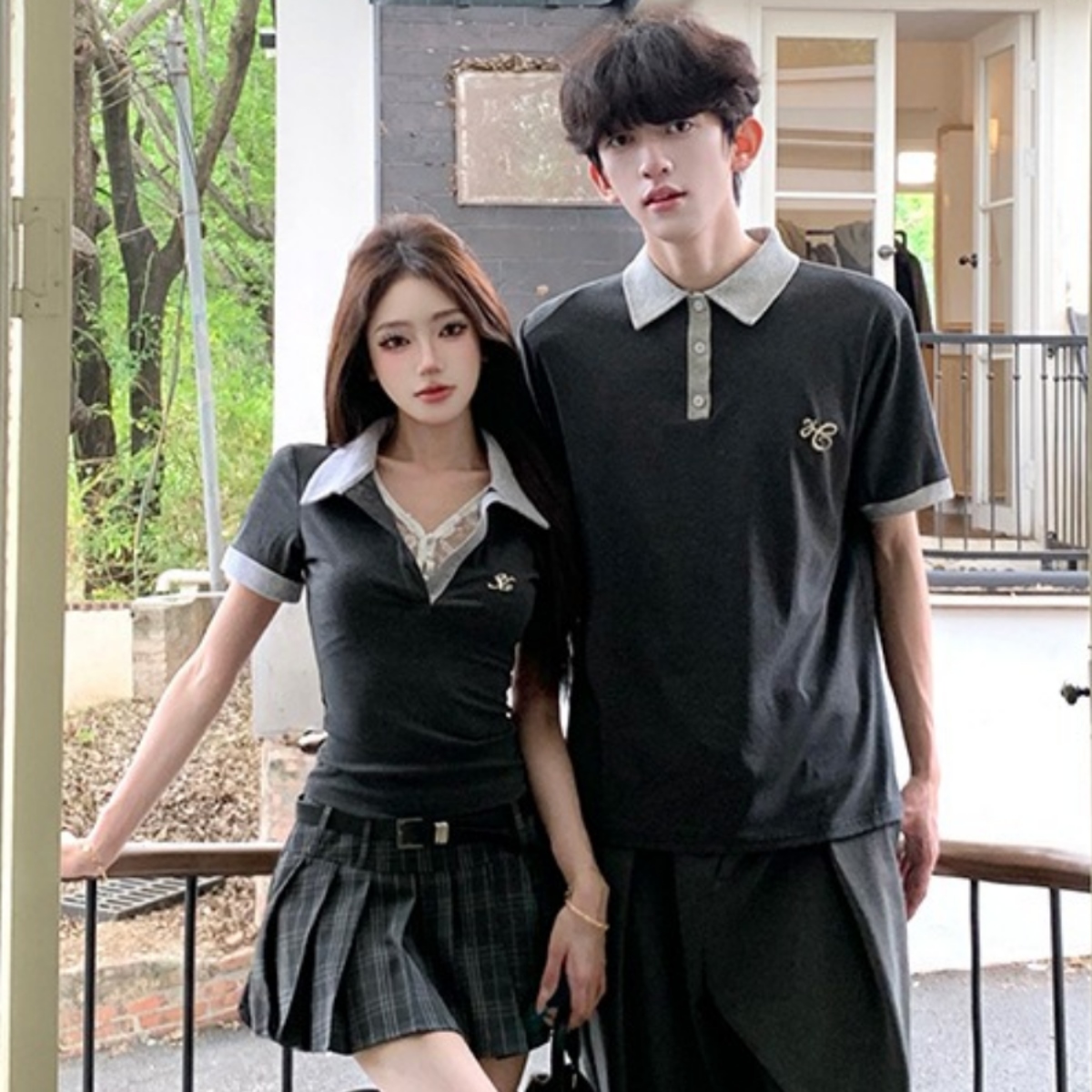 カップルペアルック クラシックグレー バイカラーポロトップス