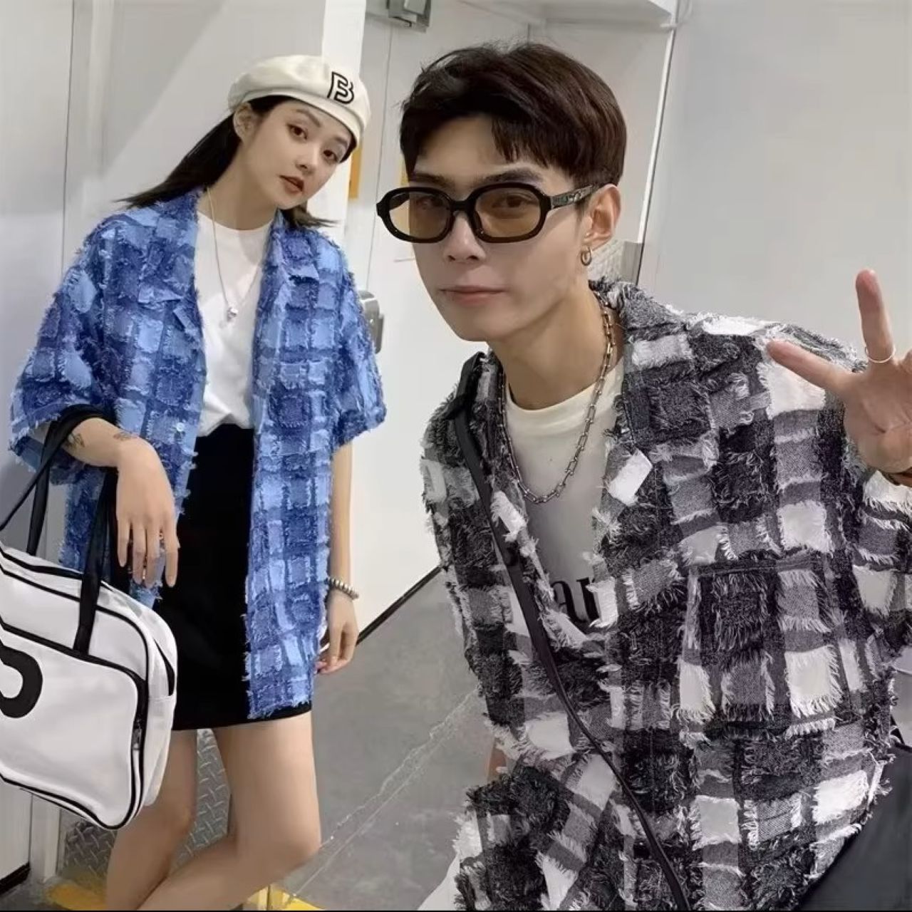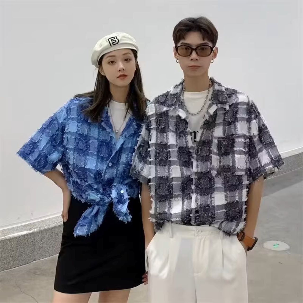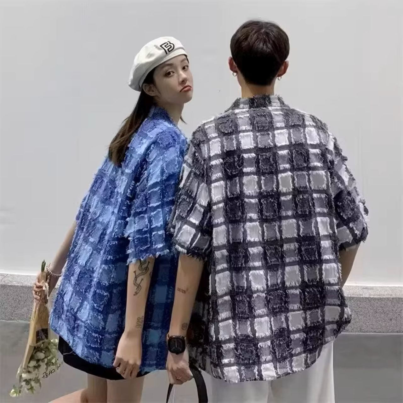 ペアルック 起毛チェック半袖シャツ ゆったりトレンドカップルウェア