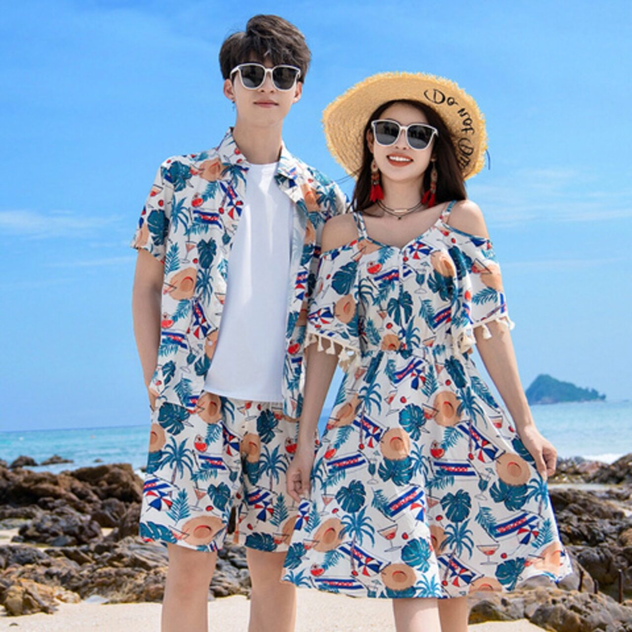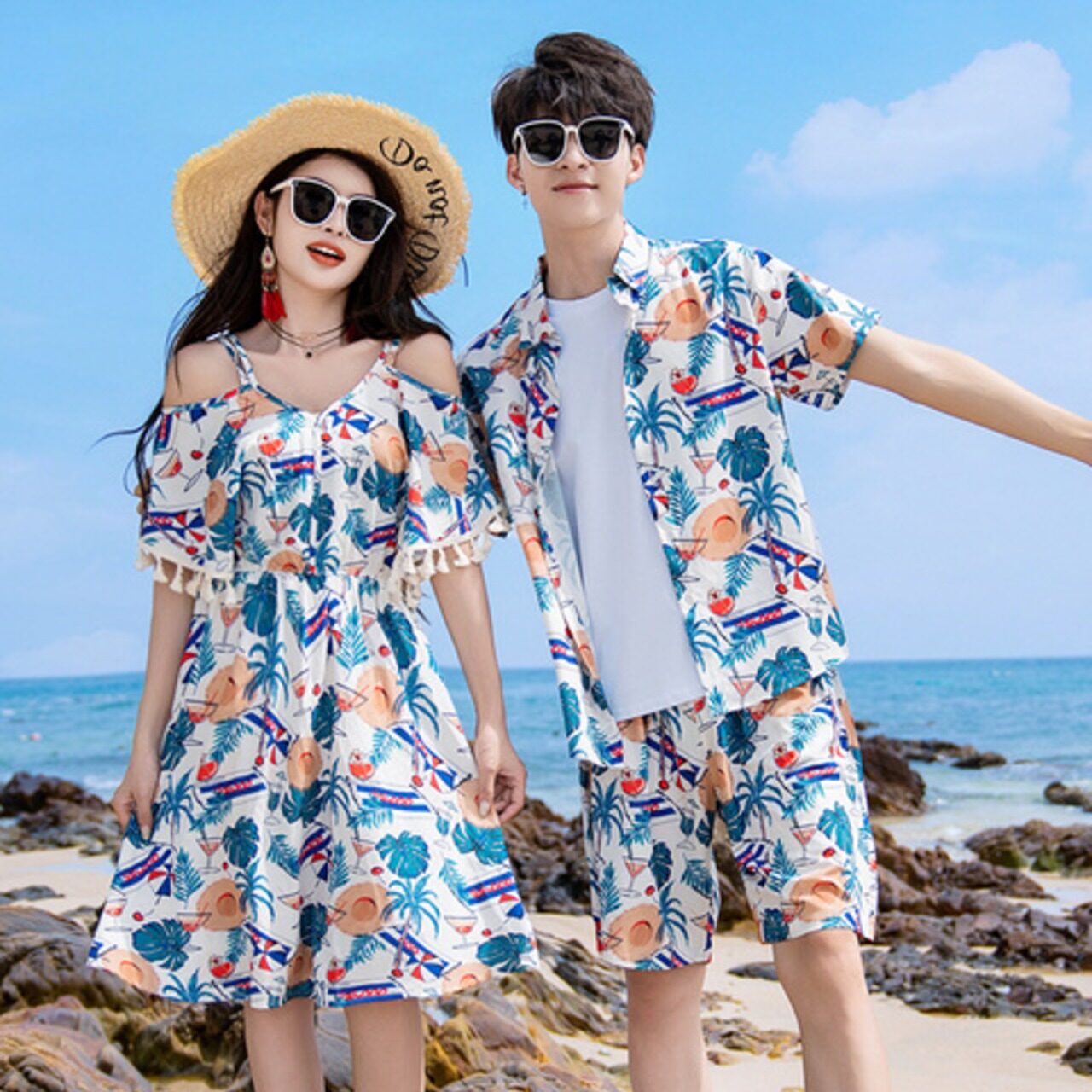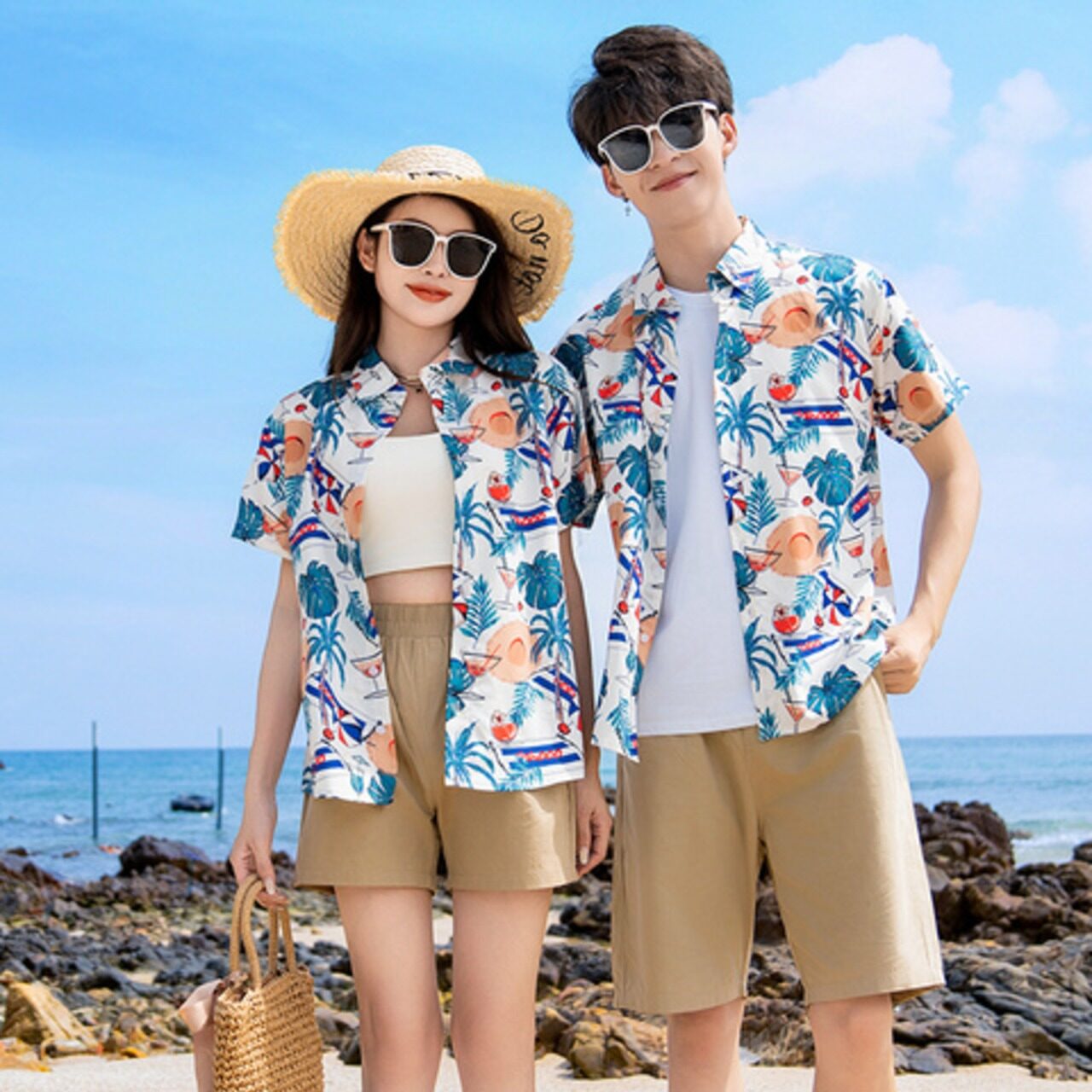 ペアルック 半袖シャツのビーチウェアセット 海辺や休暇にぴったり