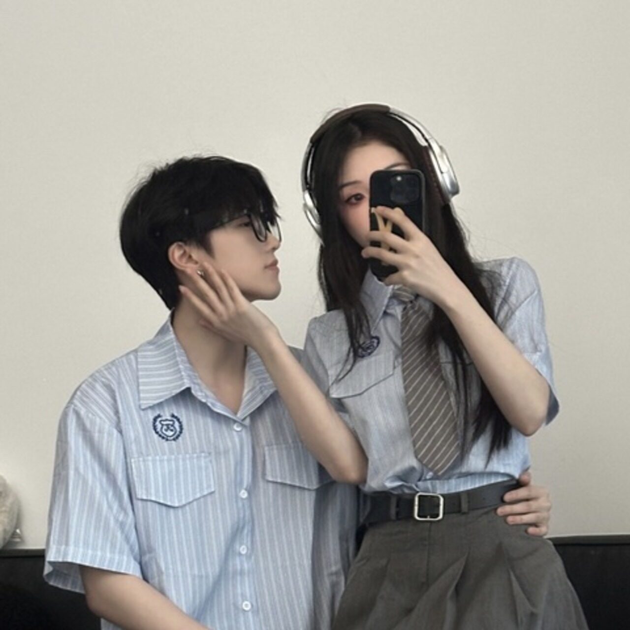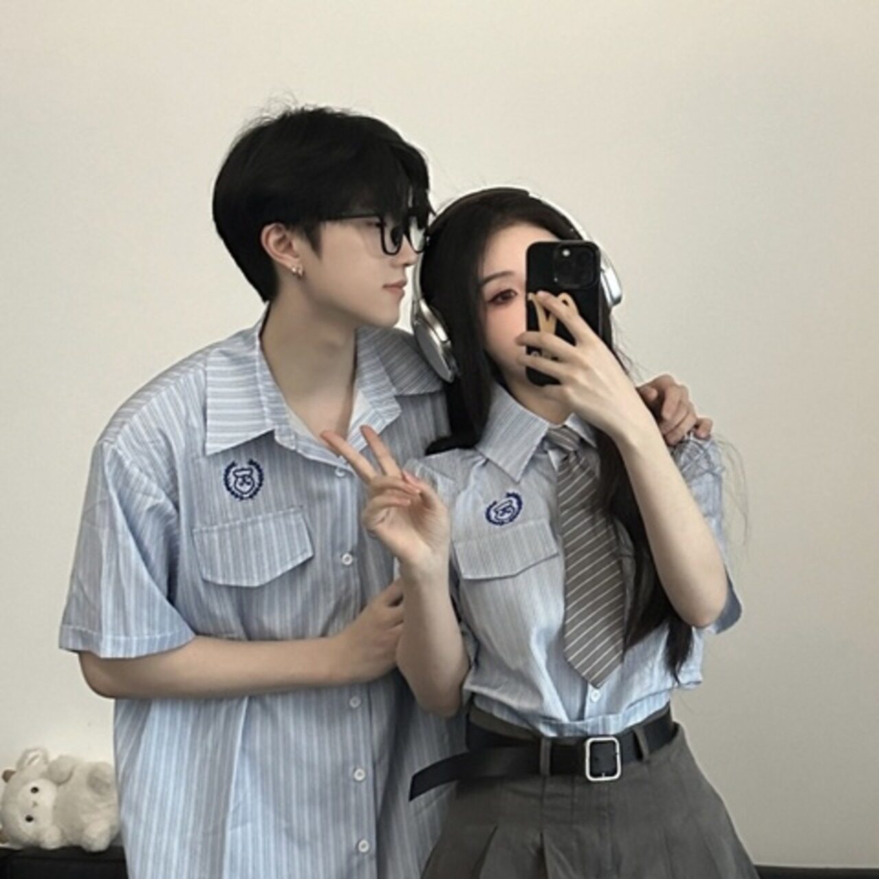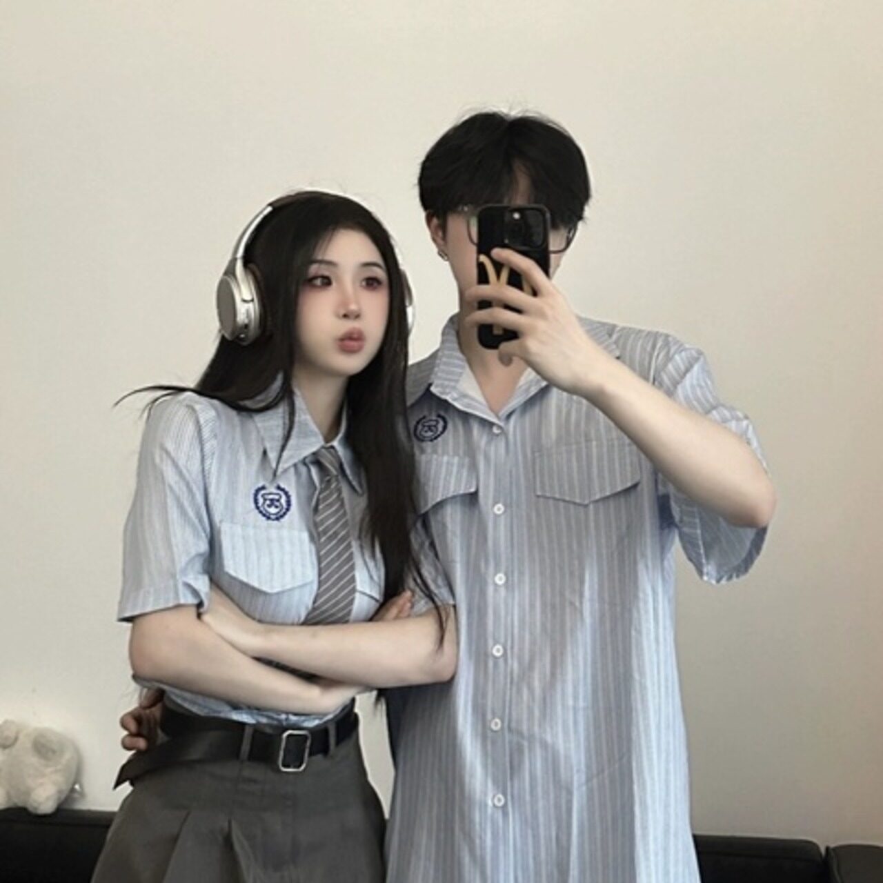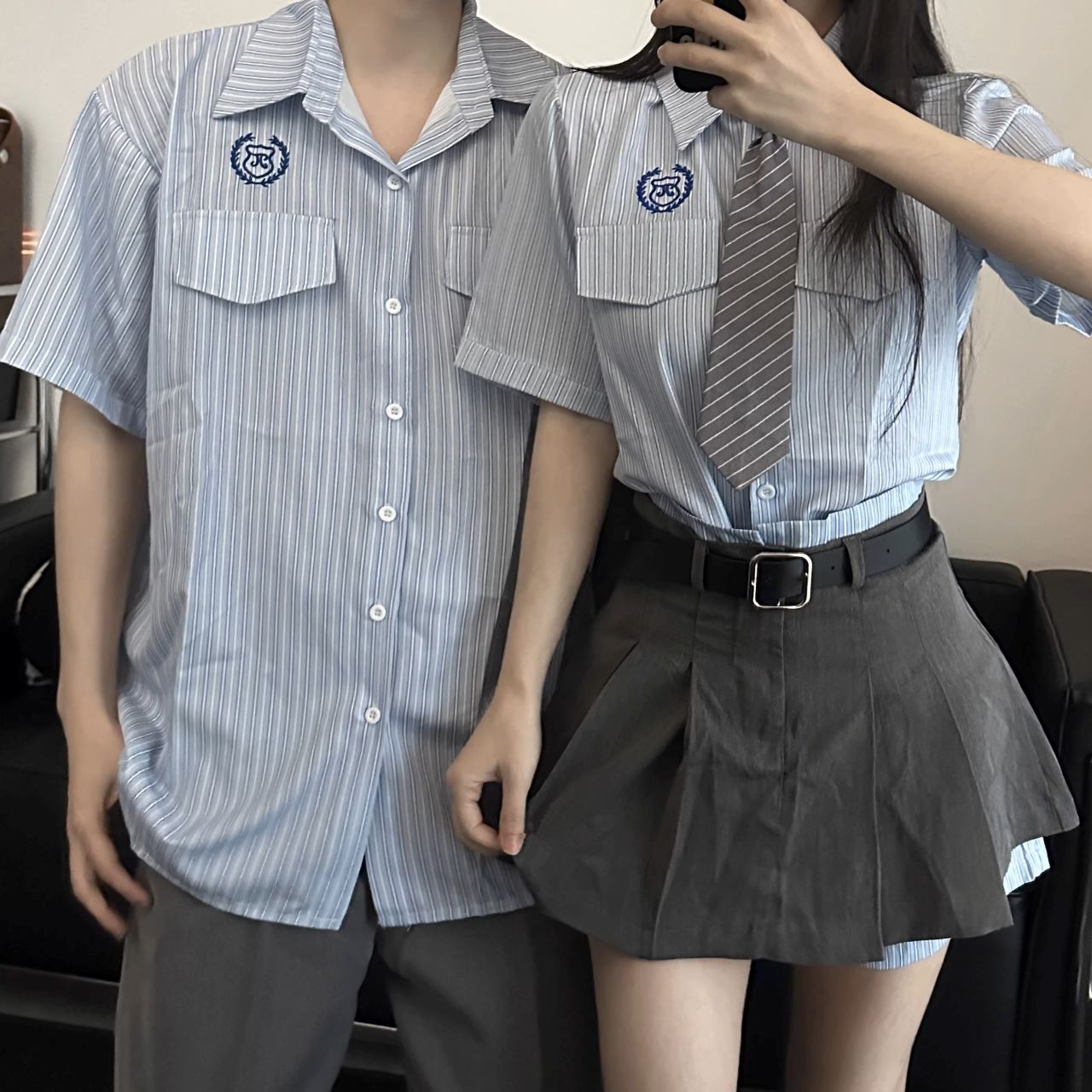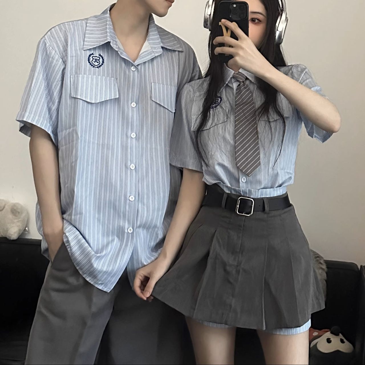 ペアルック カレッジ風ストライプ半袖シャツフレンチスカートスーツ ニッチデザイン