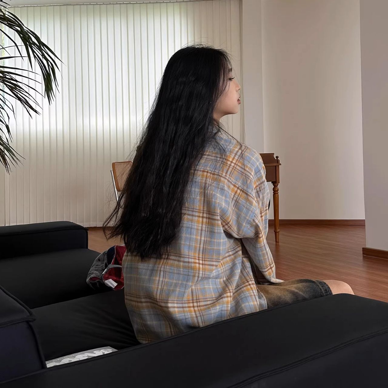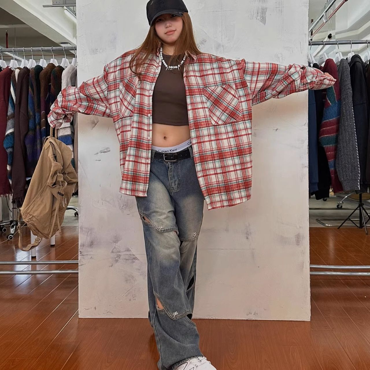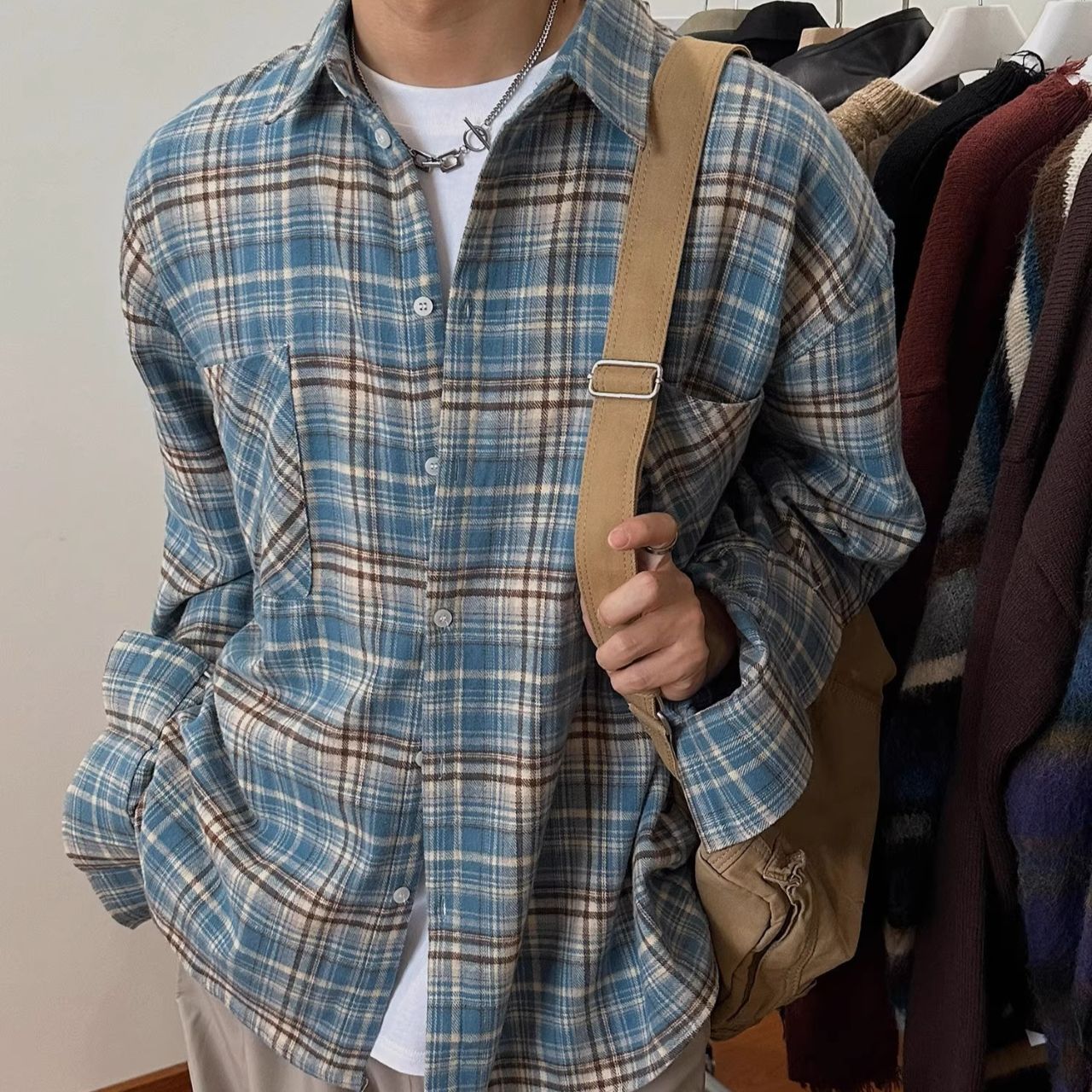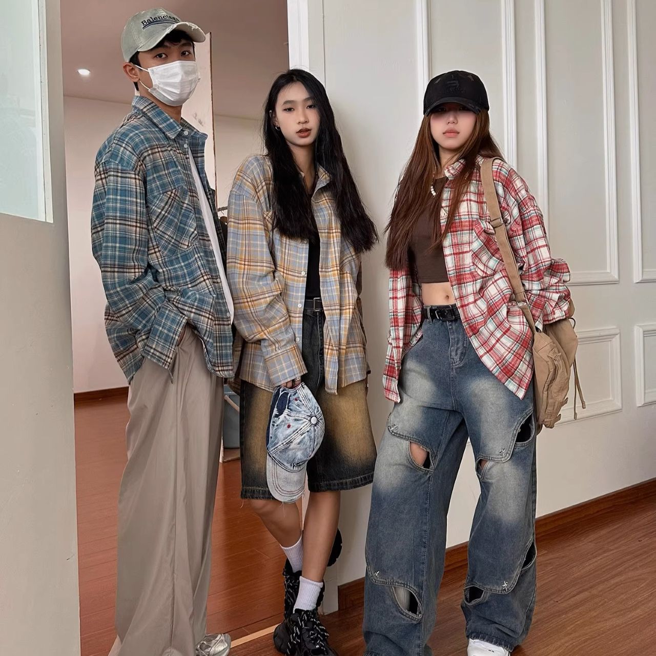 ペアルック アメリカンレトロ起毛チェック柄長袖シャツ 男女兼用レイジースタイル