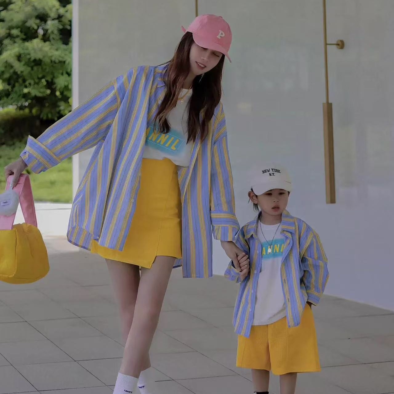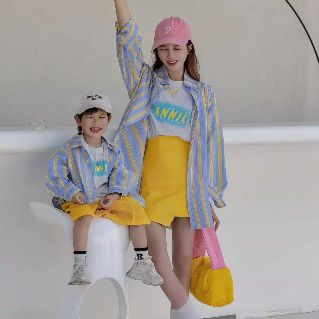 親子で楽しめる爽やかなブルー×イエローのストライプシャツ。清涼感ある配色が日常に華やぎを添えます。ゆったりシルエットで動きやすく、Tシャツやスカート、ショートパンツとも好相性。お出かけや記念日、カジュアルシーンまで幅広く活躍する一枚です。