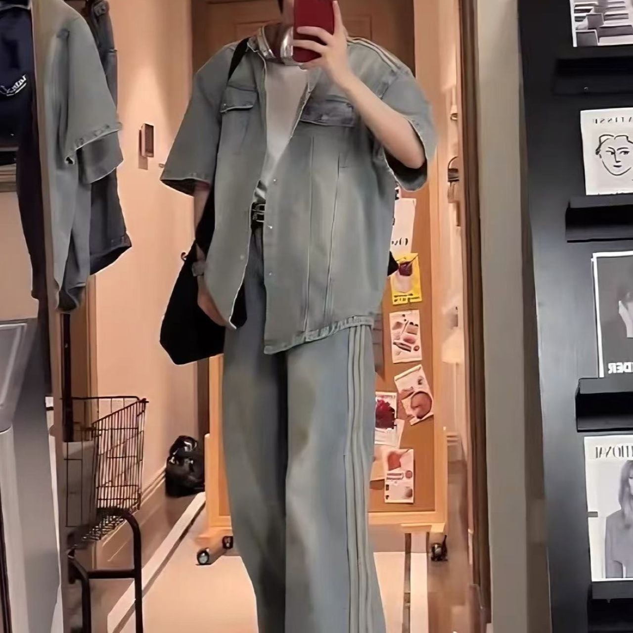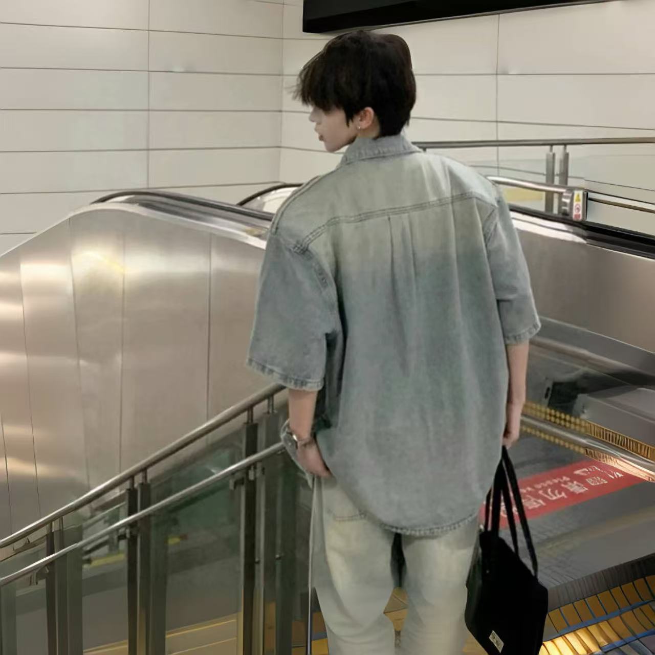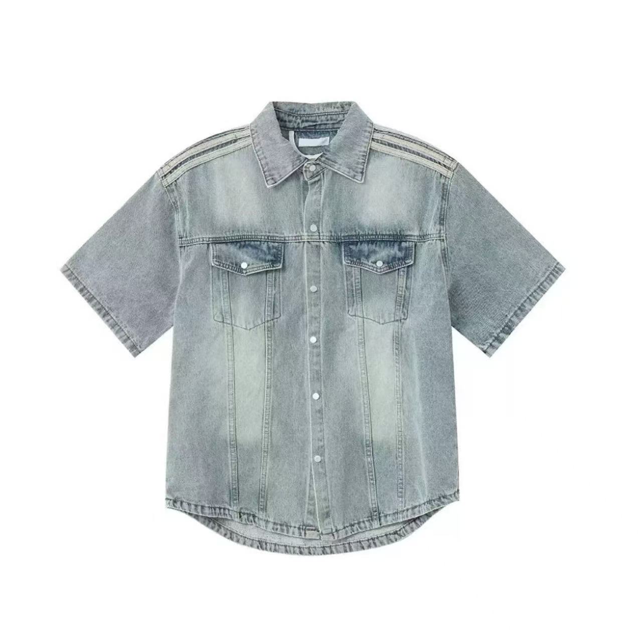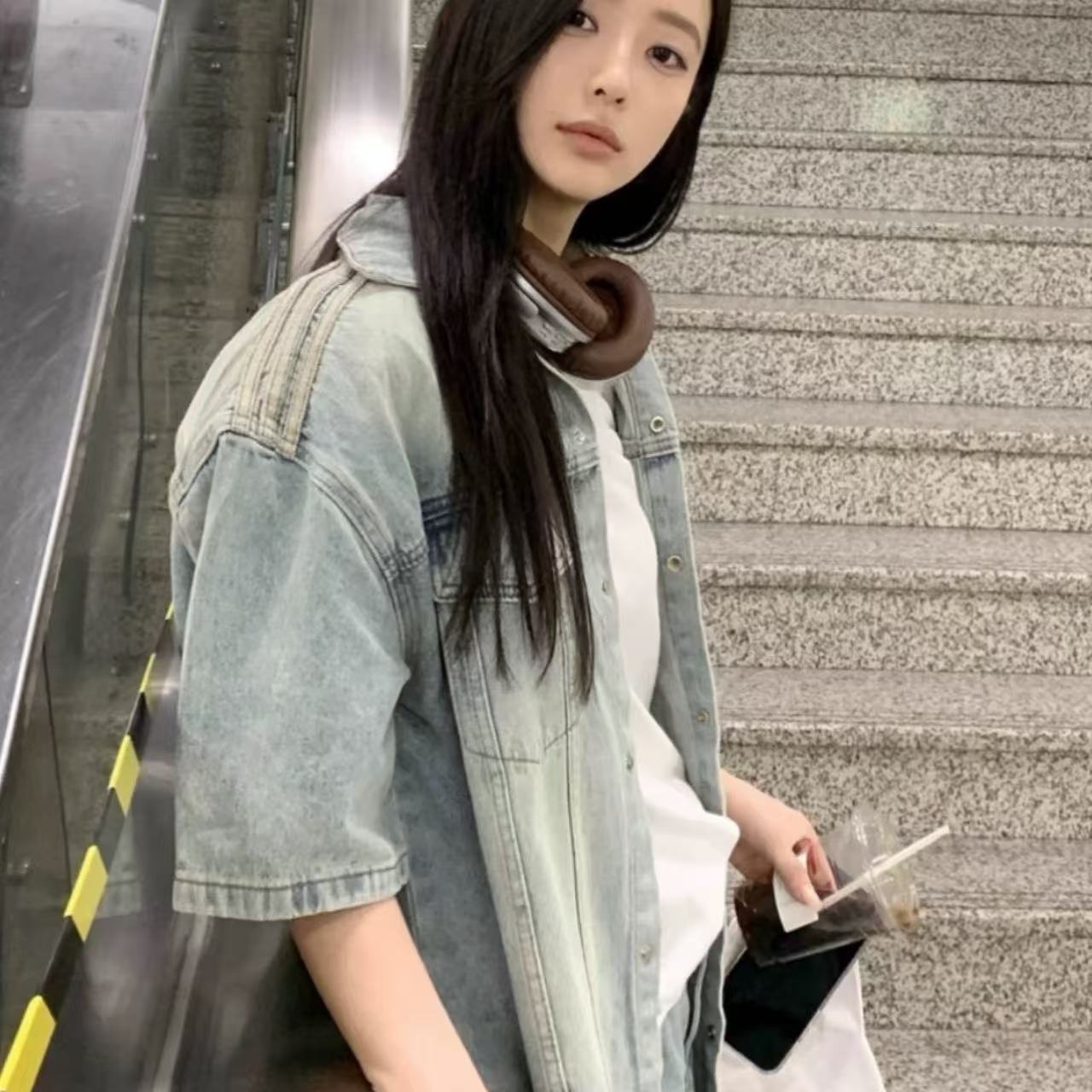 ペアルック アメカジ風 ライトデニムジャケット 五分袖 ショルダーライン
