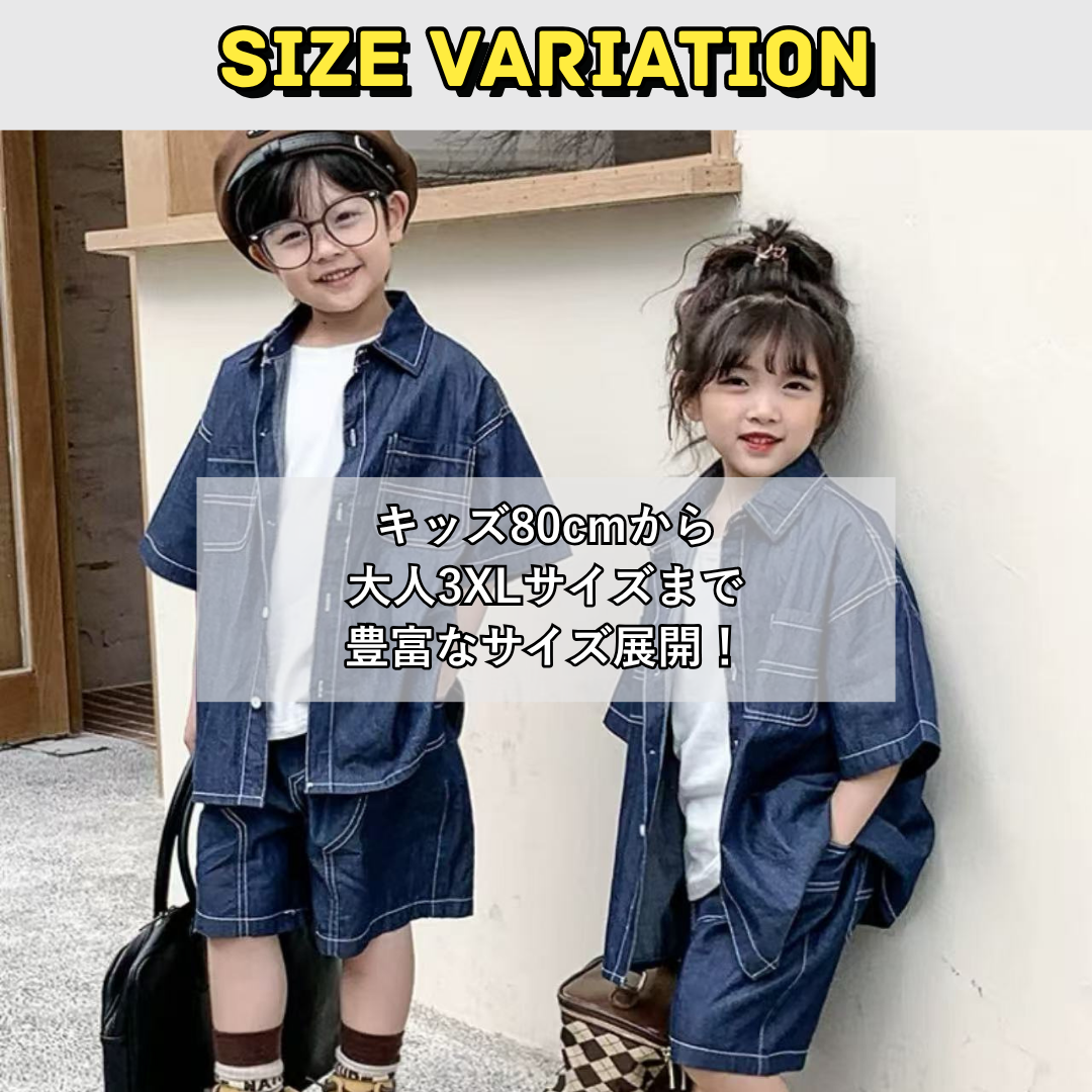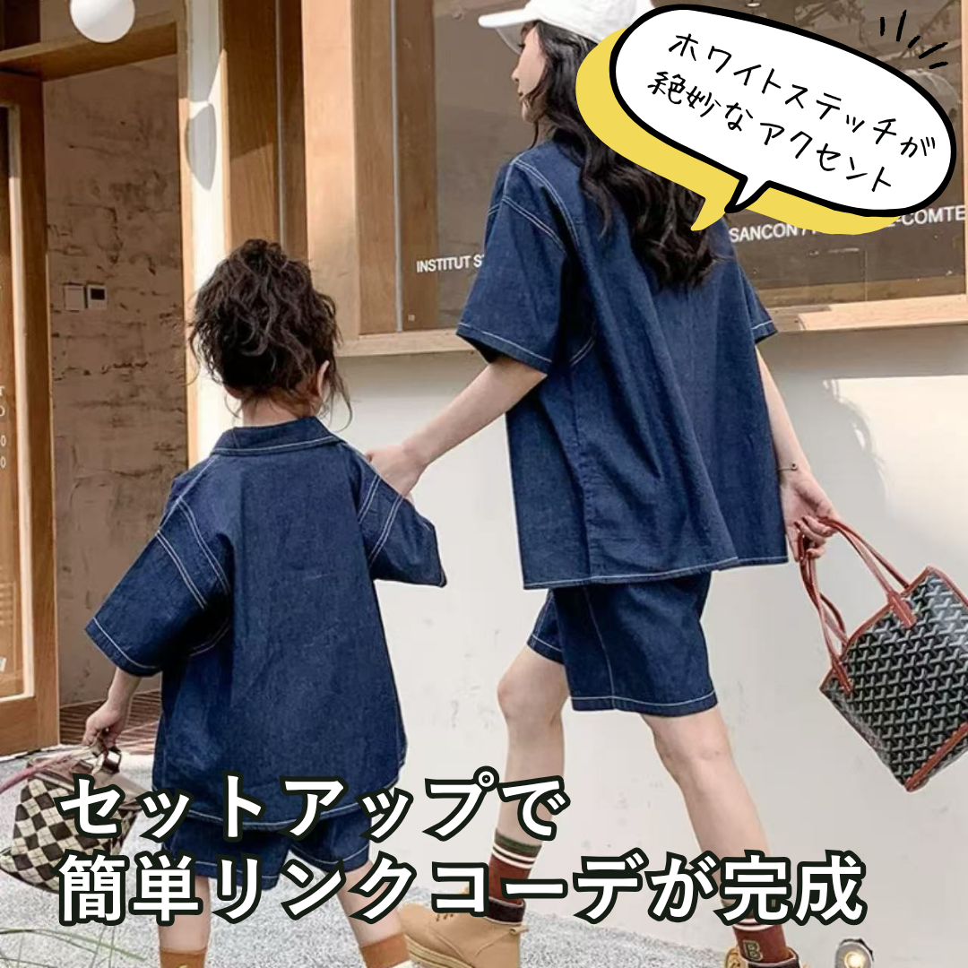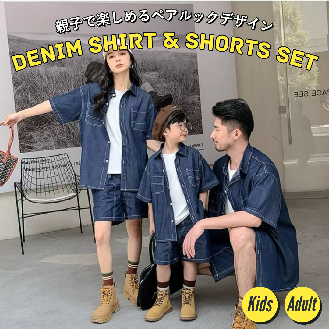親子ペアルック 薄手デニムシャツ&ショートパンツ リンクコーデセット