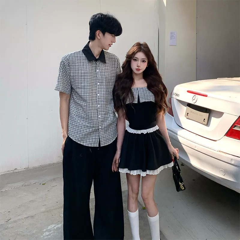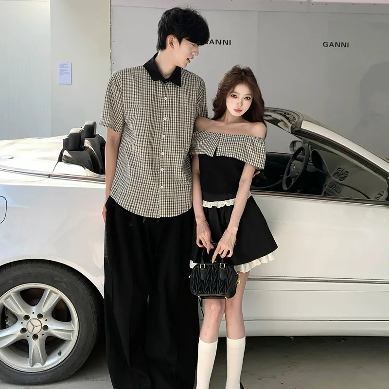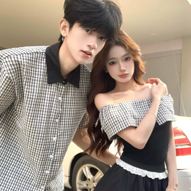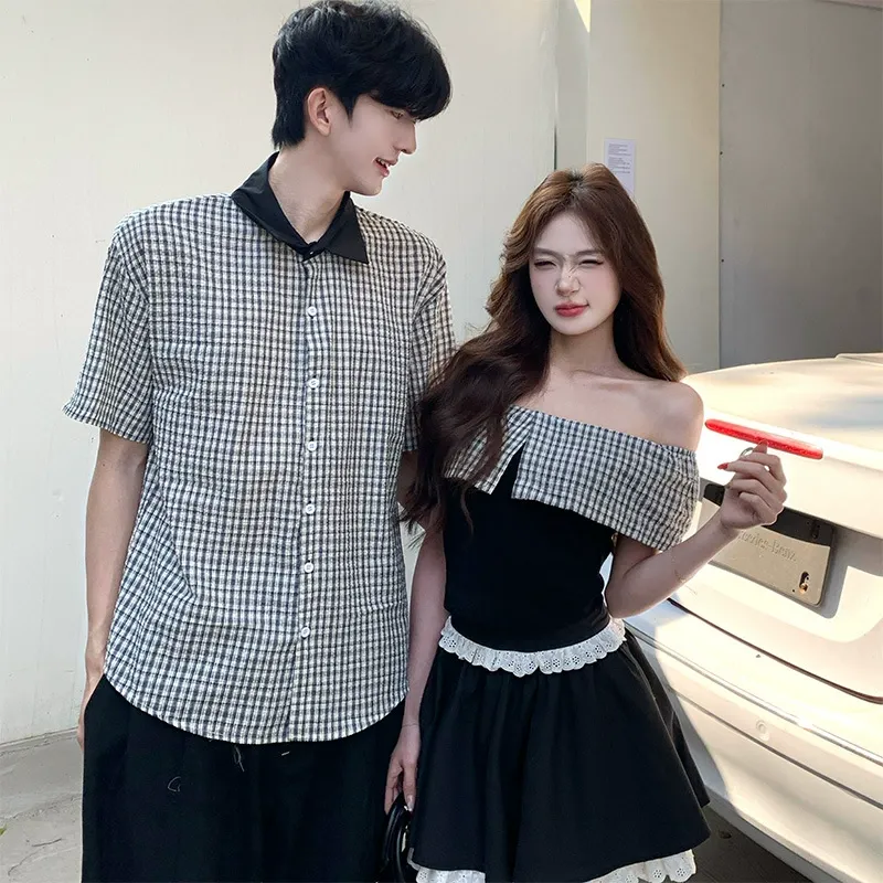 カップルペアルック ギンガム・モノクロームシャツ オフショルセットアップ