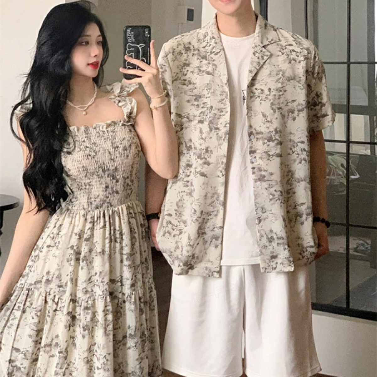 カップルペアルック 淡色ボタニカル シャツ&ワンピース