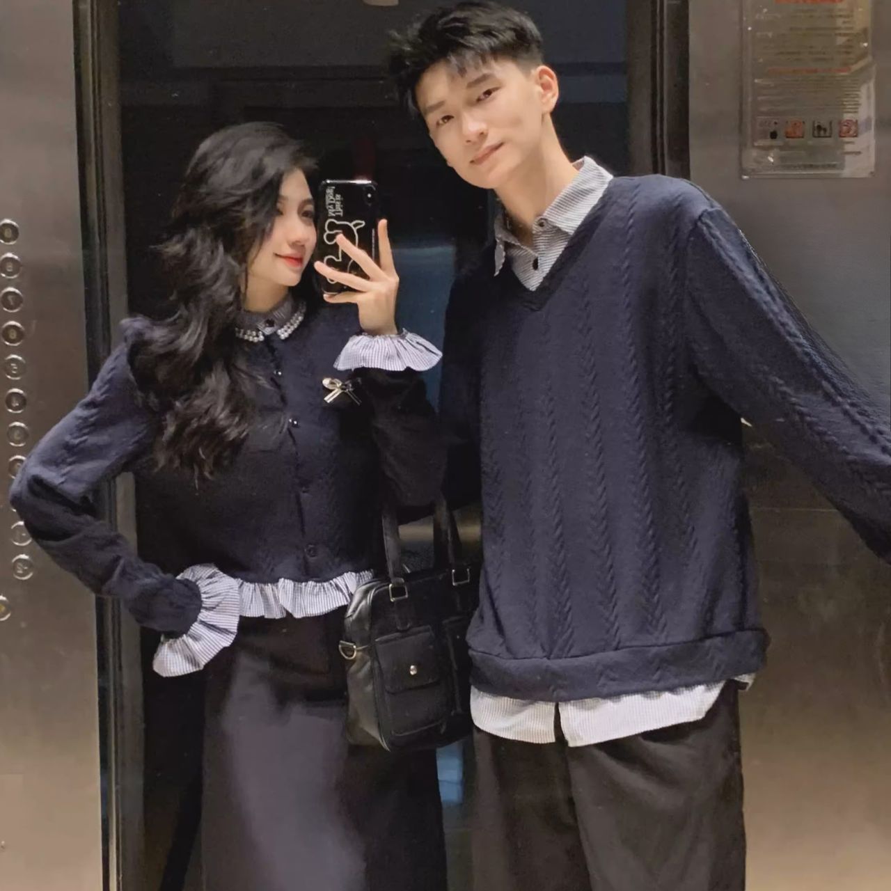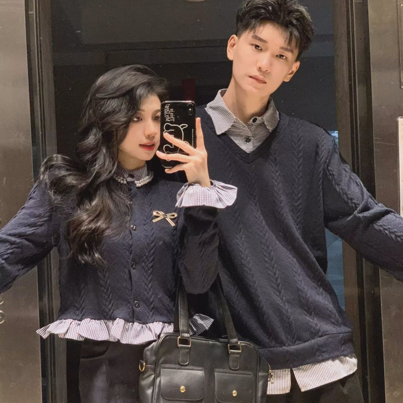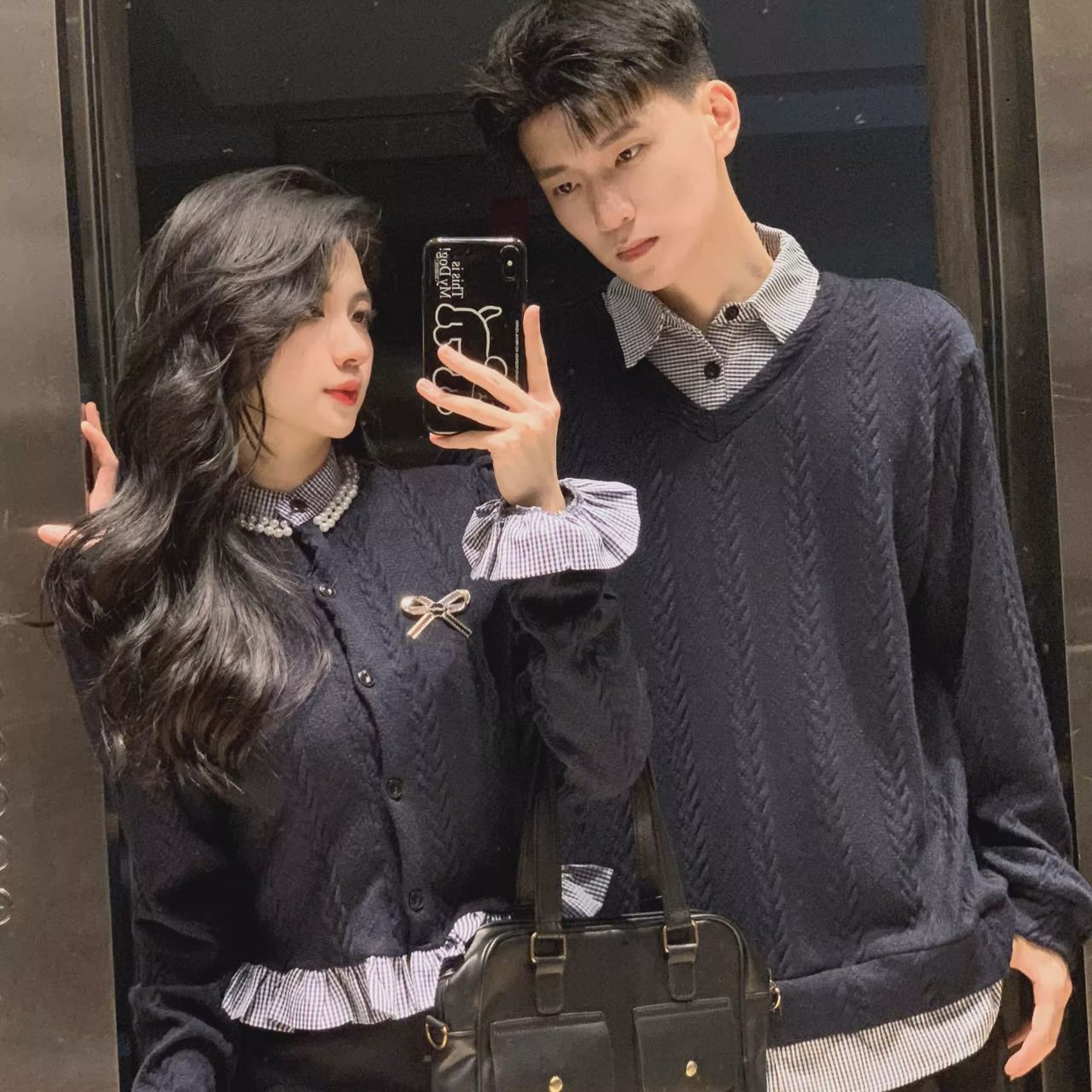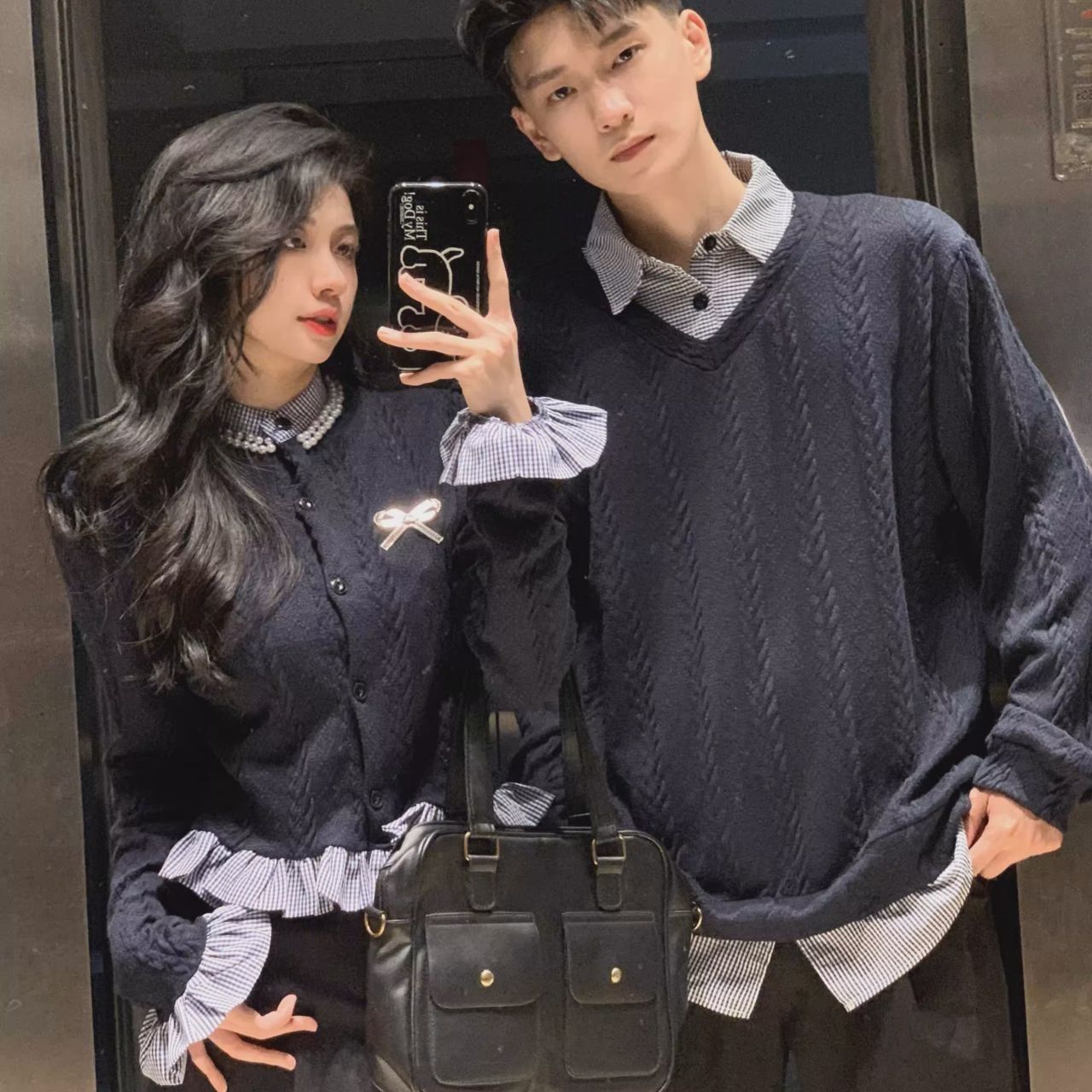 カップルペアルック【レイヤード風ケーブルニット】は、柔らかな素材とケーブル編みが魅力のトレンドアイテムです。ネイビーのギンガムチェックシャツを重ね着したようなデザインで、一枚でコーデが完成します。レディースはフリルを効かせたカーディガン、メンズはシンプルなセーター仕様で統一感のあるシミラールックに。デートや休日のお出かけなど、幅広いシーンで活躍し、二人の絆をさりげなく引き立てます。