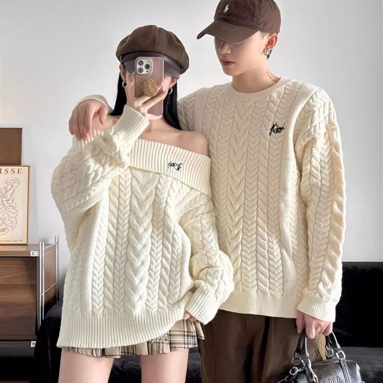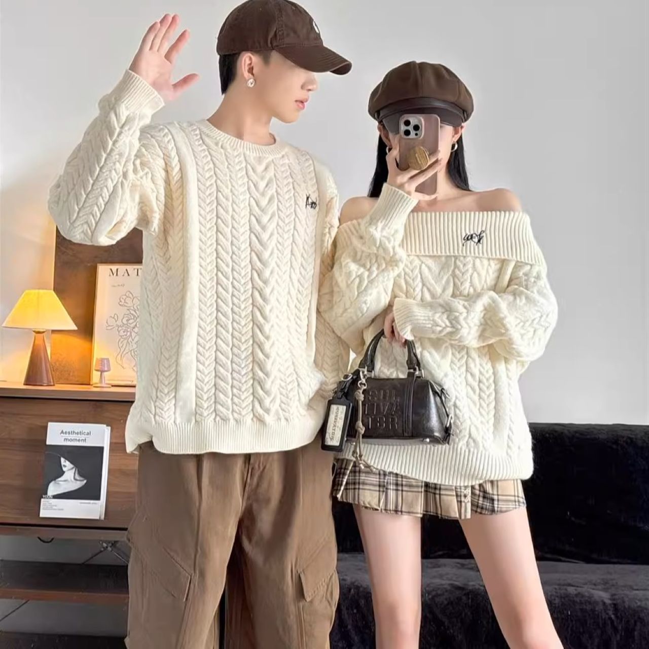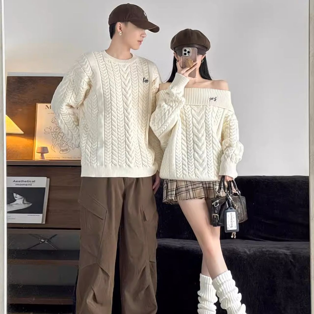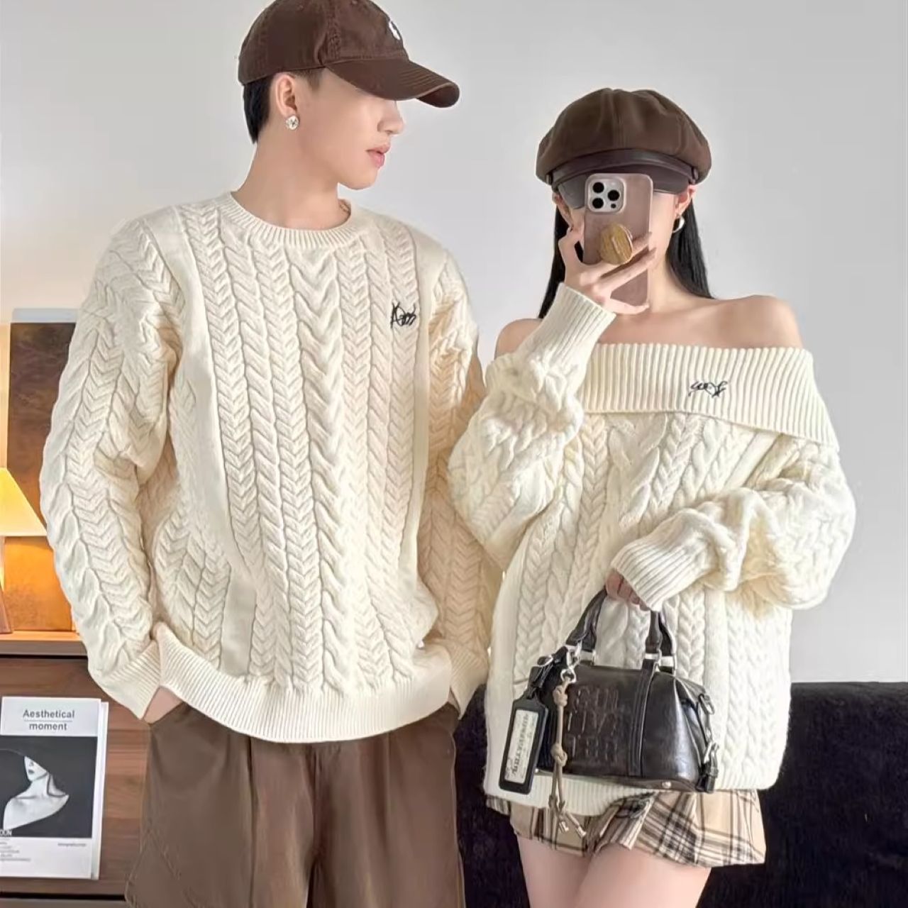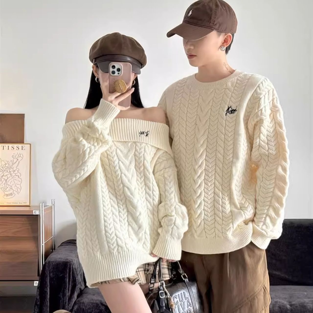 カップルペアルック【ゆったりケーブルニット ホワイト】は、温かみと上品さを兼ね備えたアイテムです。ふんわりとしたケーブル編みが柔らかな印象を与え、シンプルながらも存在感のあるスタイルを演出します。胸元の刺繍がさりげないお揃いポイント。レディースはオフショルダー風にも着こなせ、自然にシミラールックが完成します。デートやお出かけ、特別な日にもぴったりの一着です。