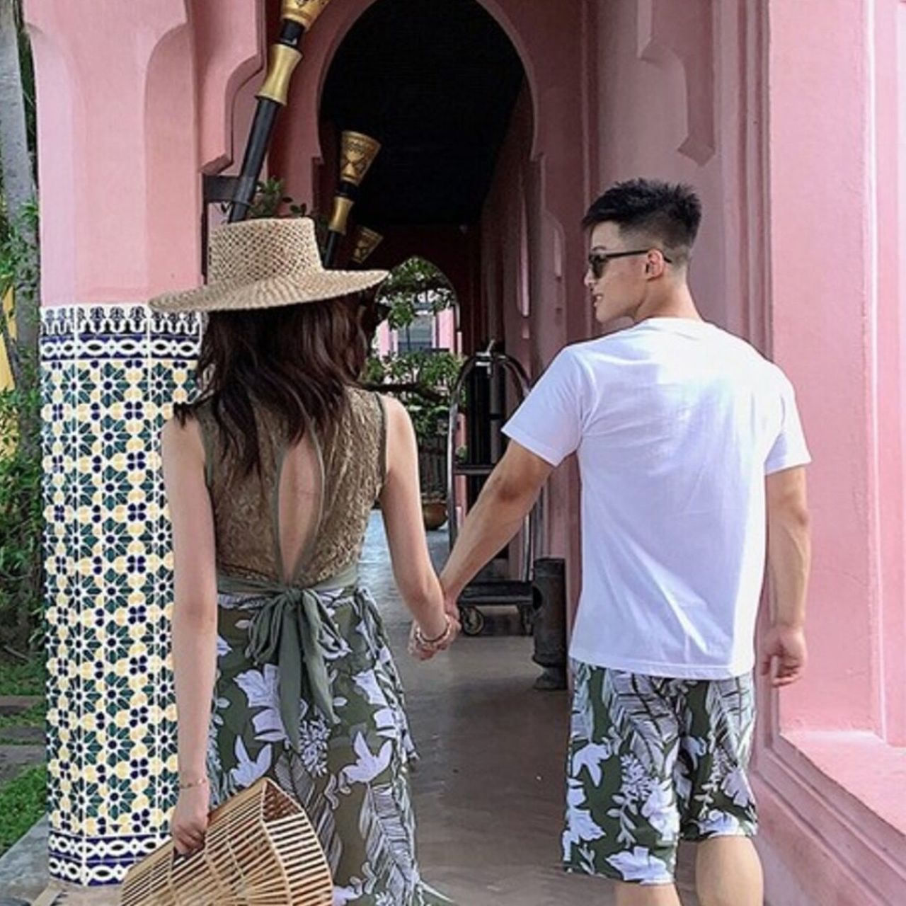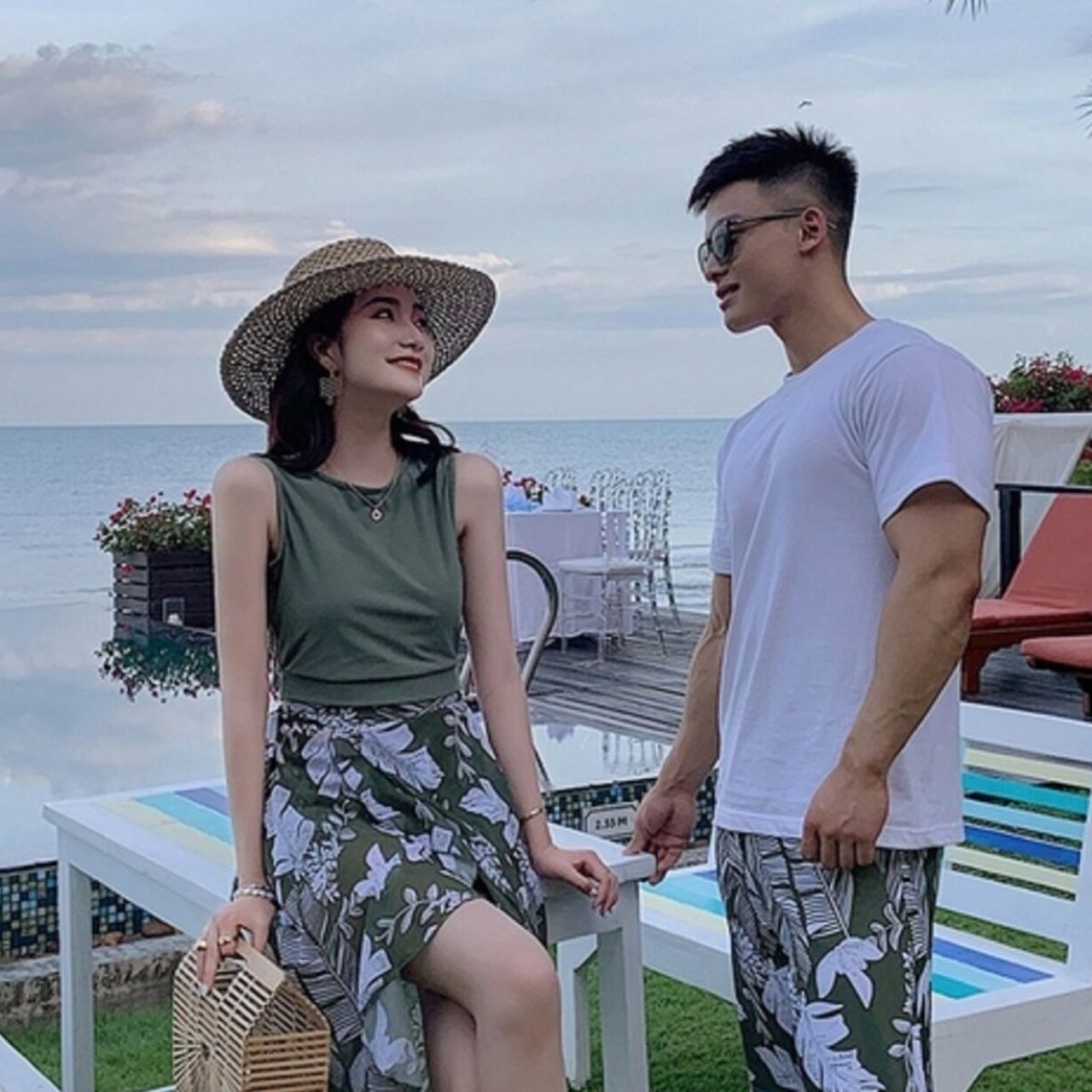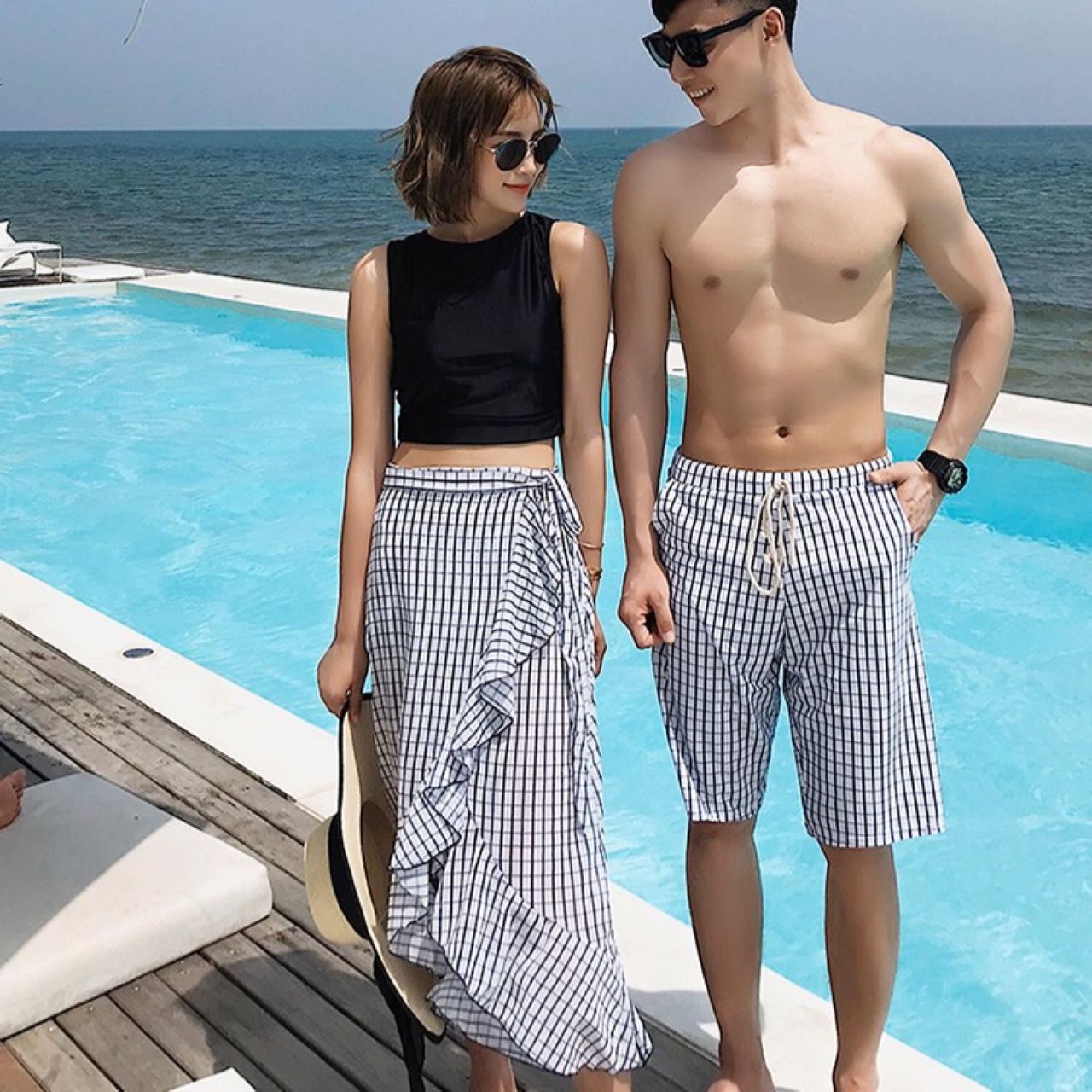 爽やかなチェック柄とリーフ柄を組み合わせた、トレンド感たっぷりのペアルック水着セットです。レディースはロングスカート・トップス・ショートパンツの3点セットで、体型カバーとおしゃれ見えを両立。メンズは同柄のシンプルなスイムパンツで、さりげないリンクコーデを楽しめます。カップルで夏のスタイルを満喫できるアイテムです。