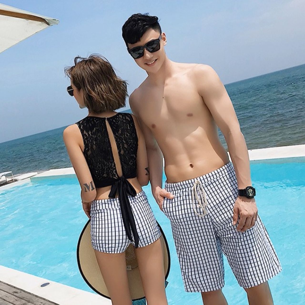 ペアルック スプリット3点セット水着 爽やかデザイン 温泉旅行にも◎