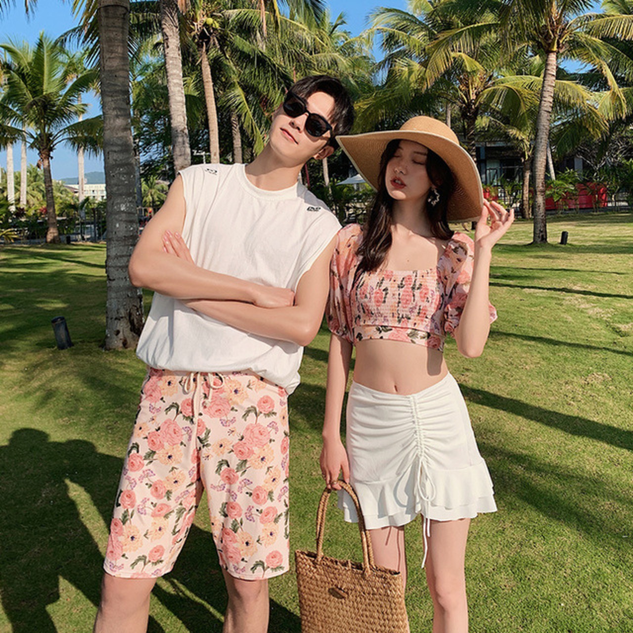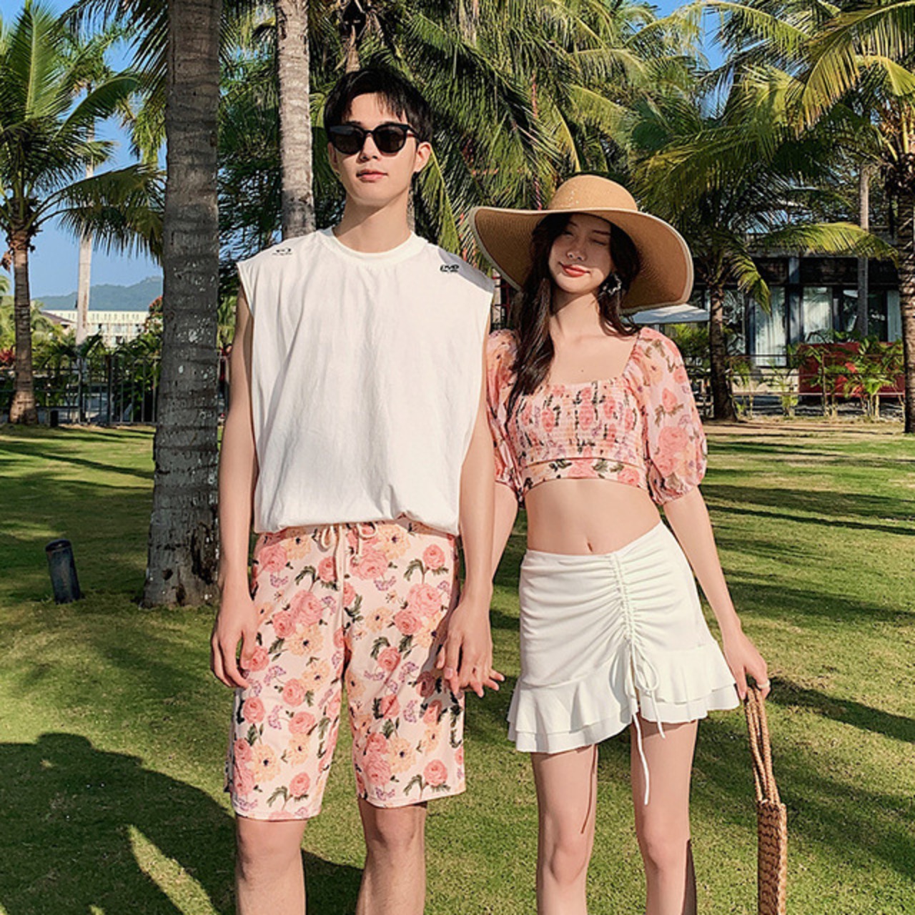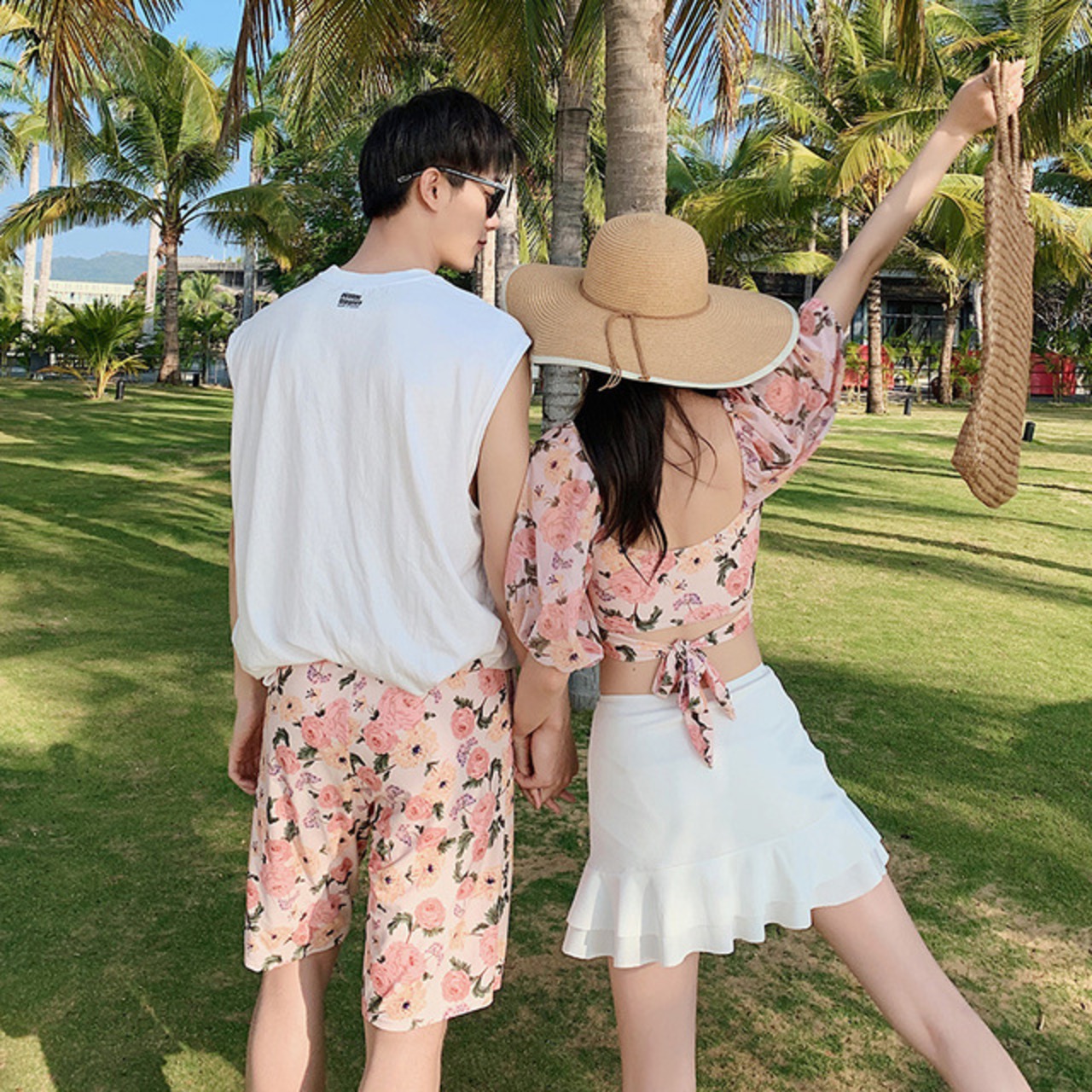 優しいピンクの色合いにフラワープリントが映えるペアルック水着です。ふんわりと咲く花柄が夏の日差しにぴったりで、ビーチやプール、リゾート地でも写真映えします。おそろいながらも個性を引き立てるデザインで、統一感のあるおしゃれなリンクコーデを楽しめます。カップルの特別な夏の思い出を彩る、上品で華やかな一着です。