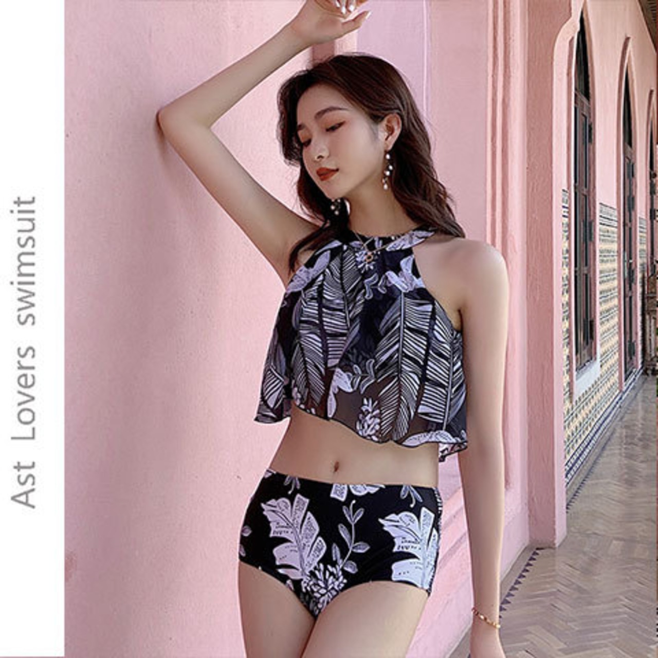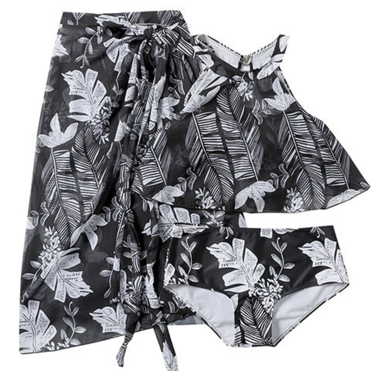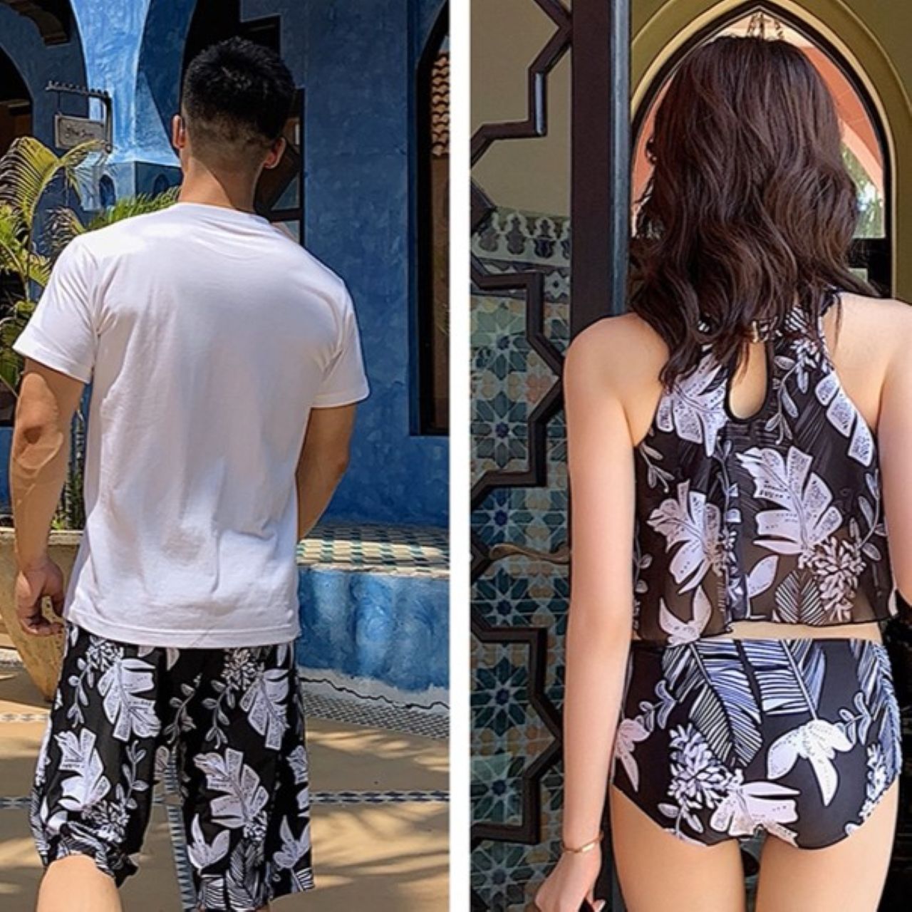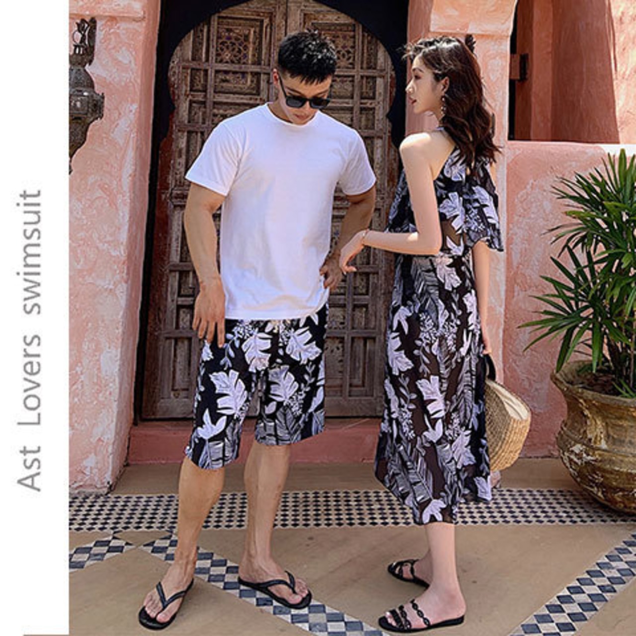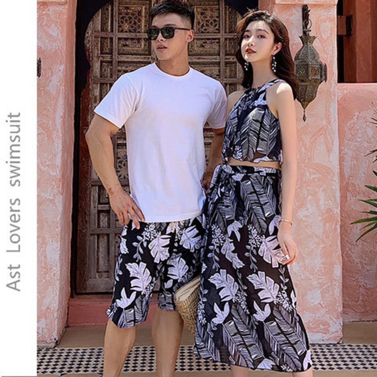 モノトーンに映えるリーフ柄が、洗練されたリゾートスタイルを叶えるペアルック水着です。落ち着いた色合いながら存在感のあるデザインで、大人のリンクコーデを上品に演出します。ビーチやプールはもちろん、リゾートホテルや旅行先でもシックに楽しめます。