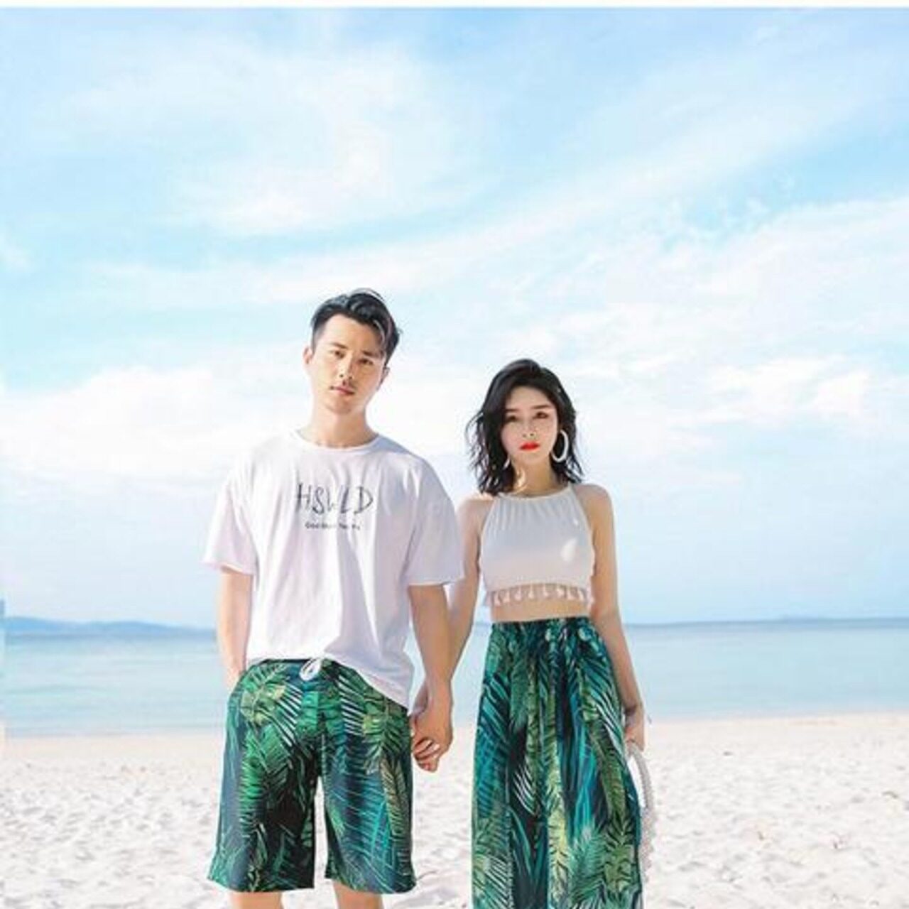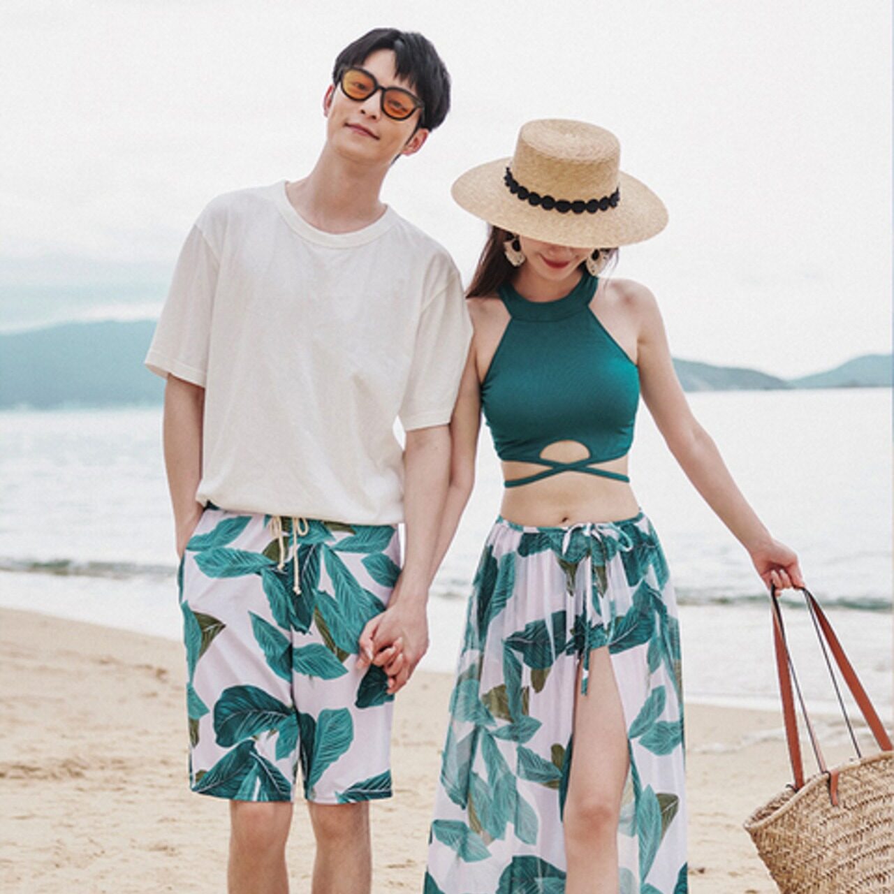 南国ムード漂うグリーンボタニカル柄のペアルック水着セットです。清涼感あふれるプリントが夏らしさを引き立て、リゾートやビーチ、プールサイドで映えるデザイン。爽やかにリンクコーデを楽しみながら、ふたりの夏の思い出を彩ります。