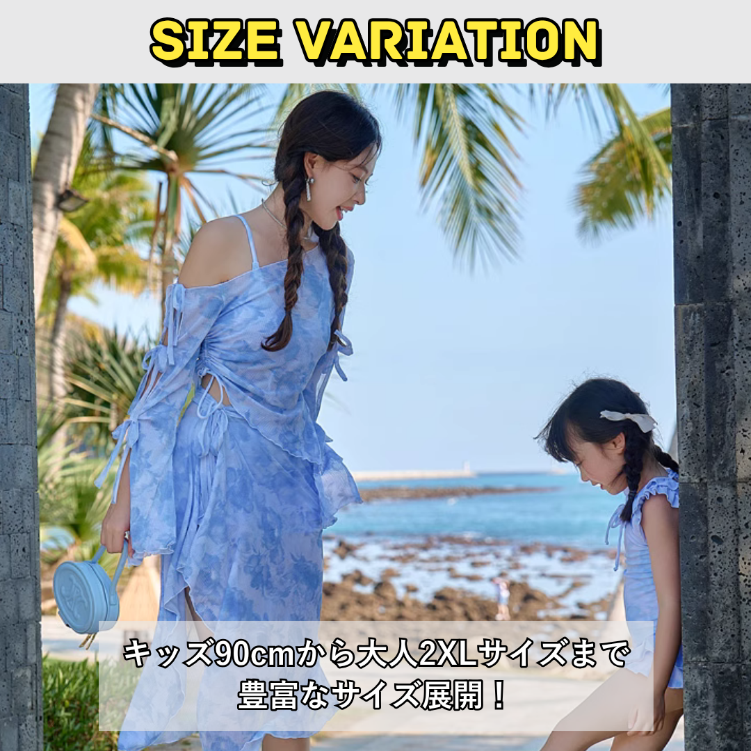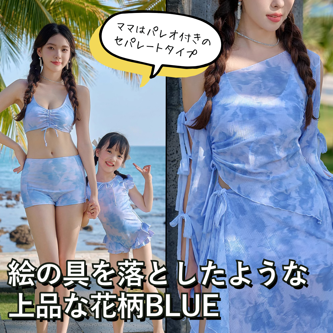 この夏を彩る爽やかな水彩フラワー柄の親子ペアルック水着。ママはビキニ・トップス・パレオの3点セットで自由に着こなし、お子様は動きやすく可愛いワンピースタイプ。柔らかく通気性に優れた素材で、ビーチやプールはもちろんリゾートでも快適に楽しめます。