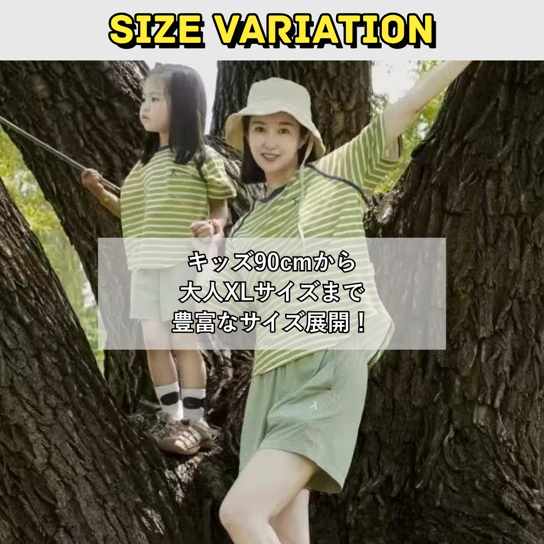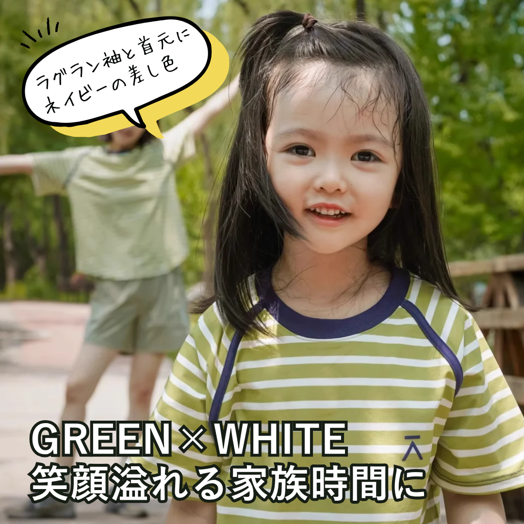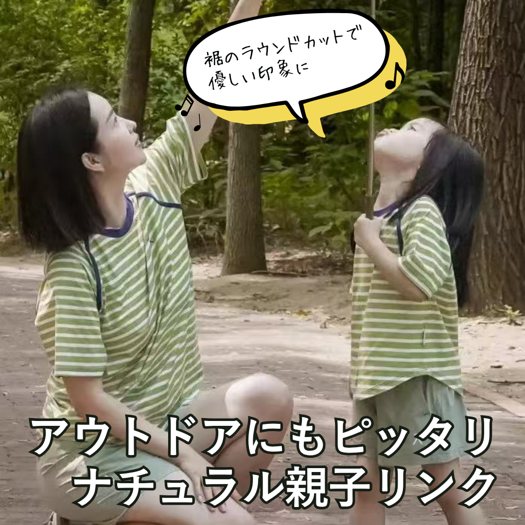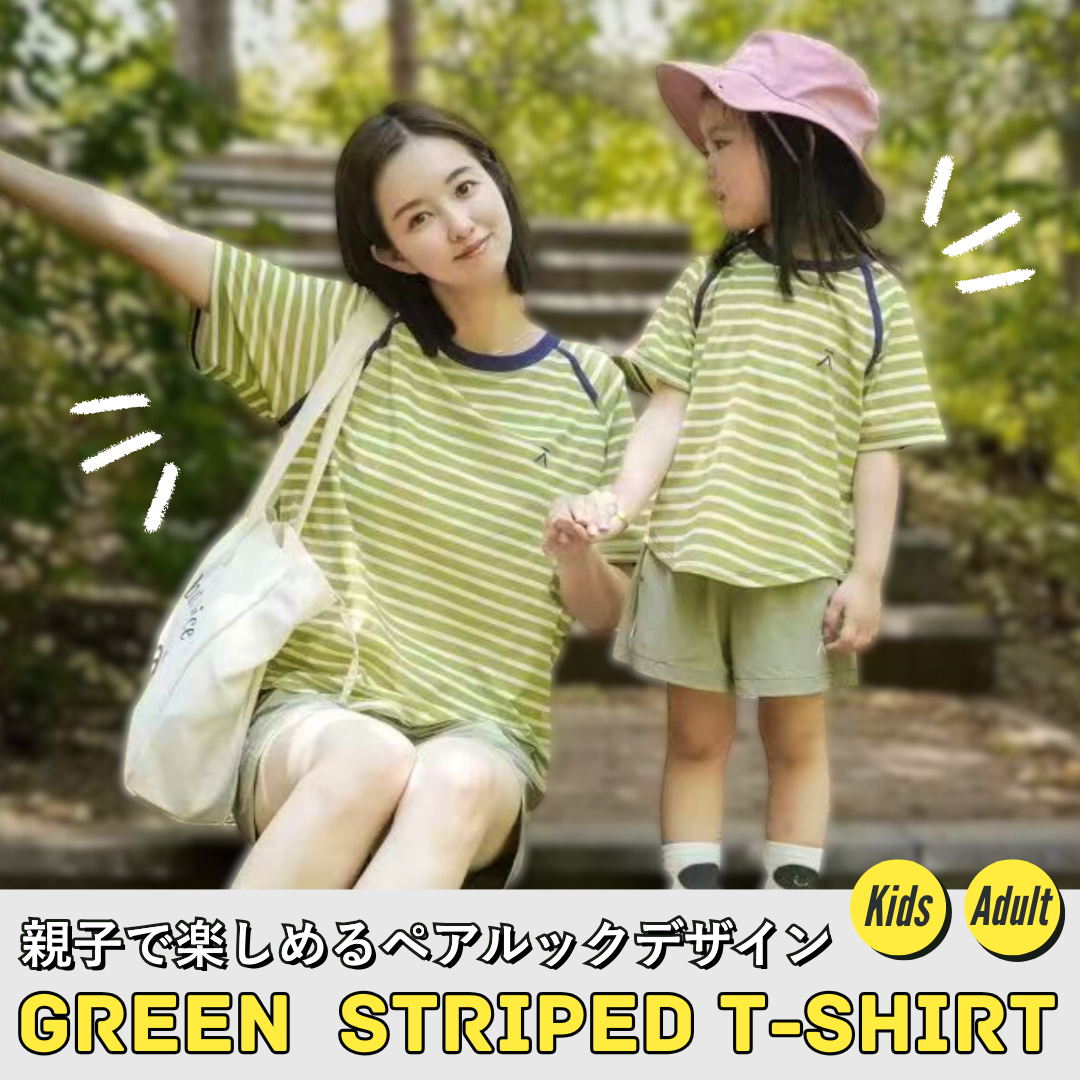 親子でリンクコーデを楽しめる爽やかなグリーンのボーダーTシャツです。ゆったりとしたシルエットと柔らかな素材で、公園遊びやアウトドア、お出かけにも最適。シンプルながらおしゃれなデザインで、普段使いはもちろん休日のお揃いコーデにもぴったりです。家族の時間を快適に、そして特別に彩る一着として活躍します。