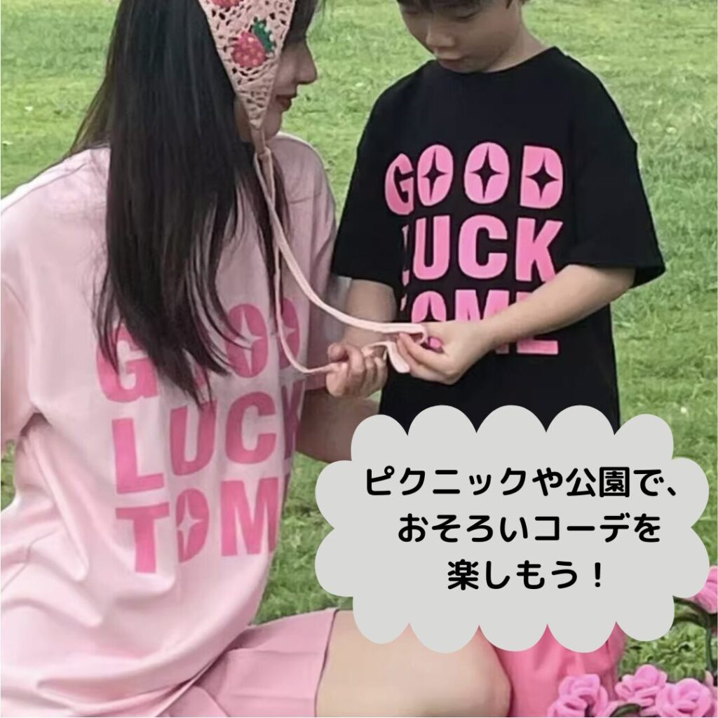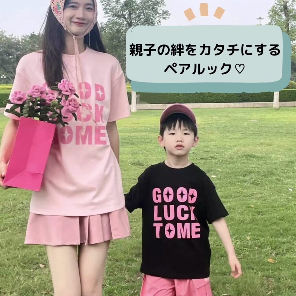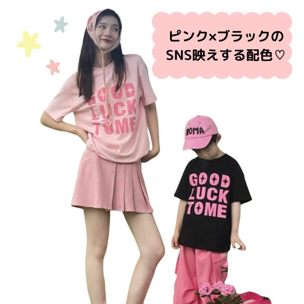 大きな「GOOD LUCK TOME」ロゴが印象的な親子ペアルックTシャツです。ピンク×ブラックの配色は写真映え抜群で、1枚でコーデの主役になる存在感があります。公園やピクニック、家族でのお出かけなど幅広いシーンで活躍し、親子のリンクコーデをよりおしゃれに楽しめます。