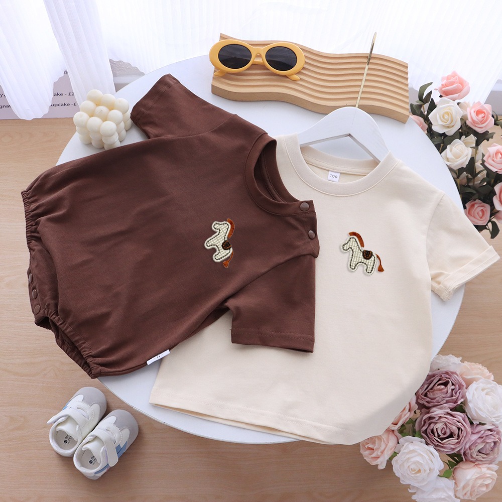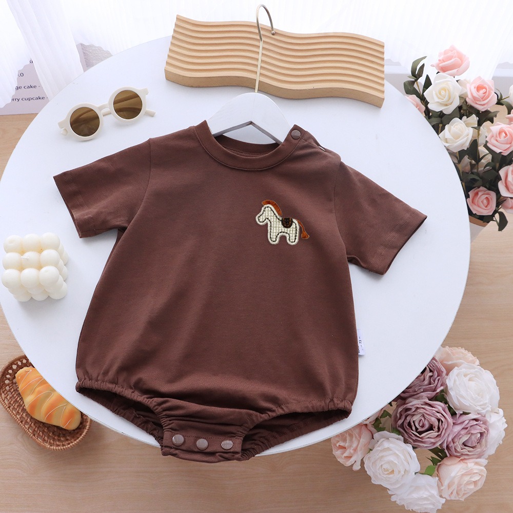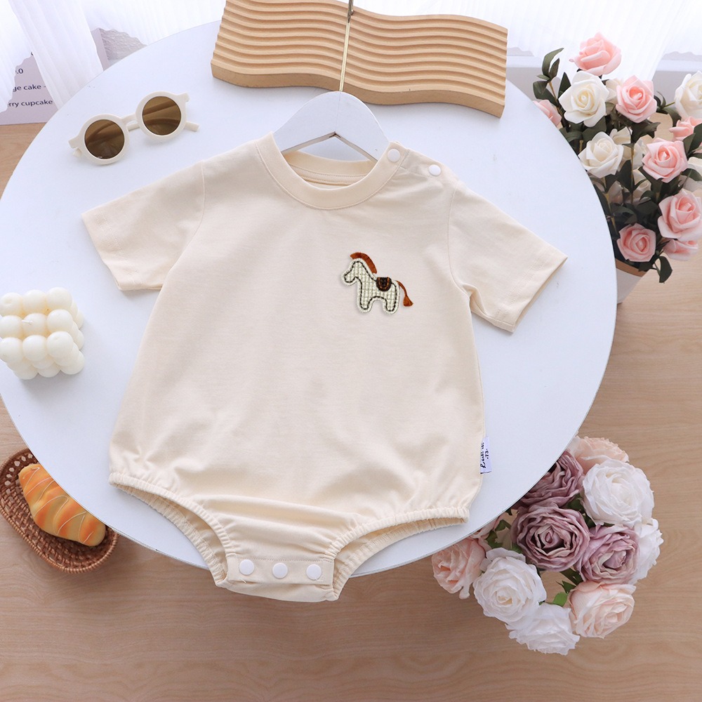 胸元には、まるで絵本から飛び出してきたような木馬のワンポイント刺繍をあしらい、さりげないアクセントに。