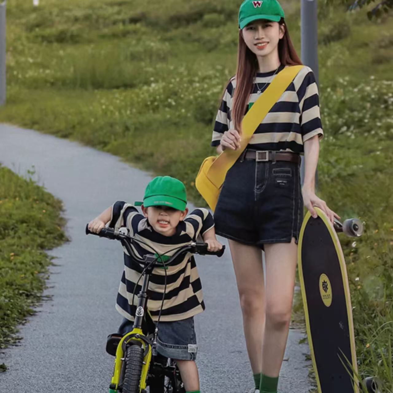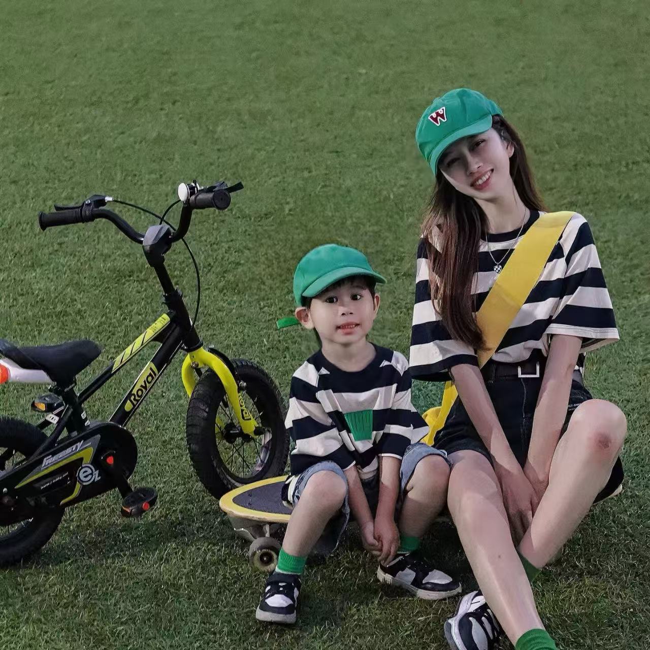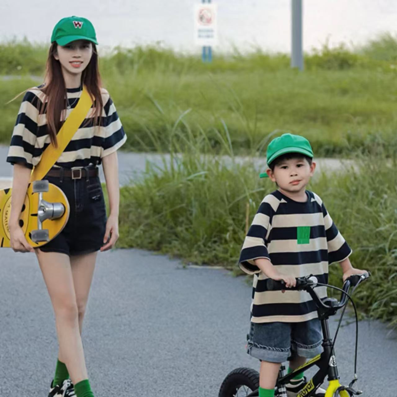 親子ペアルック【ベージュボーダー×グリーンロゴTシャツ】は、ナチュラルなボーダー柄に鮮やかなグリーンロゴが映えるおしゃれな一着です。柔らかな素材で快適な着心地を実現し、普段使いからお出かけまで幅広く活躍します。ユニセックスデザインのため親子でお揃いコーデを楽しめ、カジュアルながら家族の絆を感じさせる特別なスタイルを演出できるアイテムです。