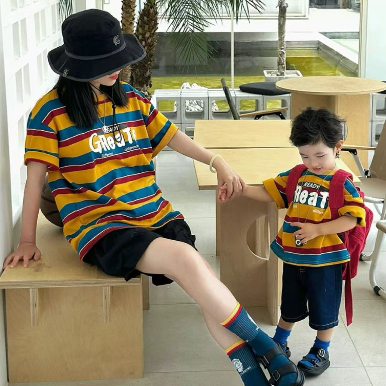 親子ペアルック【ロゴ×ボーダーおしゃれ配色Tシャツ】は、トレンド感のあるボーダー柄とロゴデザインが魅力の一着です。柔らかな素材で快適な着心地を実現し、日常から特別なお出かけまで幅広く活躍します。ユニセックスデザインのため、親子でお揃いコーデを楽しめるのもポイントです。シンプルながら遊び心のある配色が、家族の絆を感じさせるスタイルを演出します。