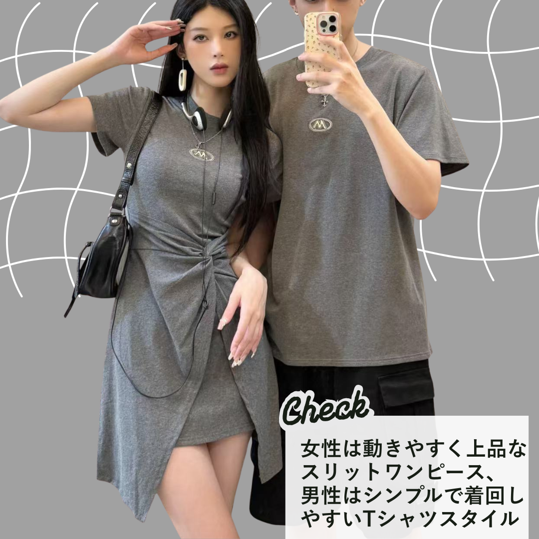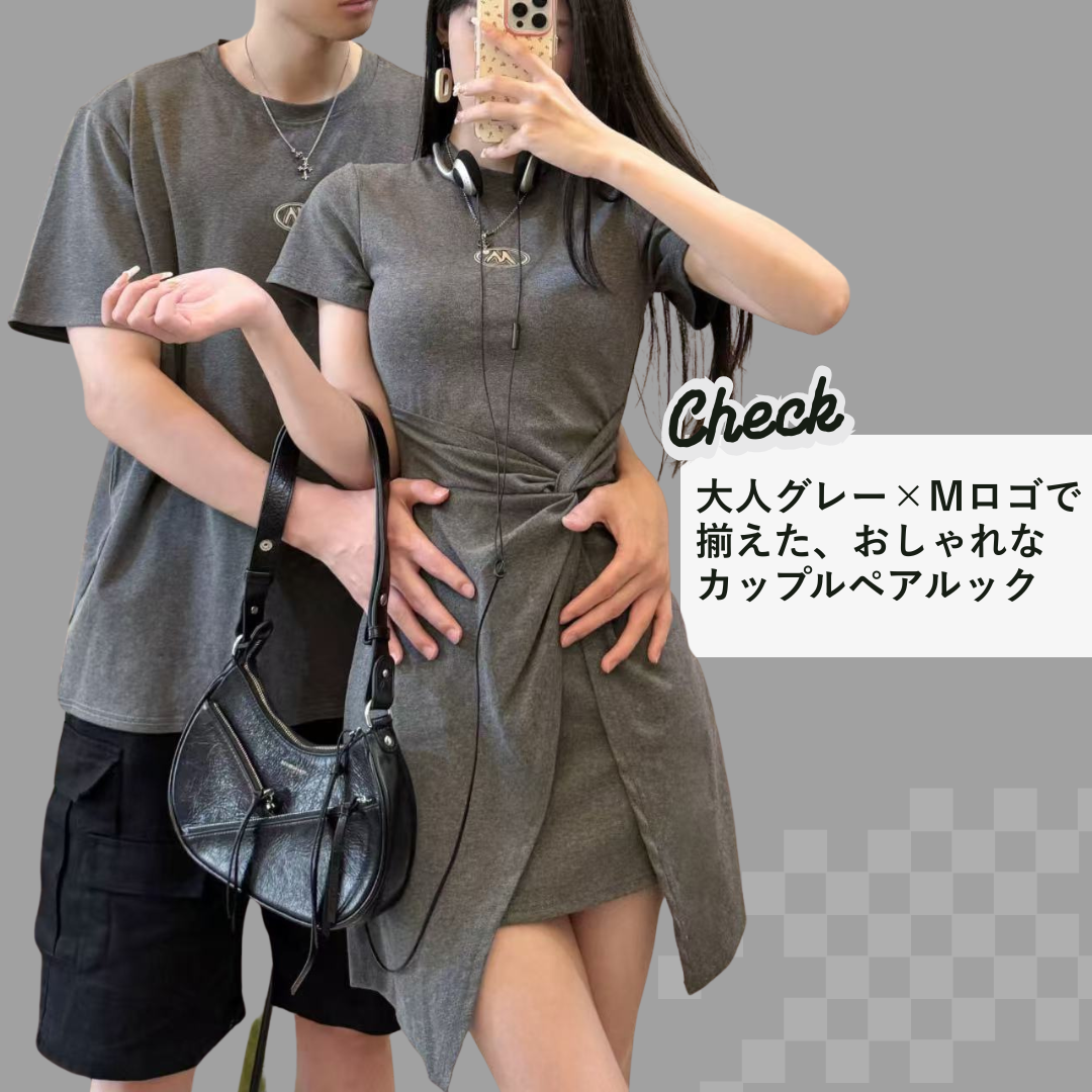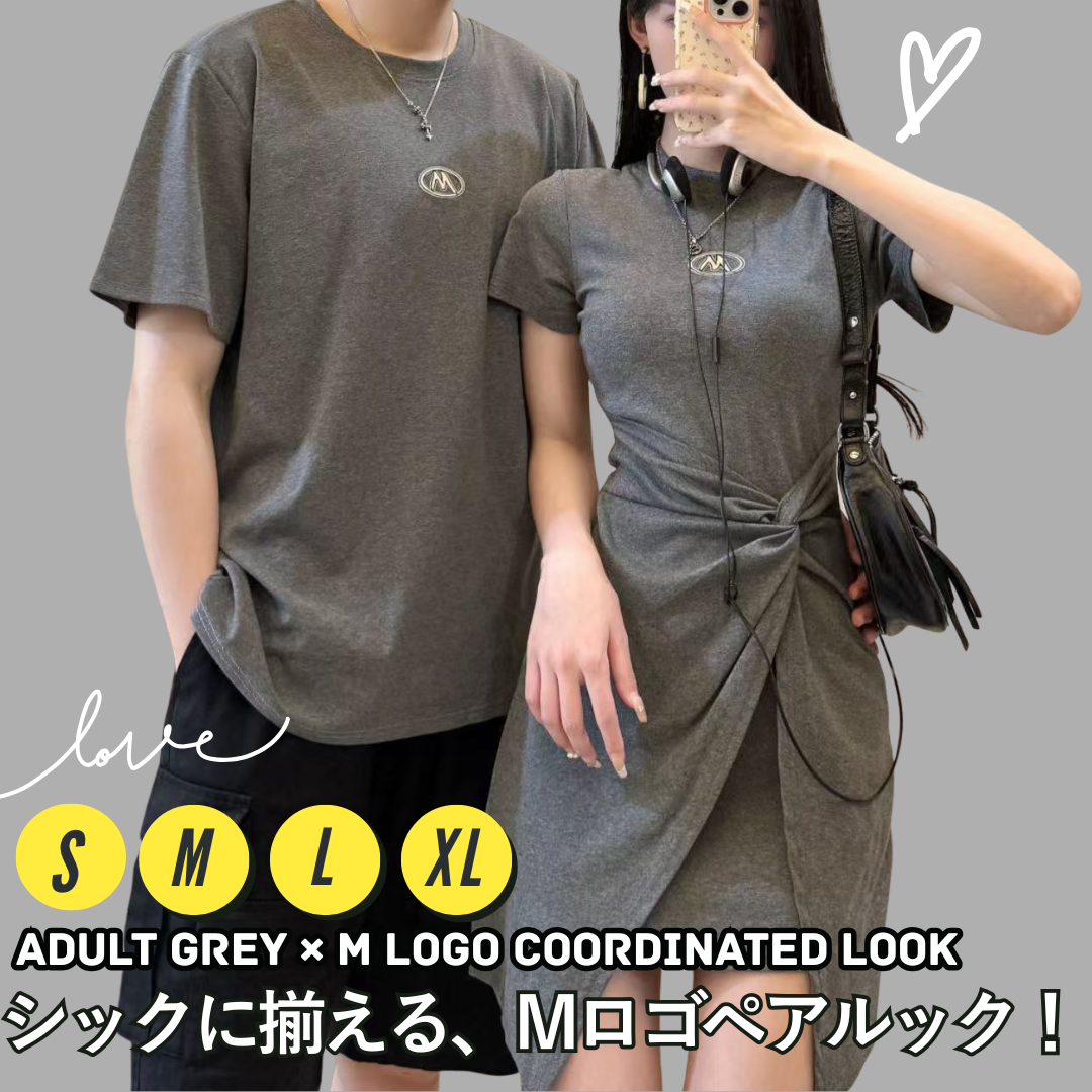 カップルペアルック 大人グレー×Mロゴのリンクコーデ|スリットワンピース&Tシャツ